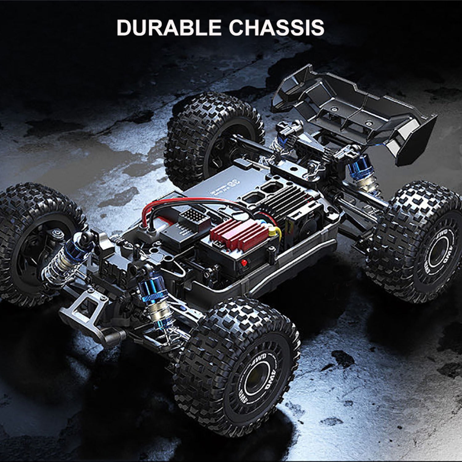 1. All-metal hydraulic shock absorber; 2. Standard 2S battery 45km/h,Support 3S battery,max speed upto 68km/h 3. 45A independent brushless ESC + 2845 4200KV four-pole brushless motor; 4. Metal anti-collision head; 5. All-metal transmission system (metal gear differential); 6. Standard independent receiver, easy to modify.