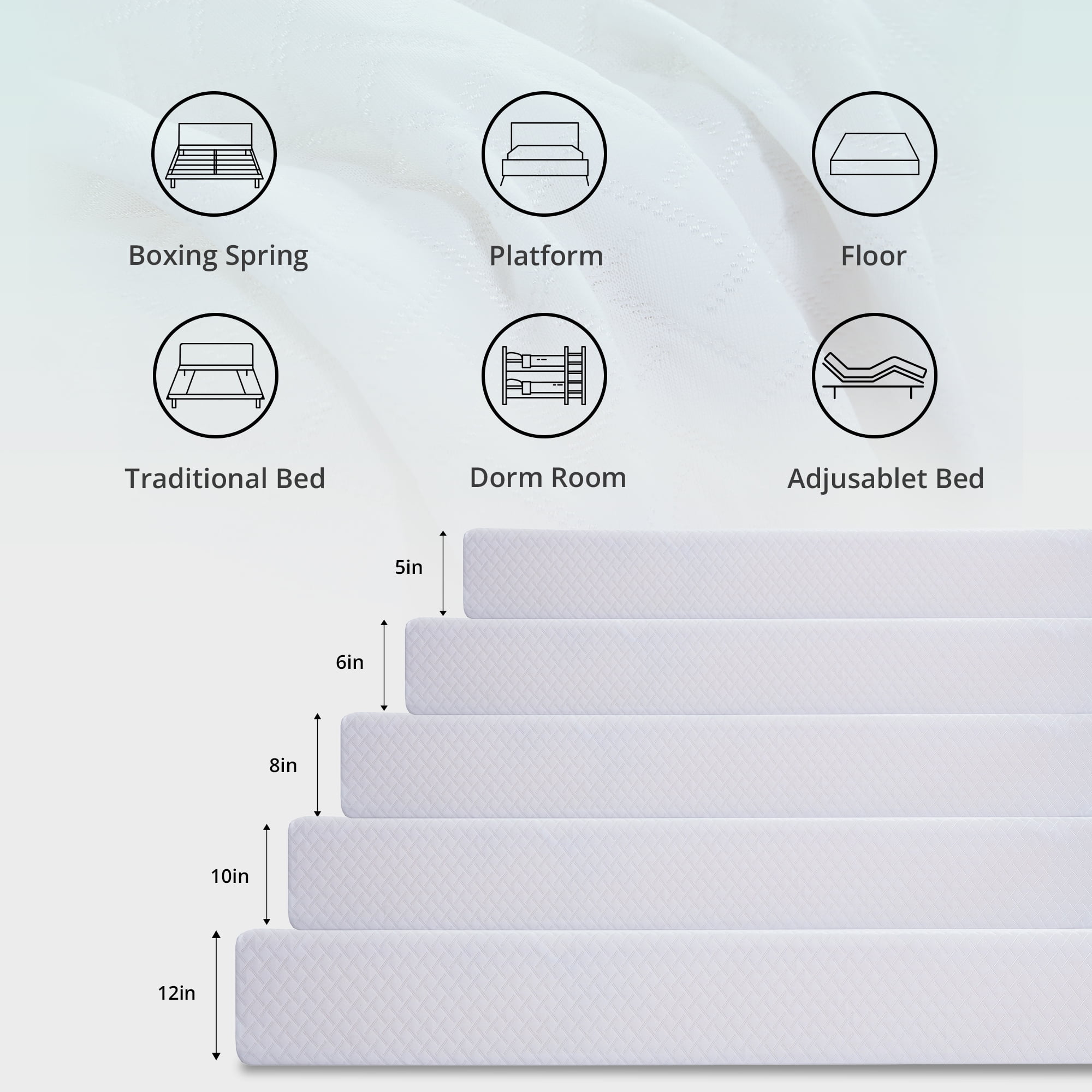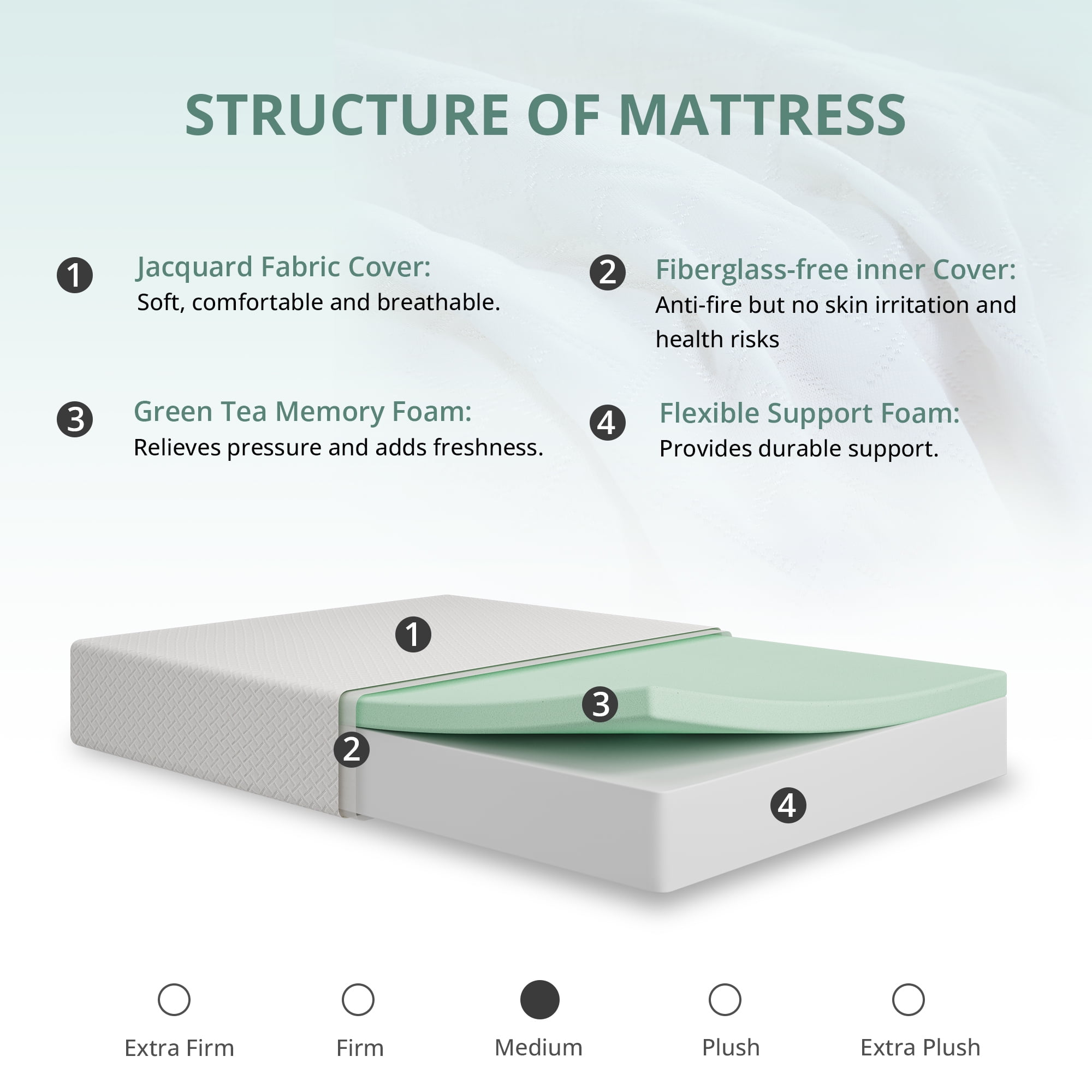Mattress Size: Twin Mattress Type: Green tea infused memory foam for a fresh and calm sleep environment Mattress Profile: 5 inches Comfort Level: Medium Firm Certified Safe and Non-Toxic: CertiPUR-US and OEKO-TEX certified Universal Compatibility: Fits all bed frames, bases, bunk beds, and adjustable beds Twin Mattress: 75 x 38 x 5 inches – 250 lb maximum weight capacity Memory Foam Mattress Highlights: Breathable, Edge Support, Pressure Relief, Low Motion Transfer Mattress in a box for easy setup: let the mattress expand for 48 to 72 hours Perfect for main bedrooms, secondary bedrooms, and guest bedrooms
