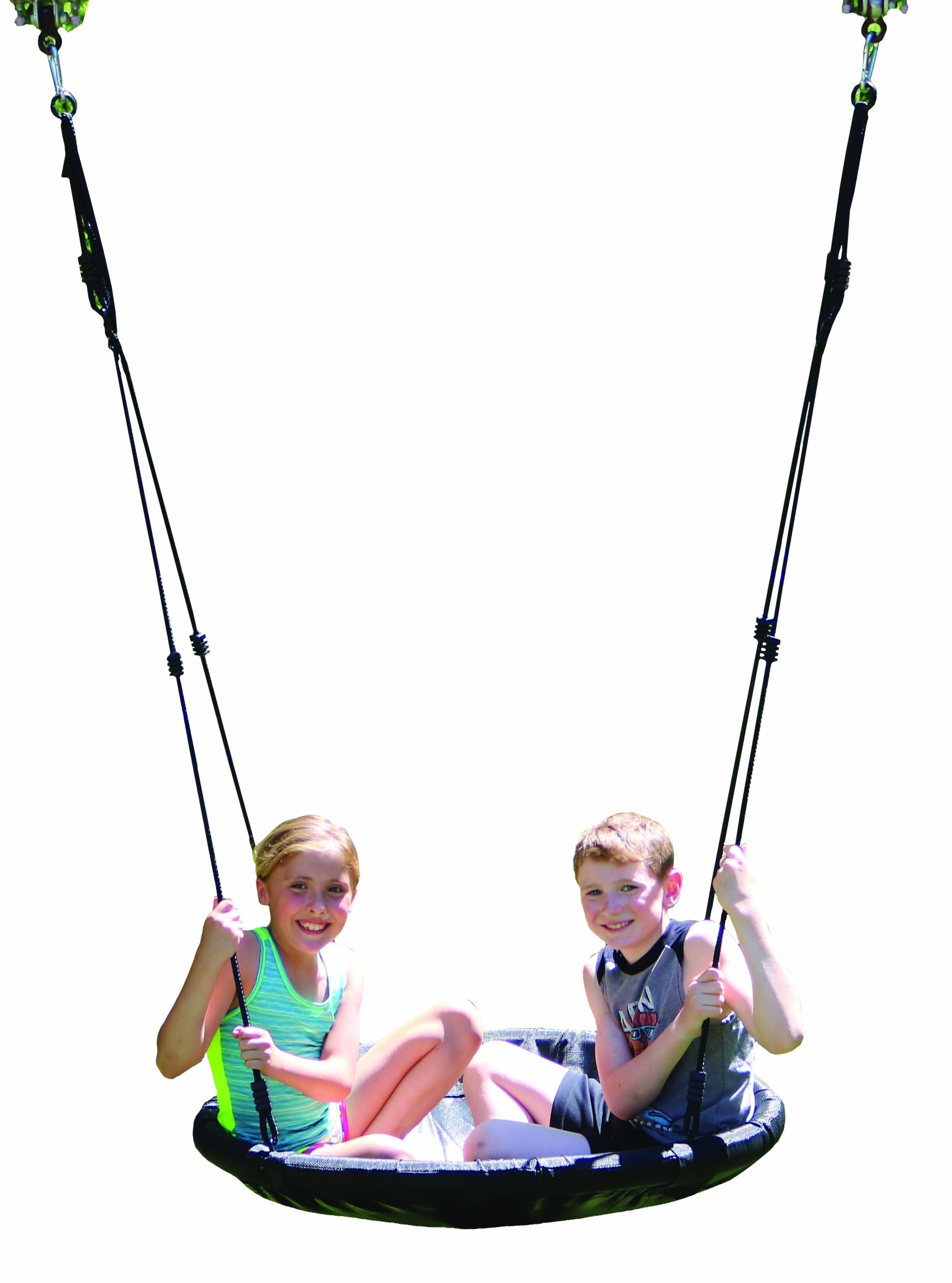 M&M Sales Enterprises Inc Adventure-MG Mat Swing Safety rated to 350 lb Rated for ages 5+ Roomy 39″ diameter UV resistant outdoor fabric seating Dense foam covered steel tube construction Strong enough to hold multiple riders Simply assembly and easy installation with adjustable hanging ropes Two swinging methods: two points for linear motion and a single point for merry-go-round swinging and spinning Hanging height of 68″