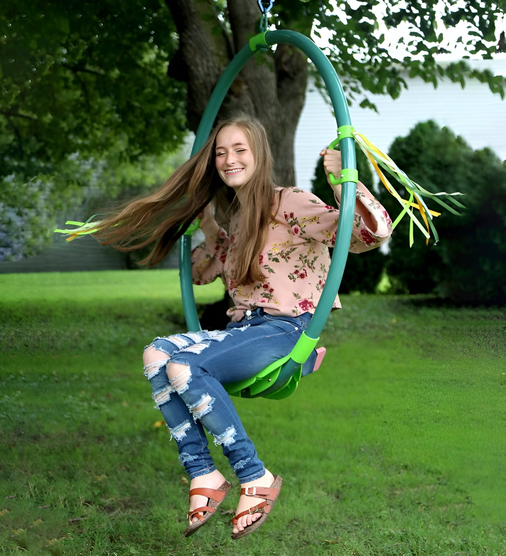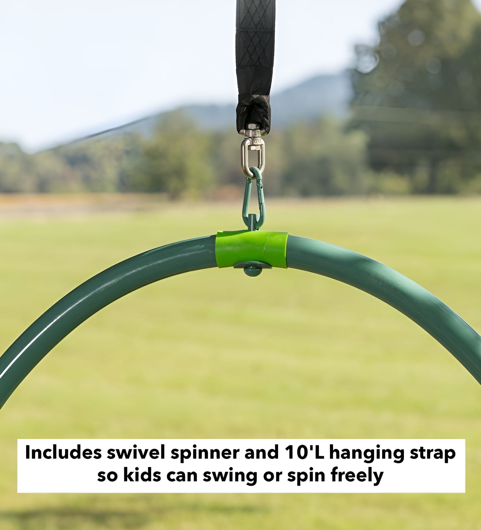 M&M Sales Enterprises Inc Hoopla Ring Swing: Safety rated to 150 lb Rated for ages 5+ Heavy-duty powder-coated steel swing frame Resin contoured seat Easy-grip handles Colorful streamers Comes with stainless steel swivel spinner and 10′ tree strap US Pat. 10456693