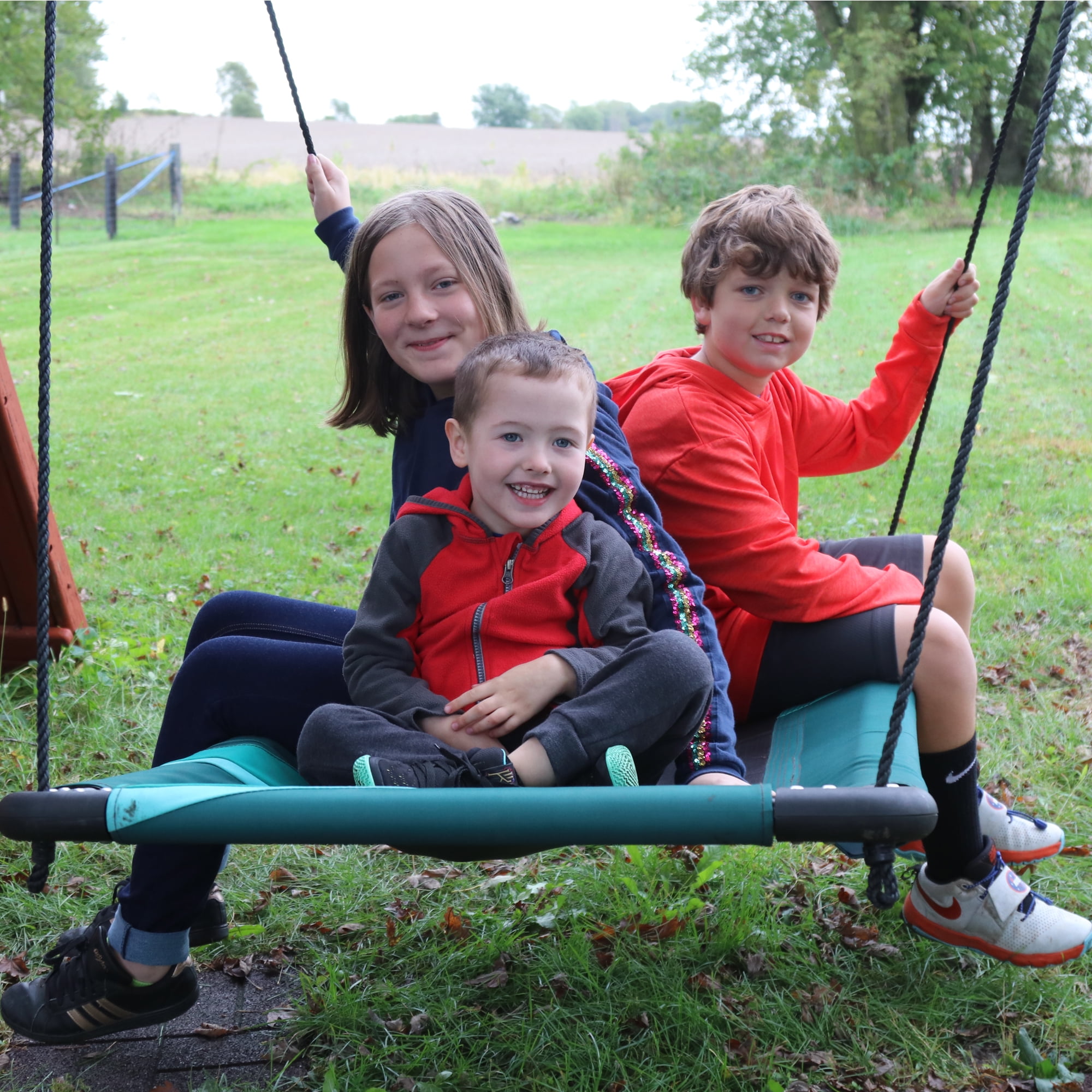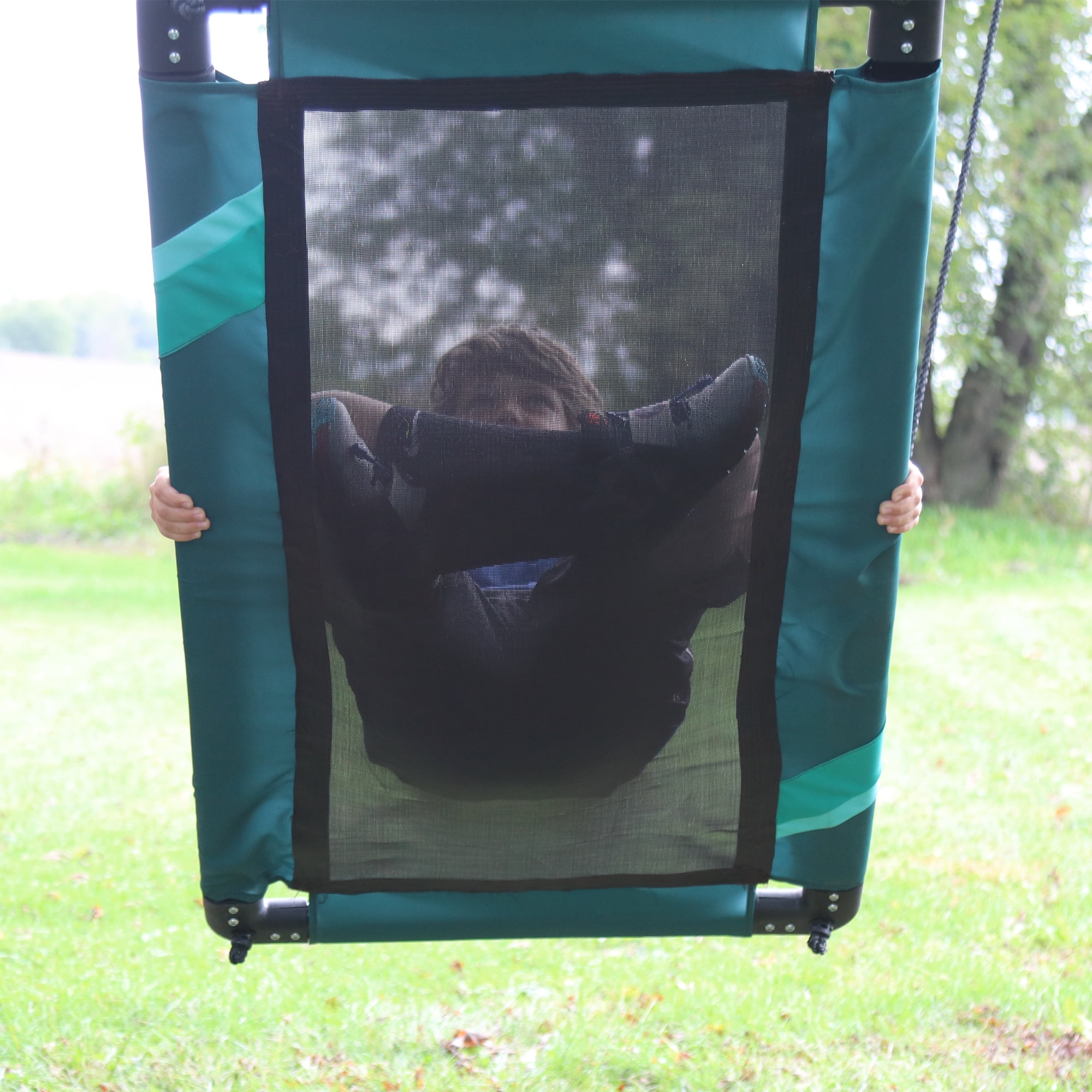 M&M Sales Enterprises Inc Rainbow Gliderz Stripe Mat Swing 60″ Safety rated to 400 lb Rated for ages 5+ 600D Polyester /Textilene mat Heavy-duty 4 pc padded steel frame w/ custom-molded corner braces UV treated adjustable poly ropes Simple attachment 4? monster steel spring clips Well-stitched and attractively designed Available in two other styles: Chevron (47.25″) and Horizon (47.25″)