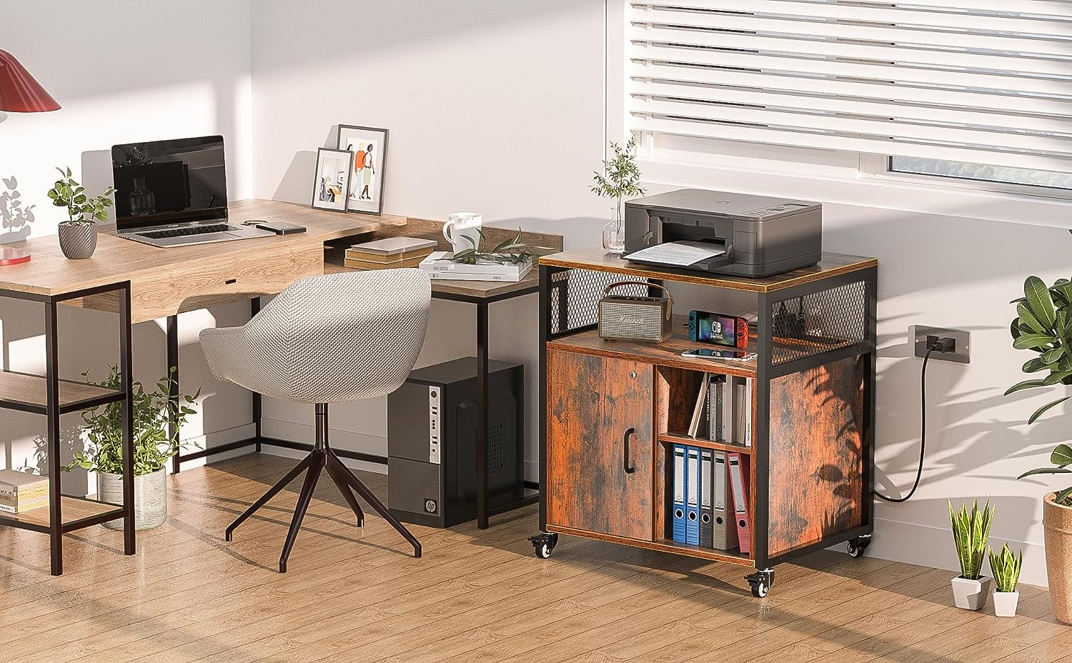 Equipped with 3 outlets and 2 USB charging ports to facilitate rapid charging for your printers, scanners, phones, tablets, and other electronic devices, streamlining your office setup and keeping your workspace organized and efficient. Features 2 braking wheel casters that allow you to effortlessly and noiselessly transition files and printer equipment, while the lockable wheels ensure stable positioning beside or beneath your desk, preventing unwarranted movement and safeguarding your business essentials. Includes a practical lockable door that elevates office security and organization, allowing you to customize the shelf heights to accommodate binders, folders, books, or decorative items, offering versatile storage solutions for your workspace. Offers expansive storage room for your printer, plants, A4, letter, and legal-size files, as well as office machines and supplies, seamlessly adapting to the demands of your workflow and keeping your essentials organized and easily accessible. Boasts a robust construction, combining MDF board and a rugged premium metal frame, guaranteeing durability to support up to 50 lbs of weight, and ensuring effortless setup with comprehensive instructions for a hassle-free assembly process.
