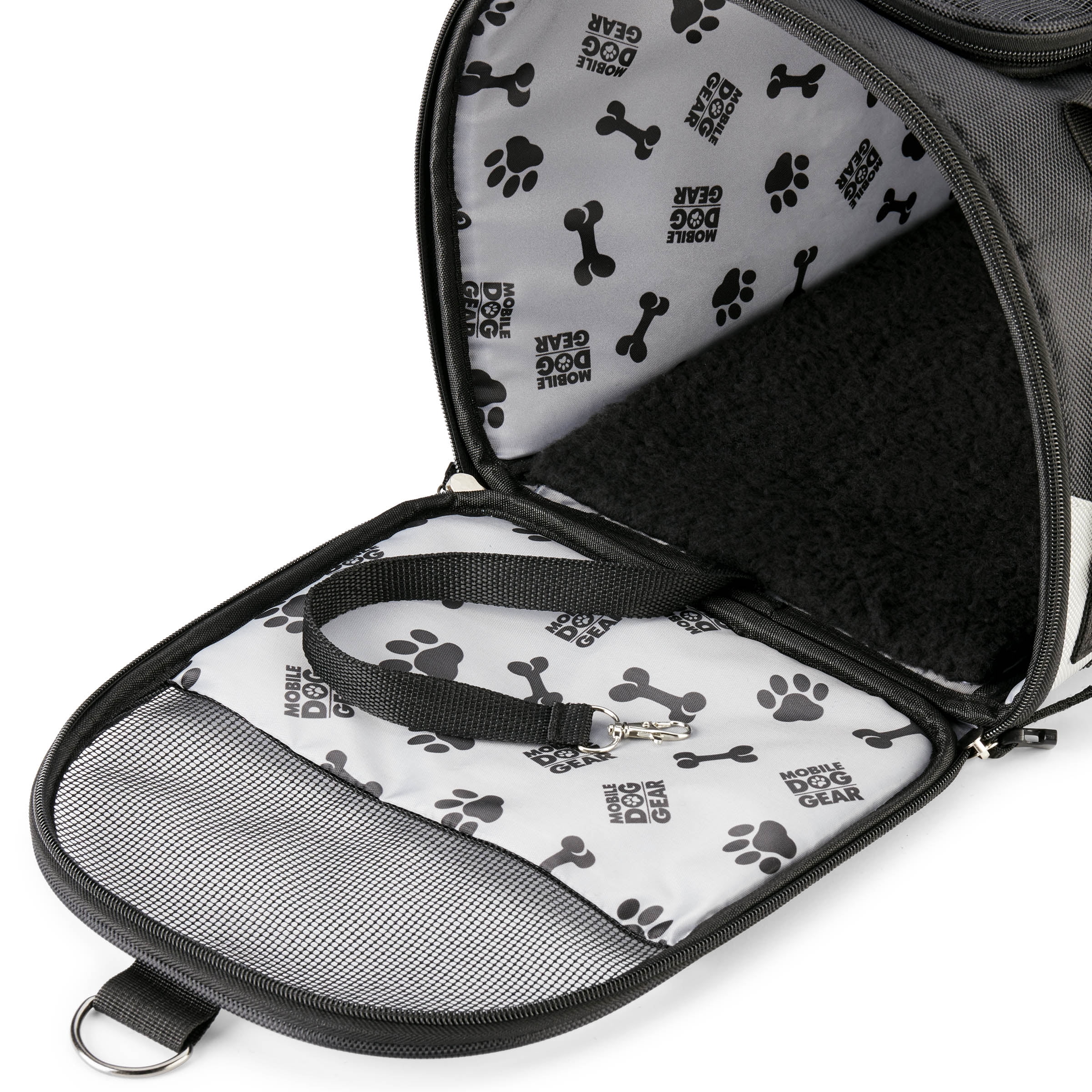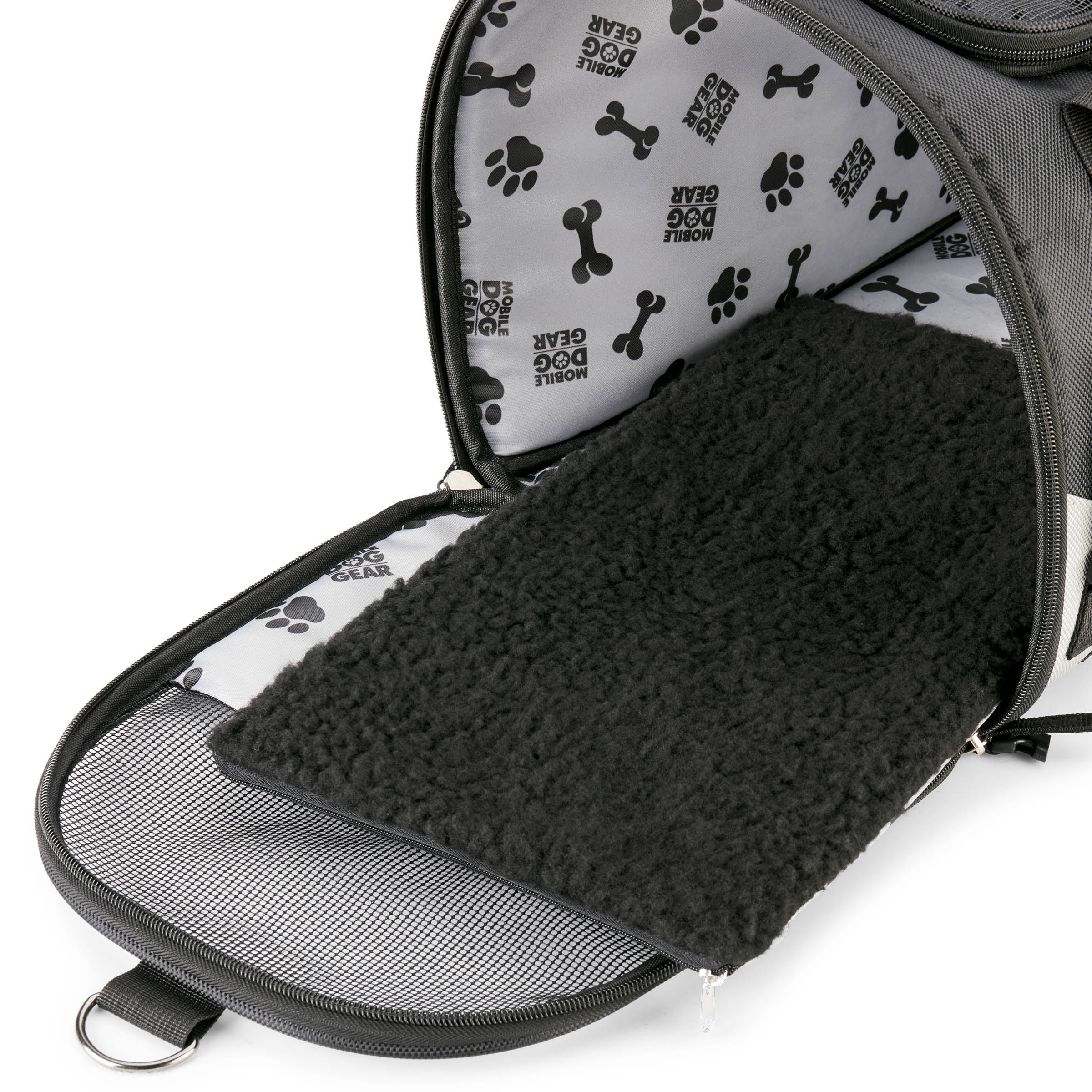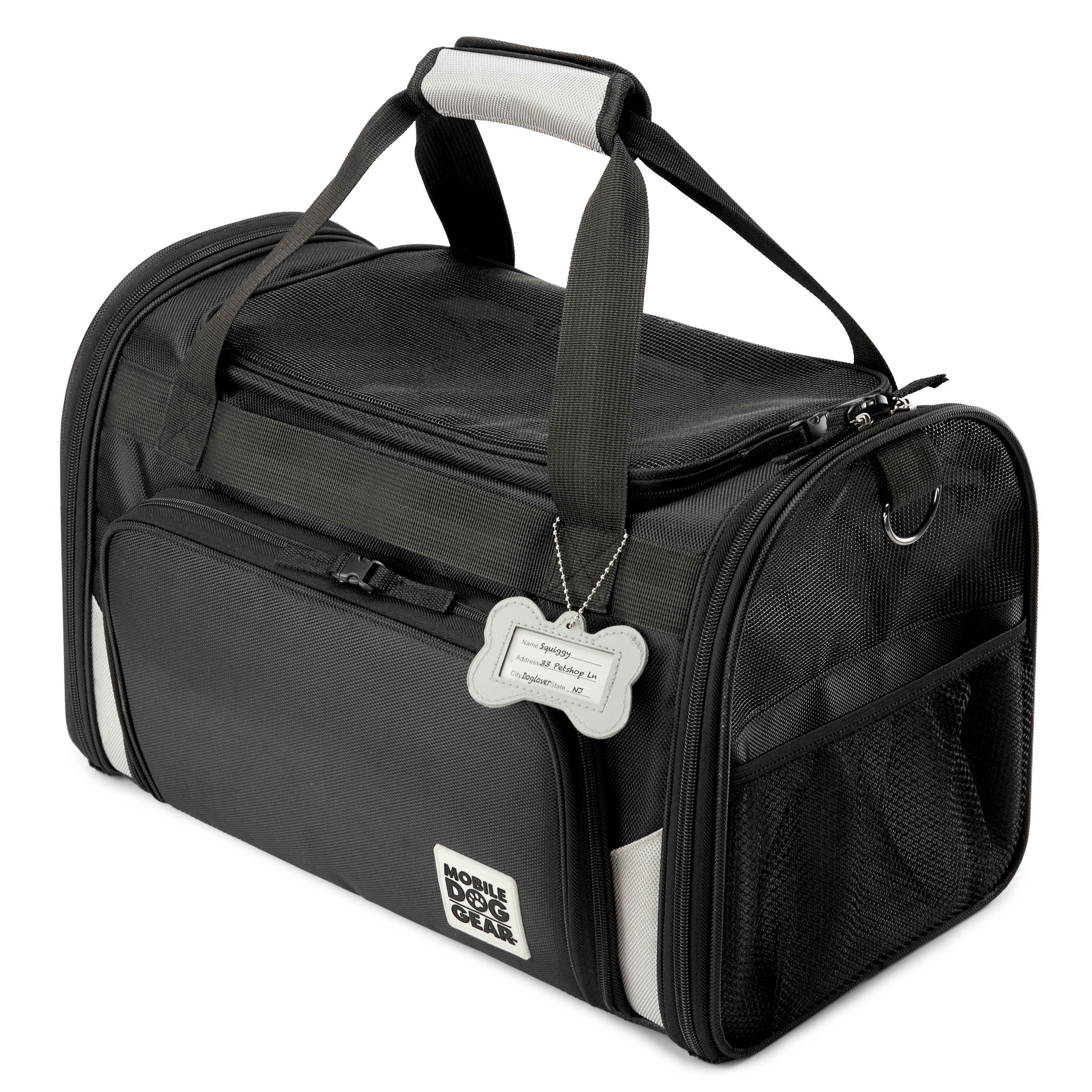 Mobile dog gear pet carrier plus allows you to travel with your dog with ease as it not only keeps your dog safe but comes with our patent pending feeding system. (Two lined food/treat carriers, two collapsible silicone bowls, and removable placemat) The ballistic fabric exterior with breathable mesh for ventilation on the top and three sides is not only stylish but more importantly, extremely safe and durable for carrying your furry best friend. There is a waterproof bottom with rubber feet to make sure you can place this bag comfortably on any surface. There are locking zippers on all entries and front access to comfort your pet. The interior of the bag was designed strictly with your dog’s comfort in mind. It is fully padded and contains a removable padded bottom that contains a machine washable liner. Your furry friend will never complain of discomfort in this bag. Tons of pockets to hold everything you need. There are mesh pockets on two sides as well as a zippered pocket on a third side with another mesh pocket in it.