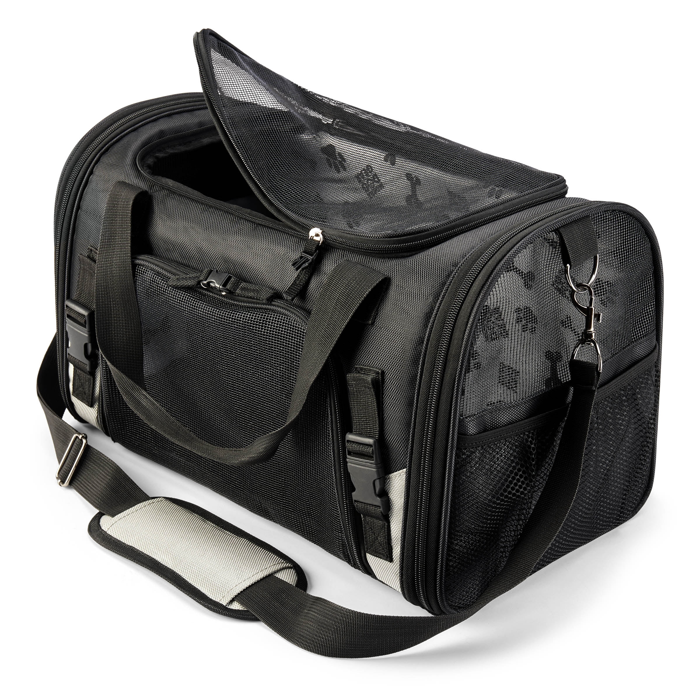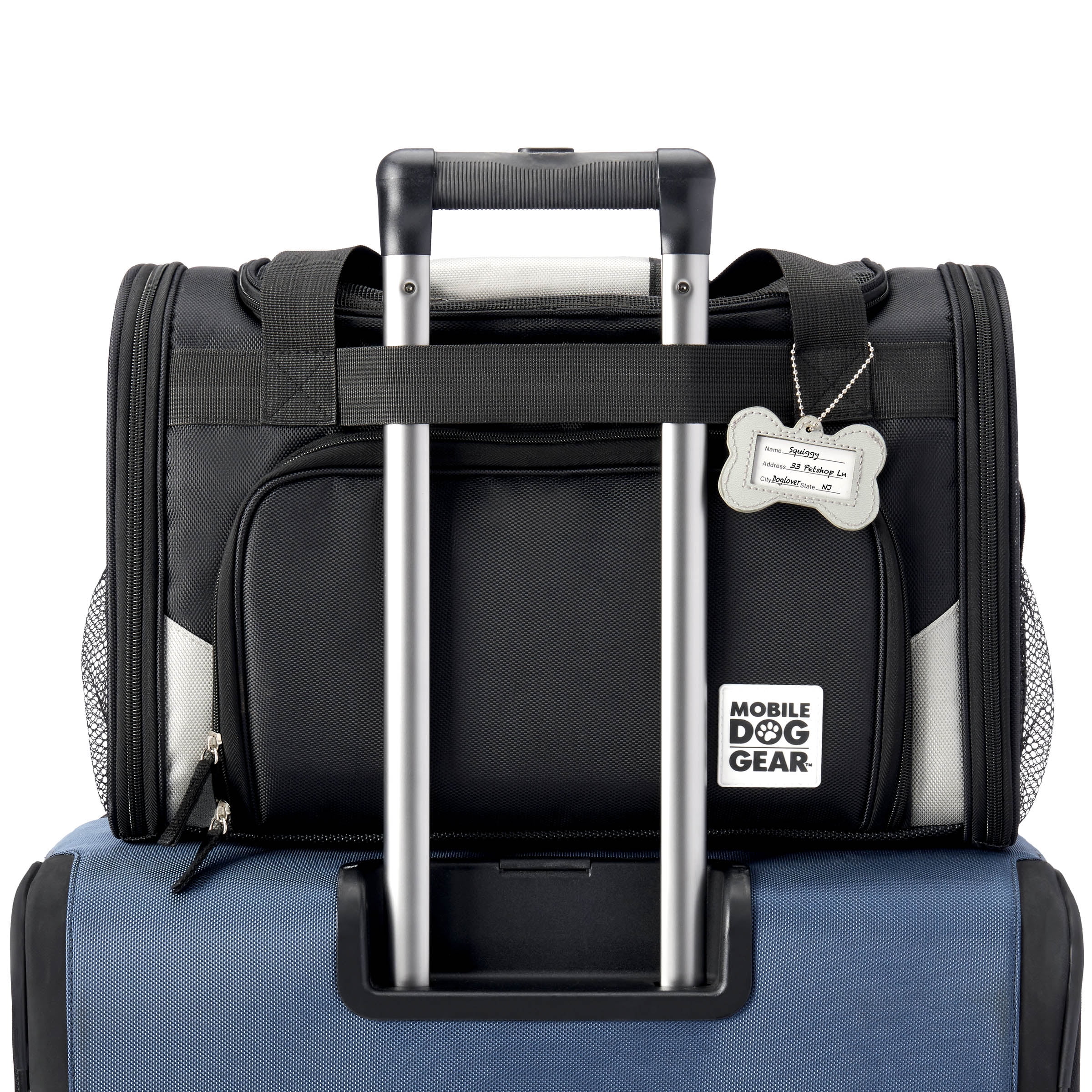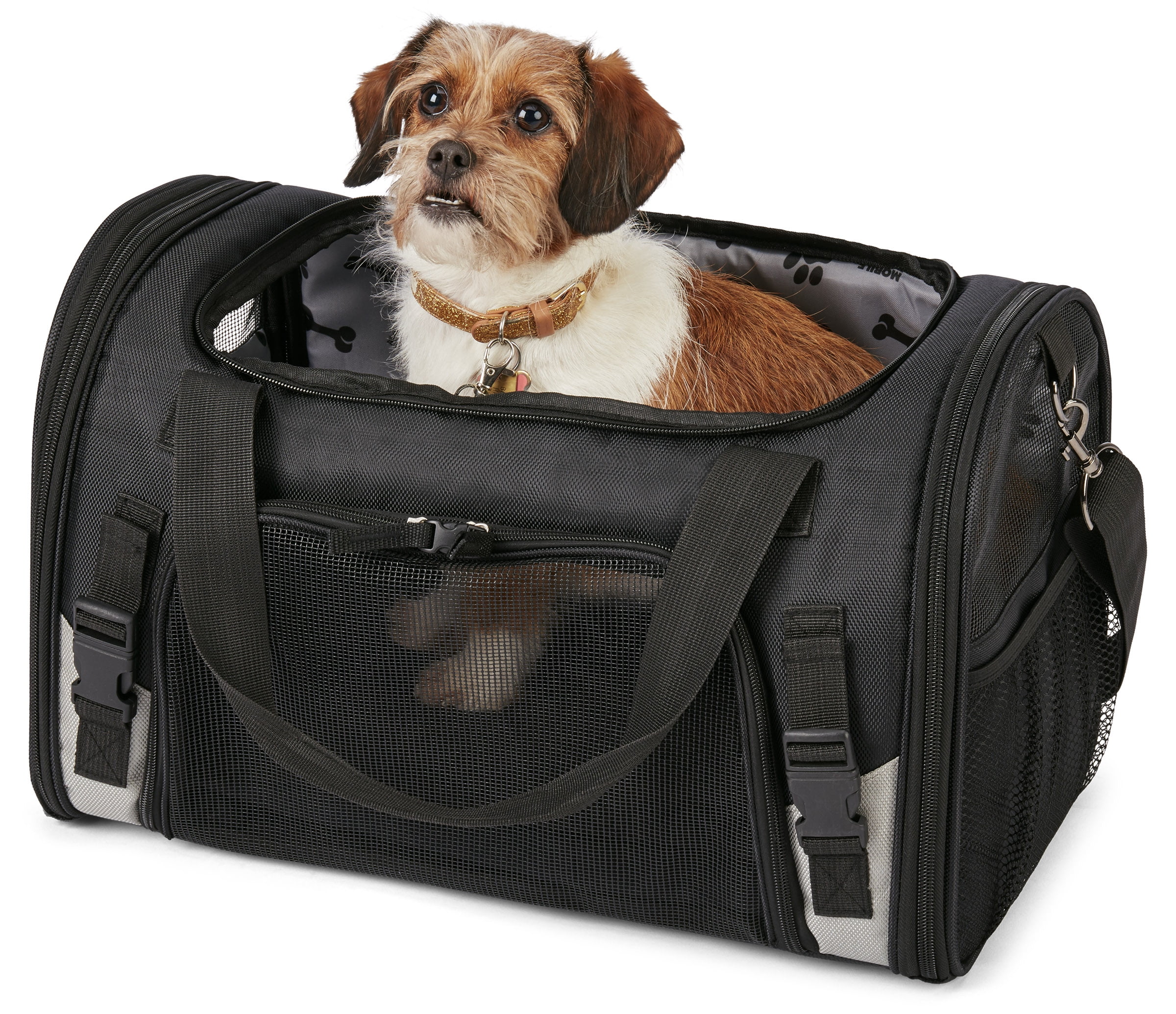 Mobile dog gear pet carrier plus allows you to travel with your dog with ease as it not only keeps your dog safe but comes with our patent pending feeding system. (Two lined food/treat carriers, two collapsible silicone bowls, and removable placemat) The ballistic fabric exterior with breathable mesh for ventilation on the top and three sides is not only stylish but more importantly, extremely safe and durable for carrying your furry best friend. There is a waterproof bottom with rubber feet to make sure you can place this bag comfortably on any surface. There are locking zippers on all entries and front access to comfort your pet. The interior of the bag was designed strictly with your dog’s comfort in mind. It is fully padded and contains a removable padded bottom that contains a machine washable liner. Your furry friend will never complain of discomfort in this bag. Tons of pockets to hold everything you need. There are mesh pockets on two sides as well as a zippered pocket on a third side with another mesh pocket in it.