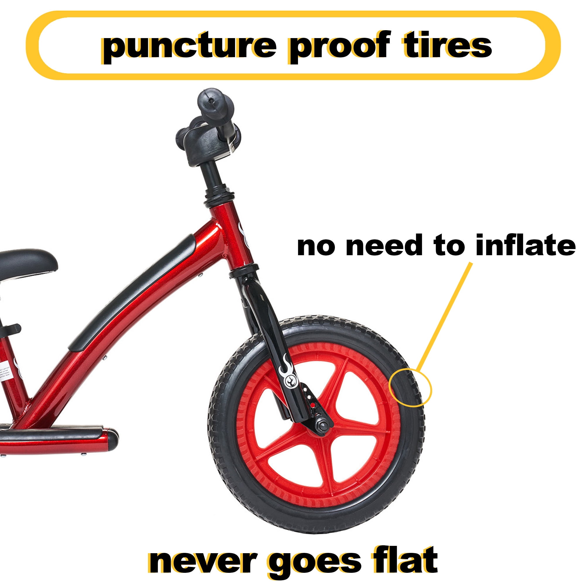 Adjustable seat (and 2 seat posts) fits kids with inseams from 11 to 20-inches. Typically fits kids 2 year old up to 6 year old Comes with both short and long seat posts and adjustable handlebars. Beginning riders can simply rest their feet and get the feel of riding a no-pedal bike. While more advanced riders can use multiple footrest positions to start learning glide bike tricks. Durable never-flat tires don’t require inflation and will never go flat. Thick foam seat covered with real stitched fabric keeps your child comfortable– not an inexpensive machine-pressed foam seat like other balancing bikes. Comes with the 12” balance bike wheels securely attached. Just slide the seat and handlebars into position and tighten with the provided wrench. Safe, durable, yet easy and fun to ride balance bicycle for kids Specifications: Colors: Red/Pink/Blue/Green Dimension: 35 x 15 x 21 inches Frame Material: Foam, Metal, Rubber Product Weight: 12.97 lbs Weight Capacity: Up to 60lbs Recommended Age: 2 – 6 years old Steering Mechanism: Rear Steering Handlebars Hub: Fixed -Wheel Mechanism Chain Material: Chainless Tire Type: Never Flat Tires Recommended Riding Area: Flat and Smooth Surfaces Gross Weight: 13 lbs Assembly Details: Assembly Required; Tools Provided