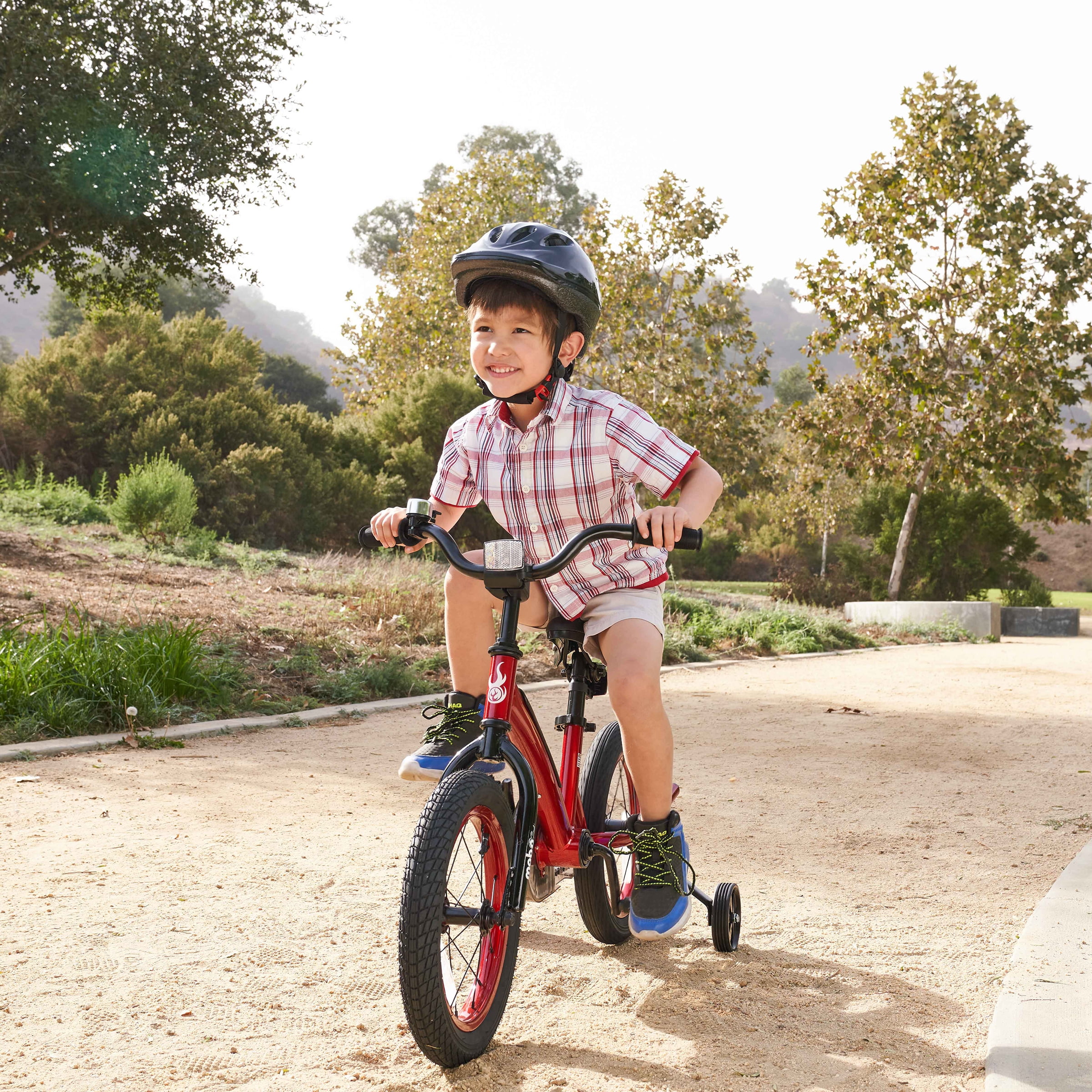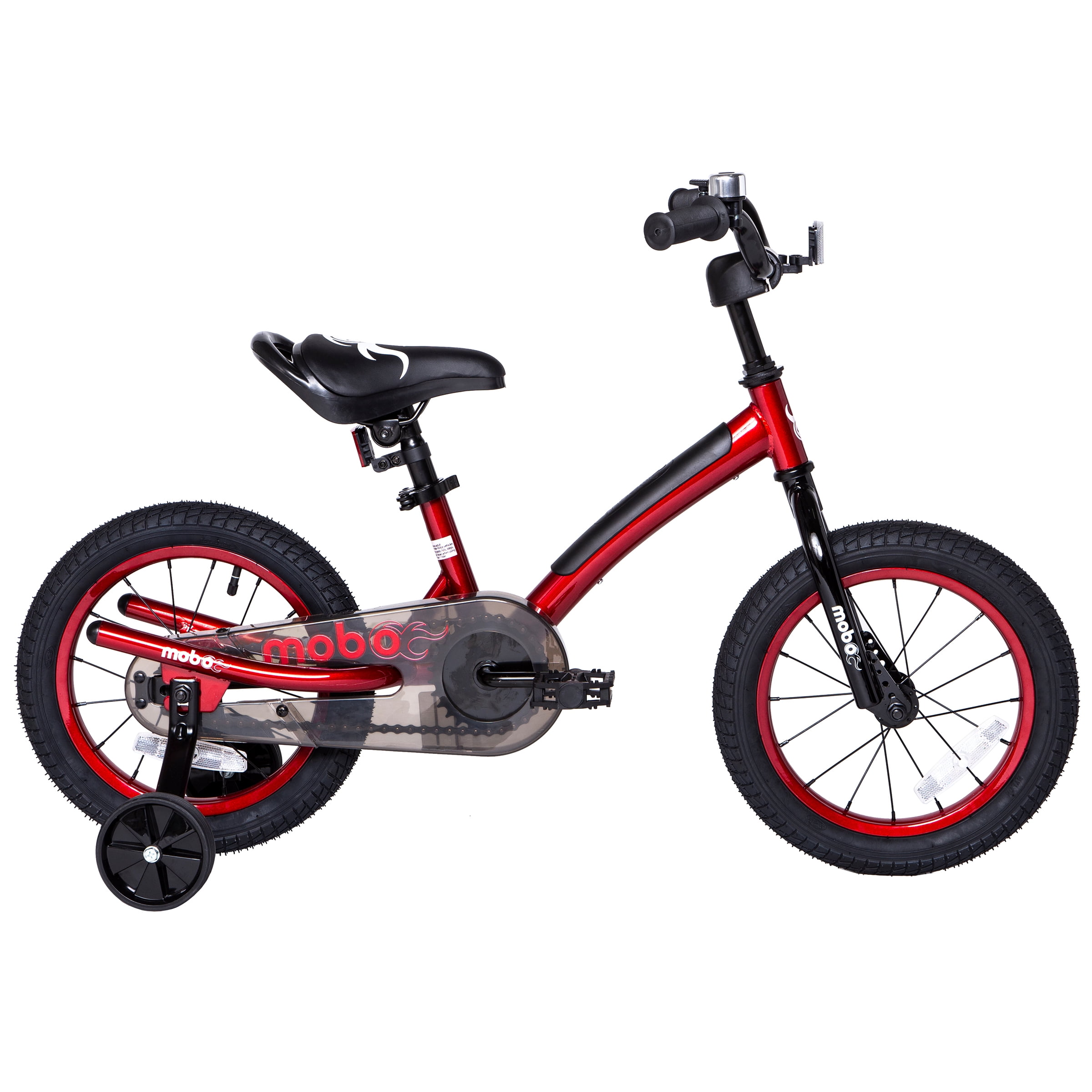 14-Inch Toddler Bike — Mobo’s 14-Inch bike with training wheels is a great first bike for toddlers just learning to ride Designed For Safety — A thick handlebar stem pad, padded frame, soft rubber grips and chain guard protect your child. This safe kid’s bike includes 6 safety reflectors. Chain guard for safety and cleanliness. Safety bell included Training Wheels — Attach the bike training wheels while your child is learning. When they’re ready, remove the training wheels and use seat handle to help support their first few rides Adjustable — Quick release seat post and height adjustable handlebars accommodates your child as they grow 3-5 Years — A bike for 3–5-year-old boys and girls or kids 36-47 inches tall and up to 60 lbs. Fits 19 to 22-inch inseams