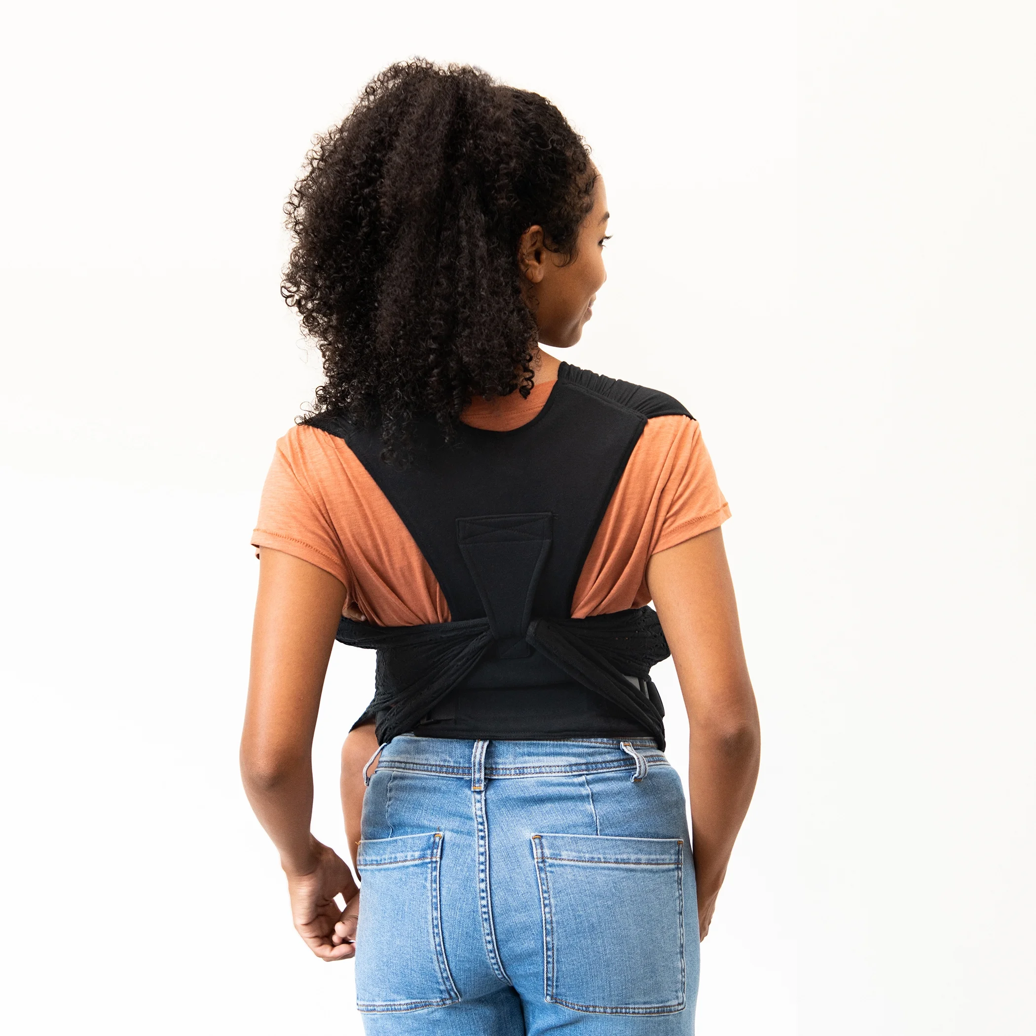 For babies 8-33 lbs., newborn to toddler Soft, stretchy, and breathable fabric with eyelet design Easy to slip on 2 ways to wear baby: inward-facing or forward-facing (6 months +) Padded back support and sash guide for comfort and ease Adjust and secure a custom-fit with sturdy side buckles Hands-free convenience Comfortable to wear for long periods of time Encourages bonding with baby Acknowledged by the International Hip Dysplasia Institute (IHDI) as a “hip-healthy” product for babies 3 steps to wear: Slip on like a t-shirt, buckle and secure, lift and tie sash One-size fits most- friendly for plus-size and changing post-partum bodies! Machine-washable