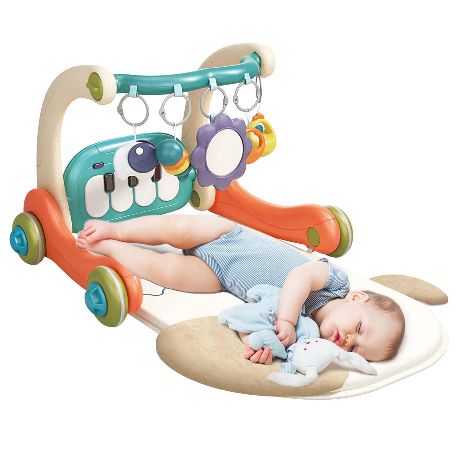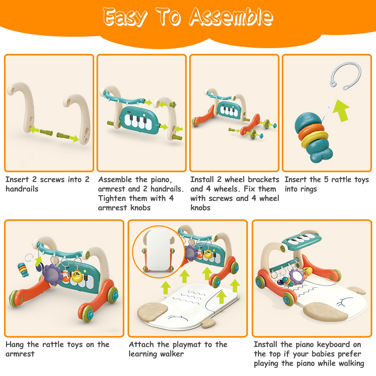 Friendly Reminder: The playmat is not machine washable. Baby’s Early Development Toys: Can be used as playmat, activity center and learning walker. The playmat offers a safe and comfortable environment for toddlers to lie and play. The piano, lights, game panel, 5 cute hanging rattle toys provide a greatly joyful center for babies while allowing them to explore, learn and play. The learning walker with armrest serves as a sturdy walker to support their first steps. Specially Designed for Babies: In our versatile activity center, babies can lie, kick, sit, grab, observe, listen, stand, learn how to walk etc.. Practices their listening, observation and physical observation. The baby musical piano gym requires 3 * AA batteries (not included).Hope our multifunctional baby tummy time mat brings your family more happiness. Piano Keyboard & Game Panel: Coming with 4 piano keys and 20 pieces of delightful melodies, our baby gym encourage sensory development and stimulate auditory senses, fostering a love for music from an early age. The game panel develops their fine motor skills, hand-eye coordination, and cognitive abilities, all while having fun. Safe Learning Walker: Featured with an armrest and 4 wheels, our walker provides a necessary support when babies start learning to walk. Besides, the 5 cute pendants also add endless fun for walk learning. It is also detachable for take-along playing. The soft music and color will exercise your baby’s ability of hearing and color cognition. Ideal for 0-12 months old. Easy To Assemble: First, assemble the piano, armrest and 2 handrails with screws. Second, tighten the screws with knobs. Third, install 2 wheel brackets and 4 wheels. Fourth, fix the wheels with wheel knobs. Fifth, hang the provided 5 cute rattle toys with rings. Finally, attach the playmat to the installed learning walker. In addition, you can also install the piano keyboard on the top if your babies prefer playing the piano while walking. Specification: Brand: Moclever Product Type: Baby Gym Playmat And Learning Walker Color: Multi-color Materials: ABS, PP, TPE, PE Applicable Age: Less Than 1 Year Old Power Supply: 3 x AA Batteries(Not Included) Piano Music Quantity: 20 Pcs Playmat Size: 83.8 x59 x0.8cm/33 x23.2 x0.3in Learning Walker Size: 55.5 x 46 x 41.5cm/21.6x18x16.3in Assembled Item Size: 59x87x41.5cm/23.2×34.3×16.3in Assembled Item Weight: 1700g/3.7 lbs Package Size: 44x18x33cm/17.32×7.08×12.99in Package Weight: 2400g/5.3lbs Package Contents: 4 x Wheels 2 x Wheel Brackets 2 x Handrails 1 x Armrest 1 x Piano Keyboard 1 x Playmat 5 x Hanging Rattle Toys 5 x Rings 4 x Wheel Knobs 4 x Screws 4 x Armrest Knobs 1 x User Manual