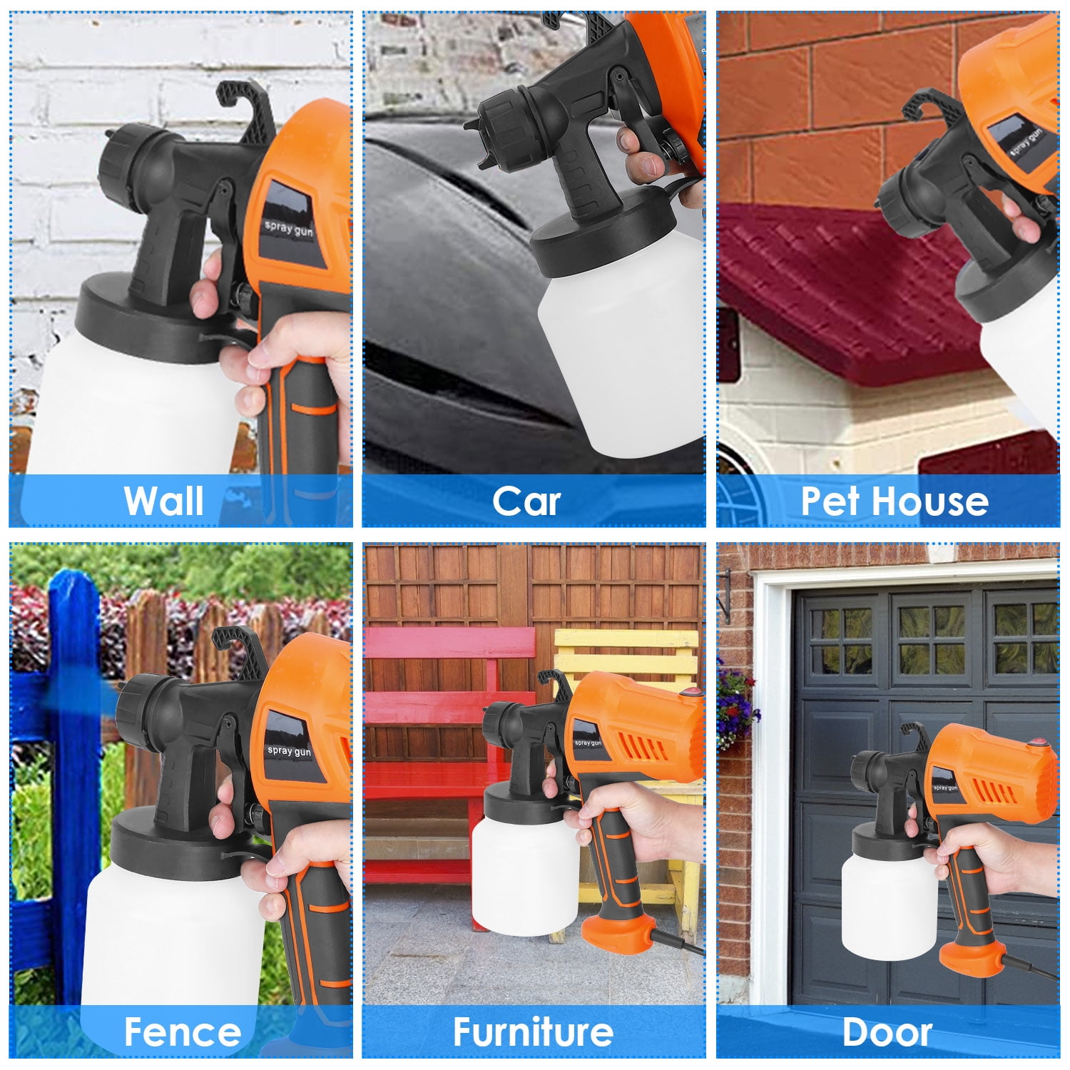 High Power Electric Sprayer: Up to 700 watt powerful motor allows you to paint with minimal filling and make the spraying surface more concentrated and more uniform. The insulation handle makes it safe during operation. 3 Patterns: There are 3 different spray patterns: horizontal, vertical and circular. Vertical and horizontal patterns are recommended for larger surfaces. Round spray pattern is for small objects or areas. Adjustable Paint Flow: You can adjust the flow control dial to quickly increase or decrease the output volume according to different needs. (The max paint flow can reach to 500ml/min ). Detachable Cup & Easy To Clean: The 800ml/27oz viscosity cup is removable which brings convenience for quick and easy cleaning after spraying. 5.2FT Long Power Cord: Power cord is long enough for you to move freely in large work area. Ideal for any painting projects, such as furniture, cars, fences, interior walls, garage doors, garden tables and chairs etc. Notices: * Only use paints, solvents, or other materials with a flashpoint of 89.6°F or higher. * Keep your workplace clean and tidy. Never use the tool in hazardous areas that contain flammable liquids, gases, or dust. * Clean the sprayer in time after every time use. * Do not expose it to rain or other wet conditions. Keep the motor and plug dry, otherwise, it may cause a unit short circuit. Specification: Brand: Moclever Product Type: Electric Paint Sprayer Available Colors: Blue, Yellow Material: PVC Power: 700W Plug Available: US/UK Plug Voltage: 110V 60Hz (US)/ 220V 50Hz(UK) Paint Capacity: 800ml/27oz Sprayer Head Diameter: 2.5mm/0.098in Max Viscosity: 40din/s Paint Flow: Max. 500ml/min Recommended Spraying Distance: 100-200mm/3.94-7.87in Motor Speed: 32000rpm/min Wire Length: 1.6m/5.2ft Item Size: 26x27x12cm/10.24x 10.63x 4.72in Item Weight: 1kg/2.20lbs Package Size: 27.5×12.5×27.2cm/ 10.83x 4.92x 10.71in Package Weight: 1.3kg/2.87lbs Package includes: 1x Electric Paint Sprayer 1x Viscosity Cup 1x Quick Guide Card 1x User Manual More Options For You: