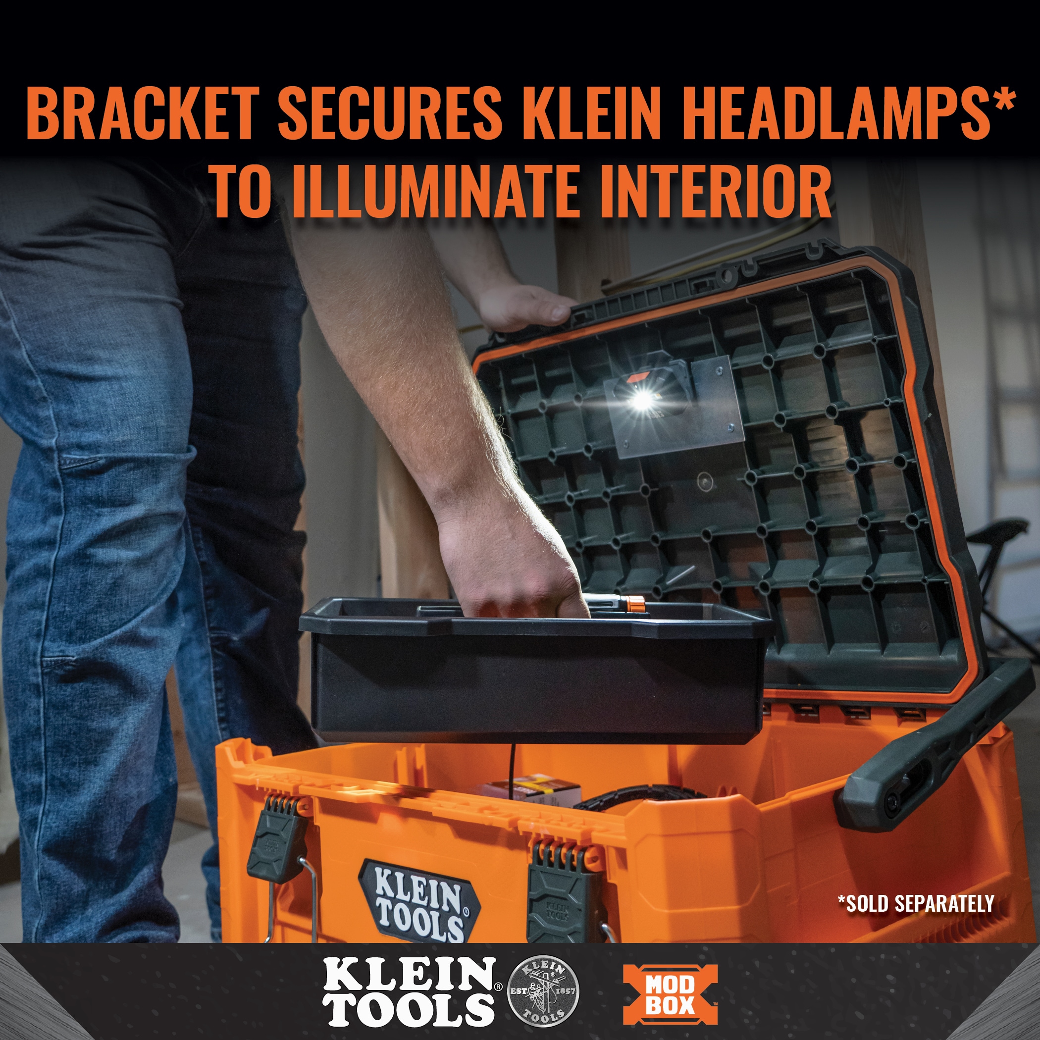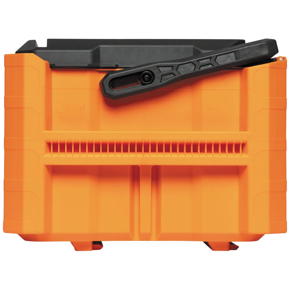 Klein Tools MODbox™ Medium stackable tool box features side rails that connect attachments for more storage options and easy access to commonly used items. Metal reinforced handle pivots for a comfortable top carry when not connected to other MODbox™ component parts. Tool box organizer is IP65 rated, 100-Pound capacity, and made with heavy duty impact resistant polymers. Comes with a removable Tool Caddy. Easily connects with other MODbox™ components to make a custom mobile workstation.