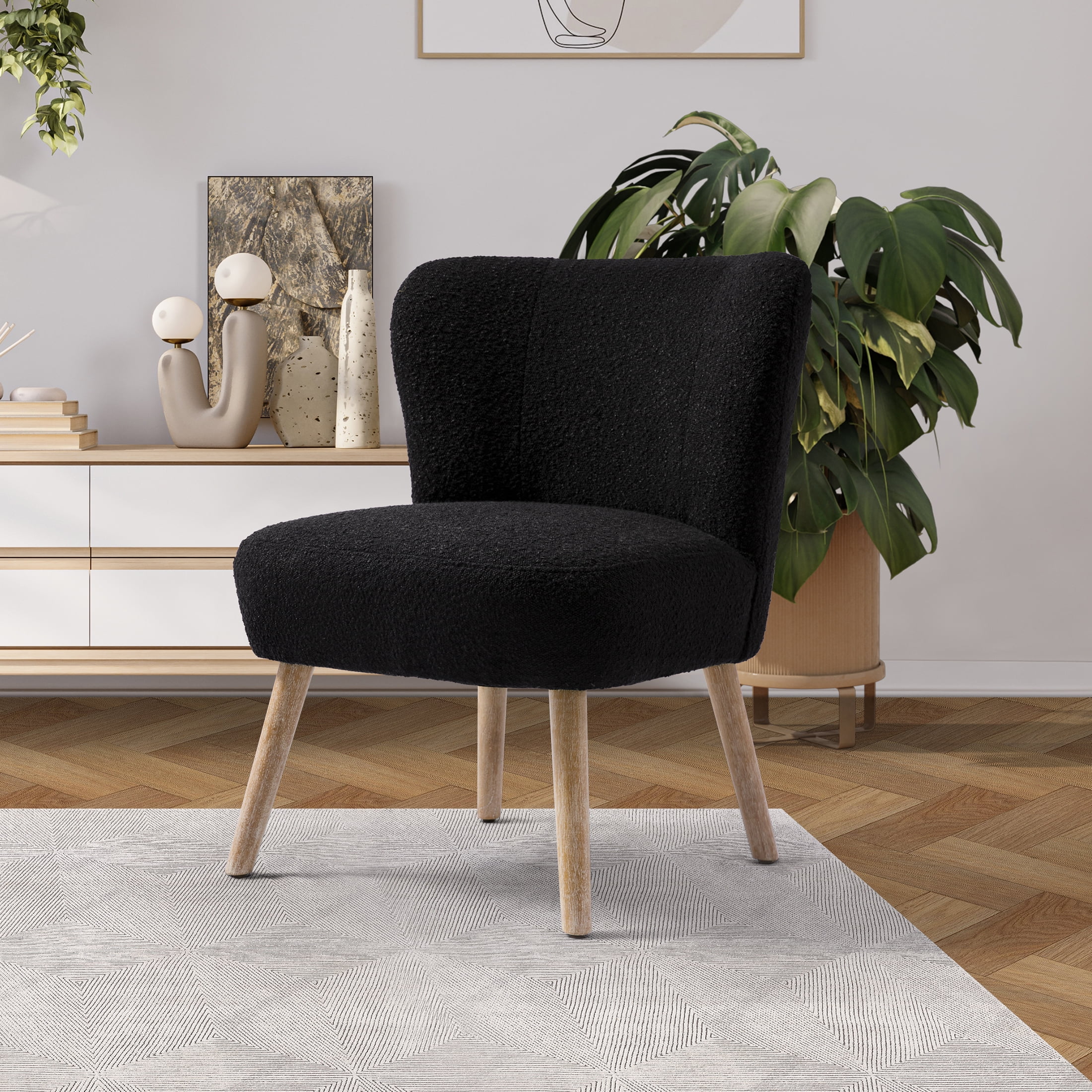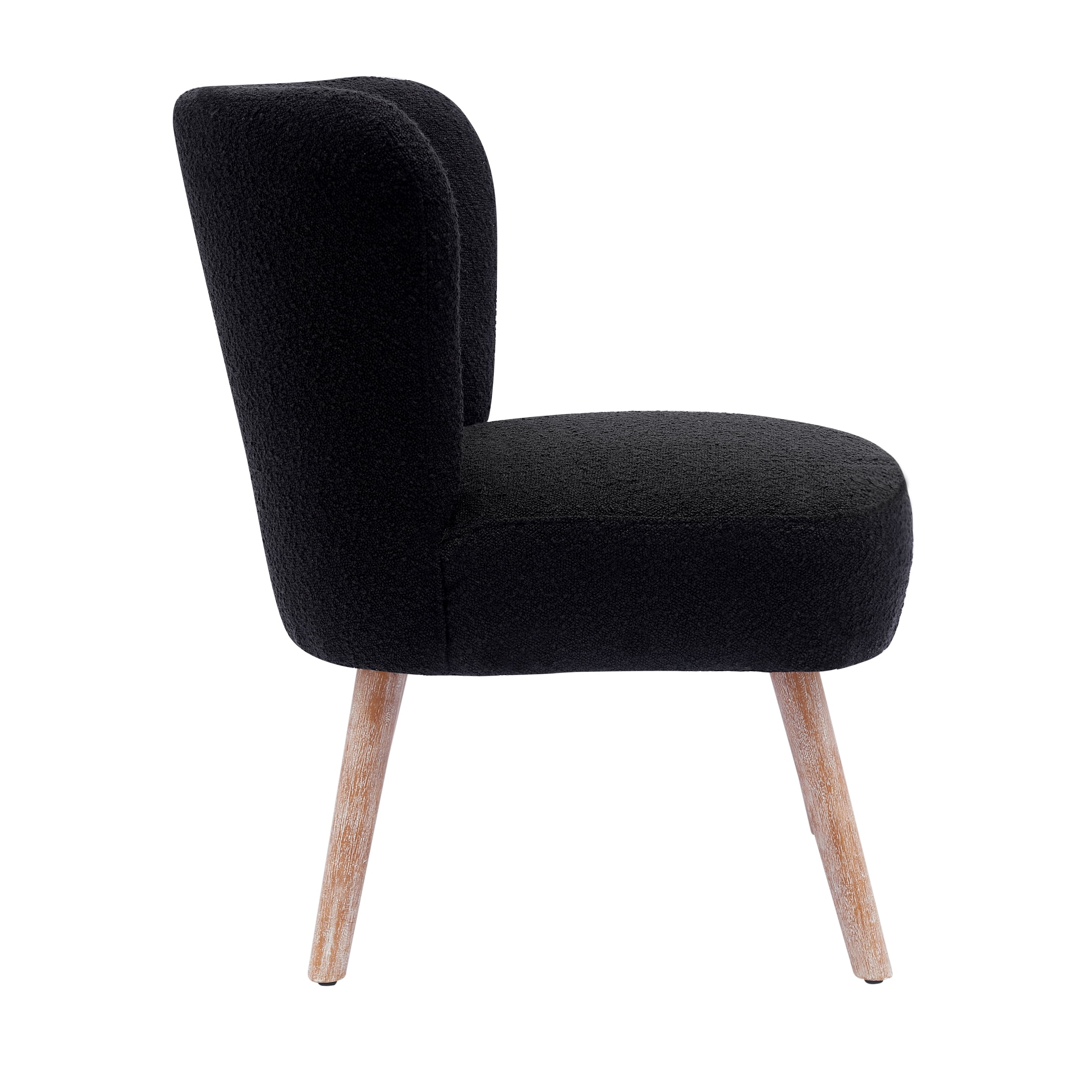 This 25″ wide accent chair adds another spot in your living room for people to sit at get-togethers. It serves as a versatile seating option for your living rooms, bedrooms, and vanity desk. Upholstered with a water-resistant treated boucle fabric that provides a contemporary fashion outlook and longevity. Easy to clean thanks to the water- and stain-resistant material that makes cleaning a breeze. A thick, padded foam seat combined durable yet comfortable construction provides all-day comfort for hours on end. Designed with a chic silhouette and a curved backrest with a rounded edge for a contemporary look that will last for years, and finished with solid wood legs that have a rustic antique finish that adds charm and foot gildes on the feet to protect your floors.