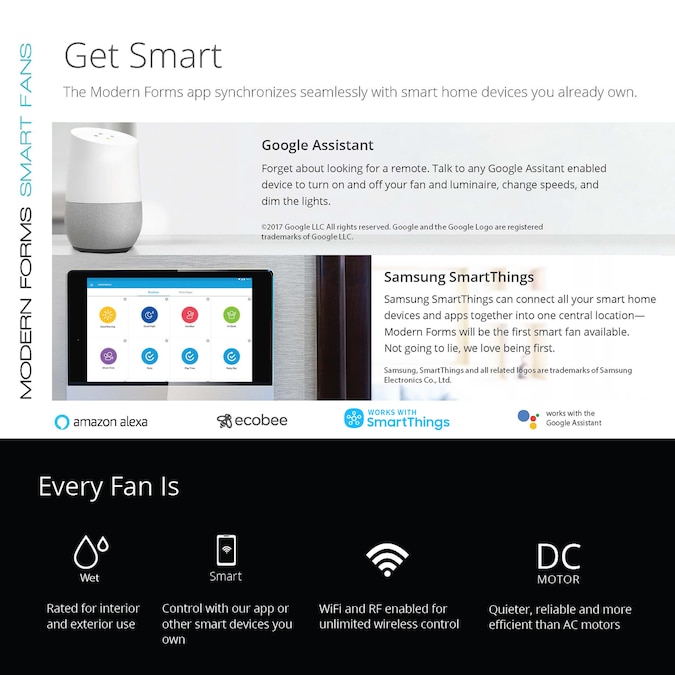 • Modern Forms Fans pair with the smart home tech you know and love including Google Assistant Amazon Alexa Samsung Smart Things Ecobee Control4 and Josh AI Coming Soon Savant Lutron Homeworks and Nest