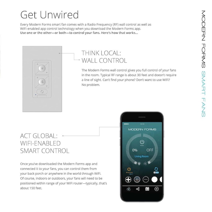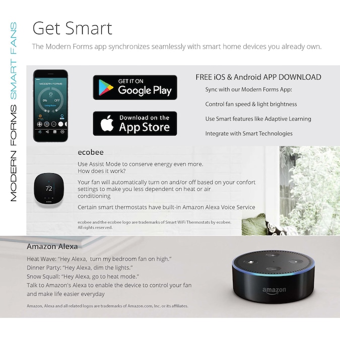 • Free app download Sync with our exclusive Modern Forms app to control fan speed use smart features like breeze mode adaptive learning create groups and reduce energy costs
