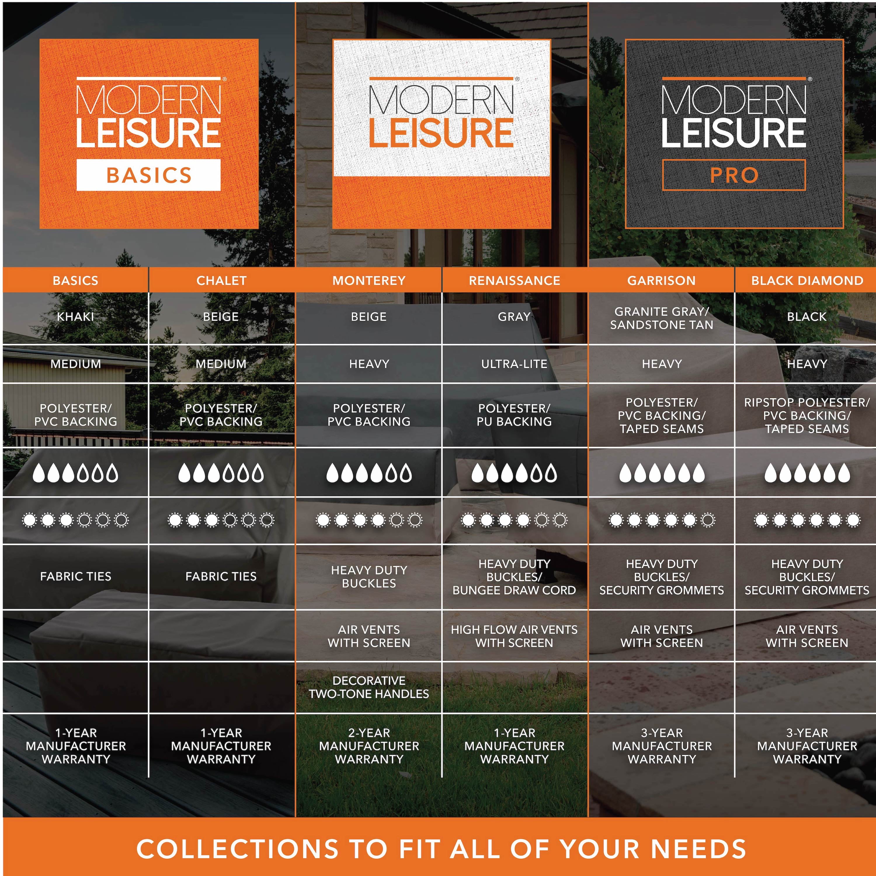 The Garrison Waterproof Patio Loveseat Cover combines durability with an elegant aesthetic, capable to stand-up against some of the harshest weather mother nature has to offer. Taped seams help keep out water, dirt, and debris, keeping your investment clean and protected from outdoor elements. Loaded with features, the Garrison Waterproof Collection provides our strongest warranty protection with a 3-year manufacturer warranty—Stay protected with Modern Leisure. Pack includes 2-loveseat covers. Modern Leisure Patio Furniture Covers stand up to the harshest weather elements. Enhancing your outdoor living space and protecting your investments is a commitment we take very seriously. Spend more time outdoors with loved ones and safeguard your leisure lifestyle.
