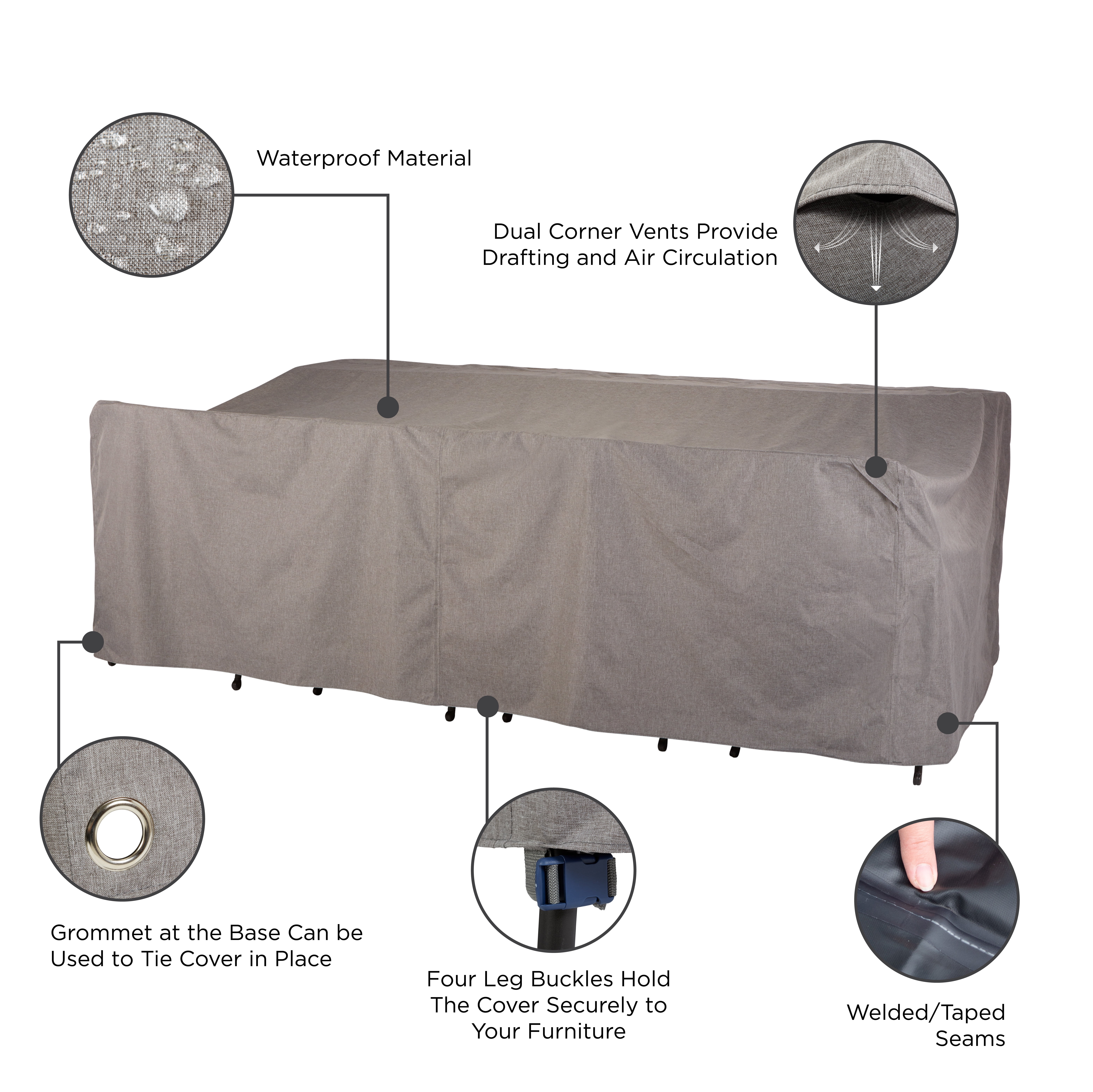 PATIO TABLE & CHAIR SET COVER: Fits most rectangular/oval patio table & chairs up to 108-inches long x 64-inches wide x 34-inches high. 100% WATERPROOF COVER: Durable material has reinforced, taped seams to keep your patio furniture clean & protected from the elements while excellent UV resistance helps reduce fading over time. DURABLE & SECURE FIT: Base grommet for ties & 4 leg buckles help provide you a secure, custom-like fit during inclement weather & high winds—not designed to entirely cover wheels or feet. MINIMIZES CONDENSATION: Built-in air vents offer maximum ventilation, allowing drafting to prevent your cover from blowing away in high winds while minimizing mold & mildew buildup. EASY TO CLEAN & WARRANTY: Patio furniture cover can be easily spot cleaned with a damp cloth—3-year manufacturer warranty against material defects from weather-related wear & tear or UV exposure.