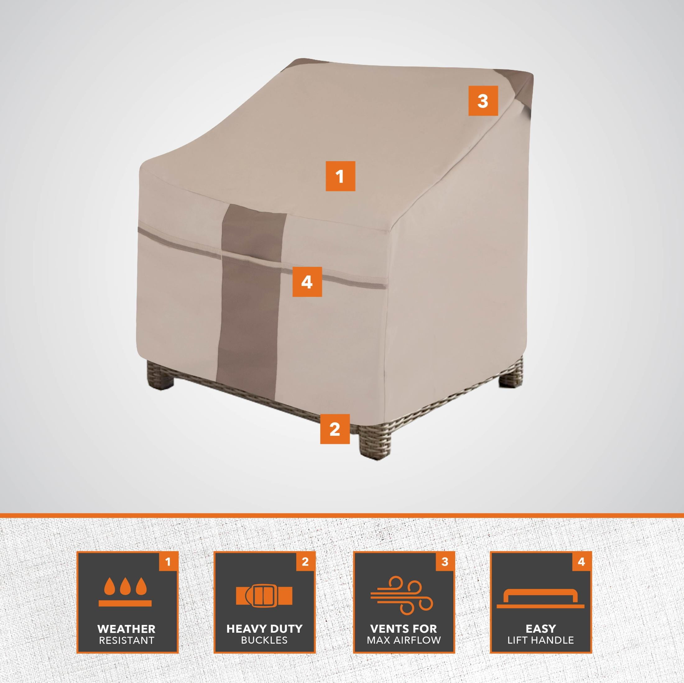DEEP SEATED CHAIR COVER: Fits most deep-seated patio lounge & club chairs up to 38-inches long x 40-inches wide x 31-inches high (2-Pack). HEAVY-DUTY PATIO COVER: Durable material keeps your patio chair clean & protected while excellent UV resistance helps reduce fading over time against the elements. FAST & SECURE FIT: Leg buckles help provide a fast & secure fit to your patio furniture during inclement weather & high winds—not designed to entirely cover wheels or feet. MAXIMUM VENTILATION & DRAFTING: Built-in air vents offer maximum ventilation, allowing drafting to prevent your cover from blowing away in high winds while minimizing mold & mildew buildup. EASY TO CLEAN & WARRANTY: Chair cover can be easily spot cleaned with a damp cloth—2-year manufacturer warranty against material defects from weather-related wear & tear or UV exposure. HOME DÉCOR: Neutral beige color matches most home environments & décor.