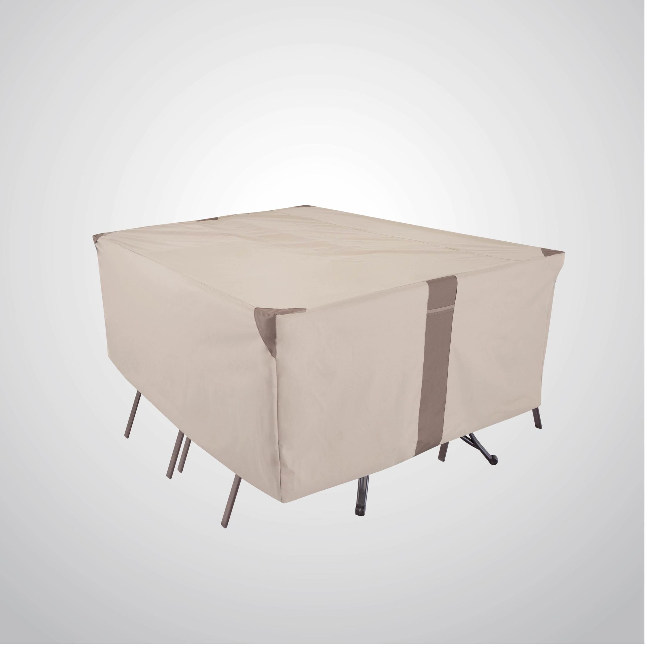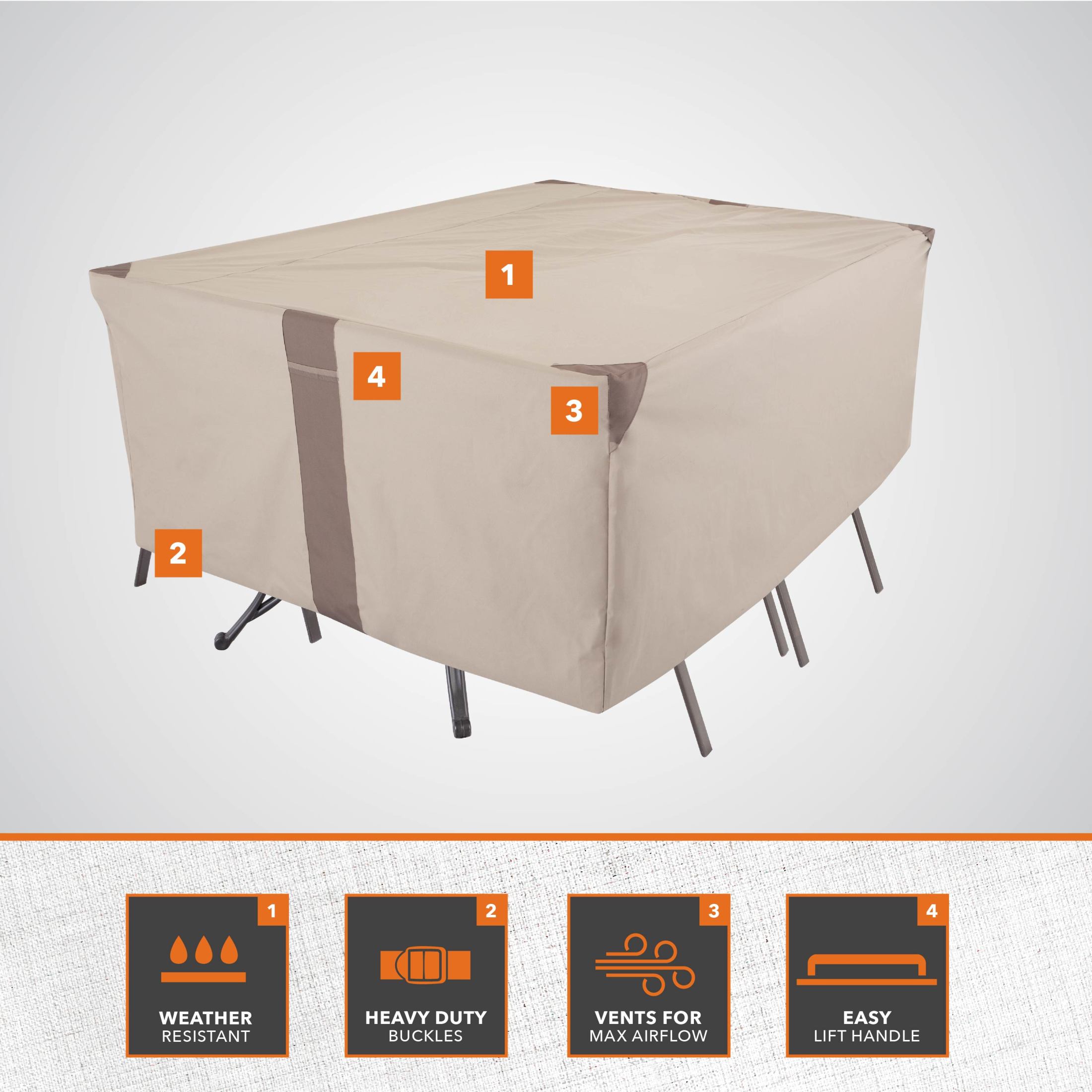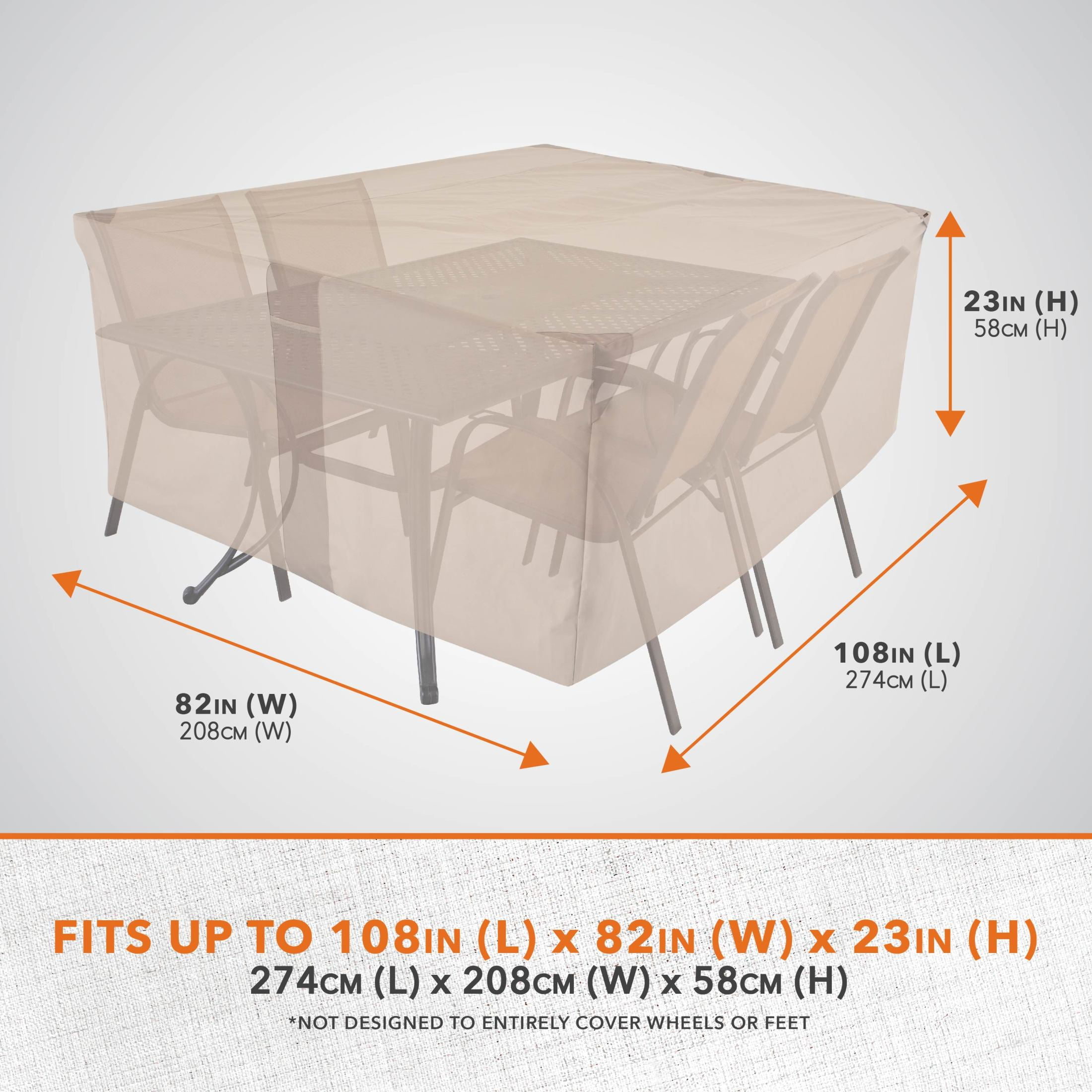 PATIO TABLE & CHAIR SET COVER: Fits most rectangular/oval patio table & chairs up to 108-inches long x 82-inches wide x 23-inches high. HEAVY-DUTY PATIO COVER: Durable material keeps your patio furniture clean & protected while excellent UV resistance helps reduce fading over time against the elements. FAST & SECURE FIT: Leg buckles help provide a fast & secure fit during inclement weather & high winds—not designed to entirely cover wheels or feet. MAXIMUM VENTILATION & DRAFTING: Built-in air vents offer maximum ventilation, allowing drafting to prevent your cover from blowing away in high winds while minimizing mold & mildew buildup. EASY TO CLEAN & WARRANTY: Patio furniture cover can be easily spot cleaned with a damp cloth—2-year manufacturer warranty against material defects from weather-related wear & tear or UV exposure.