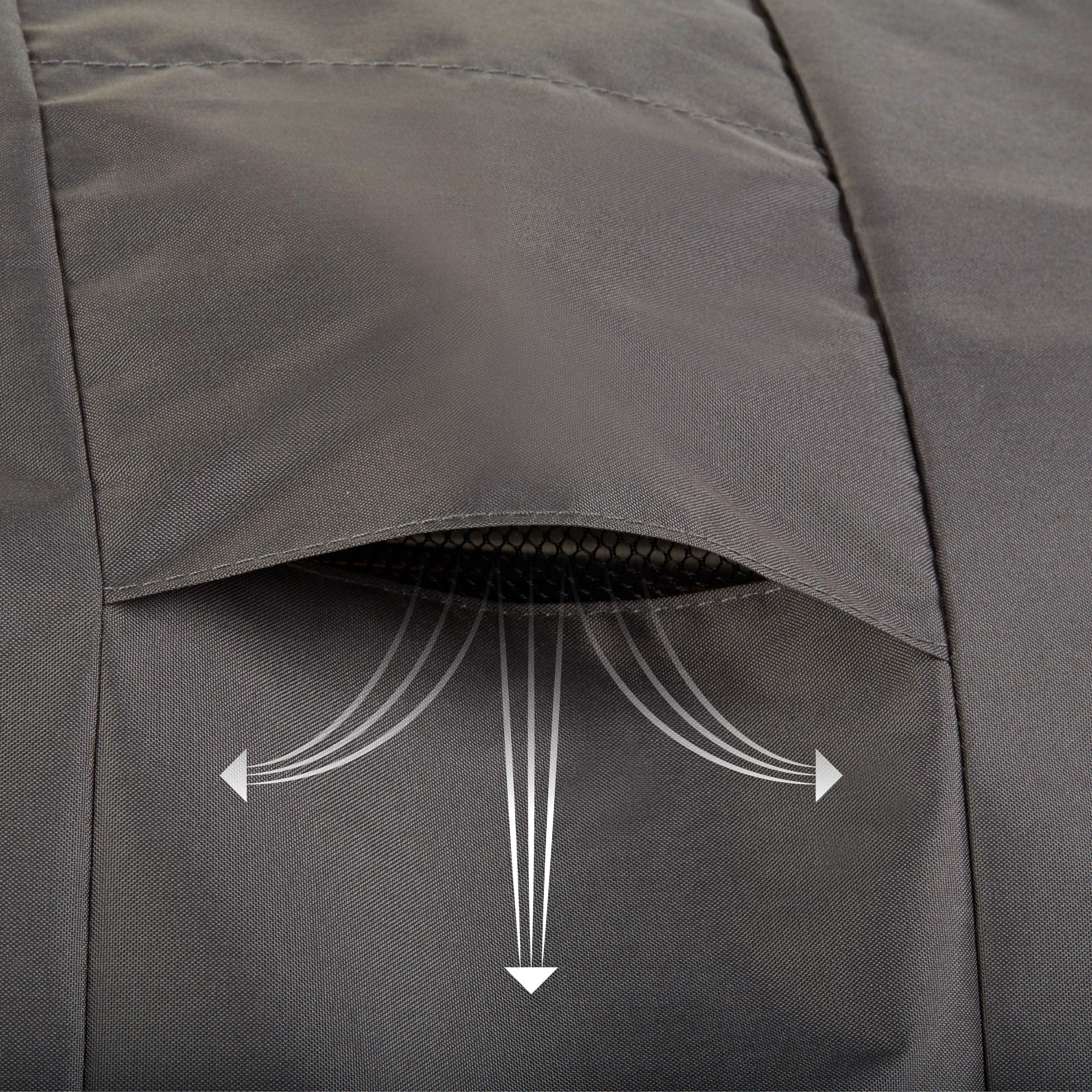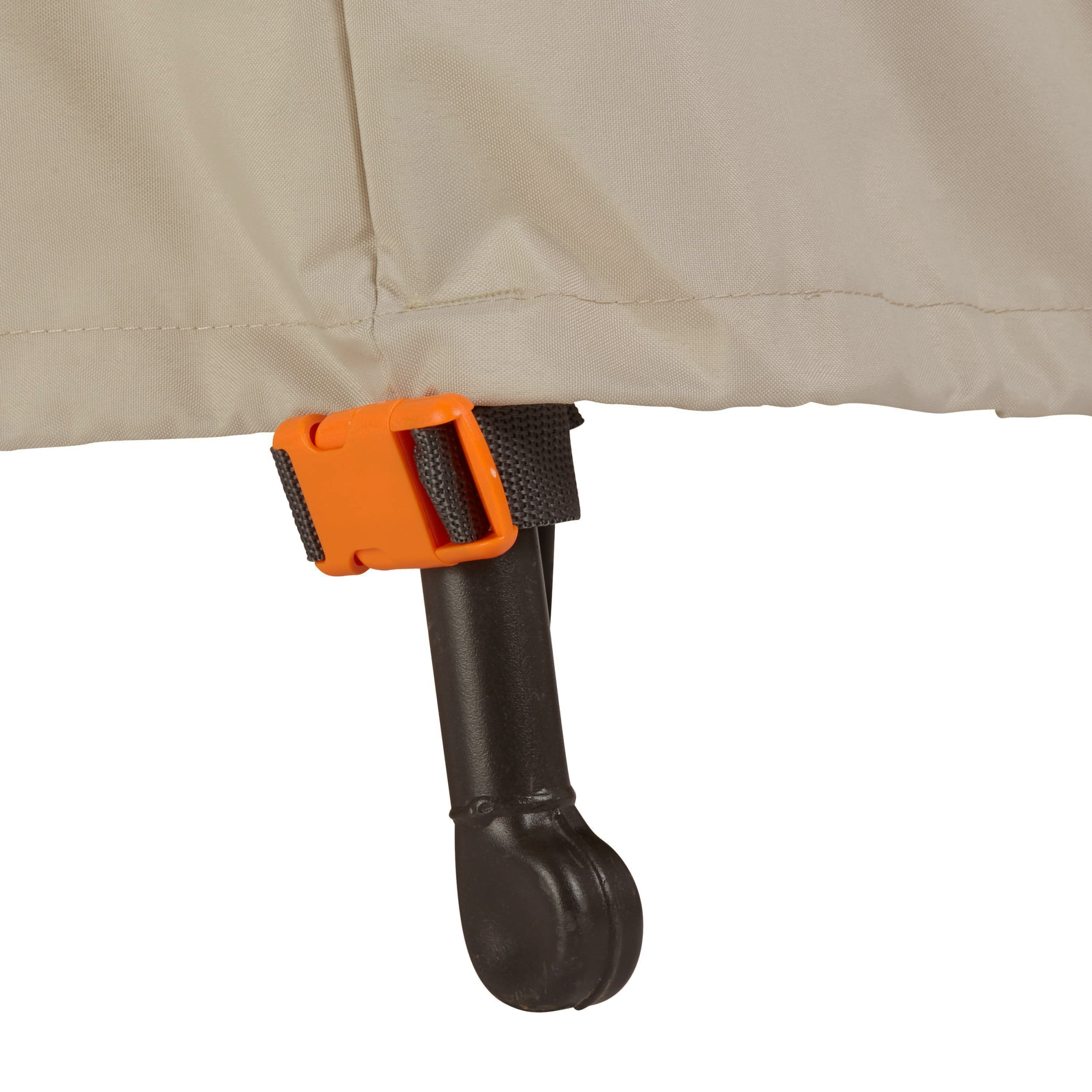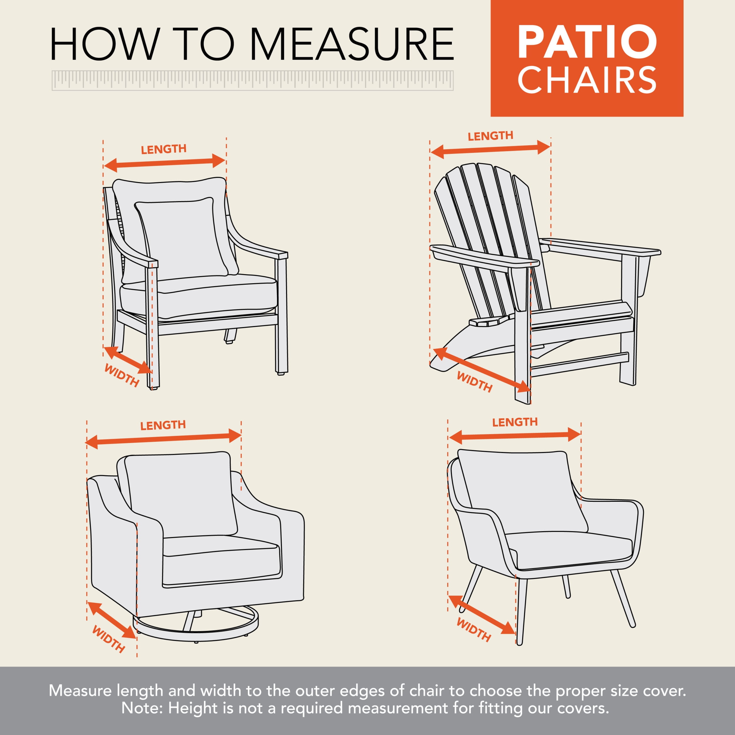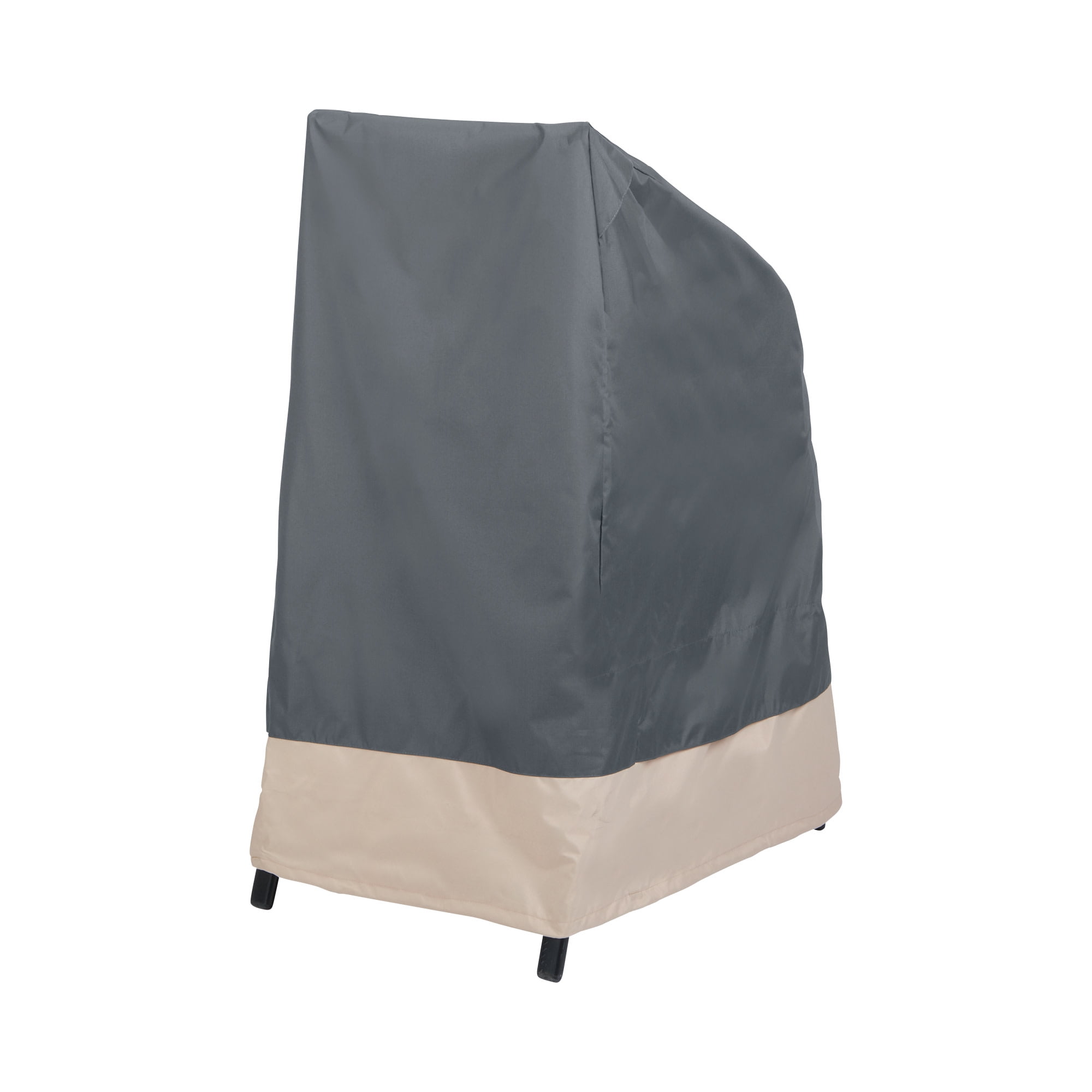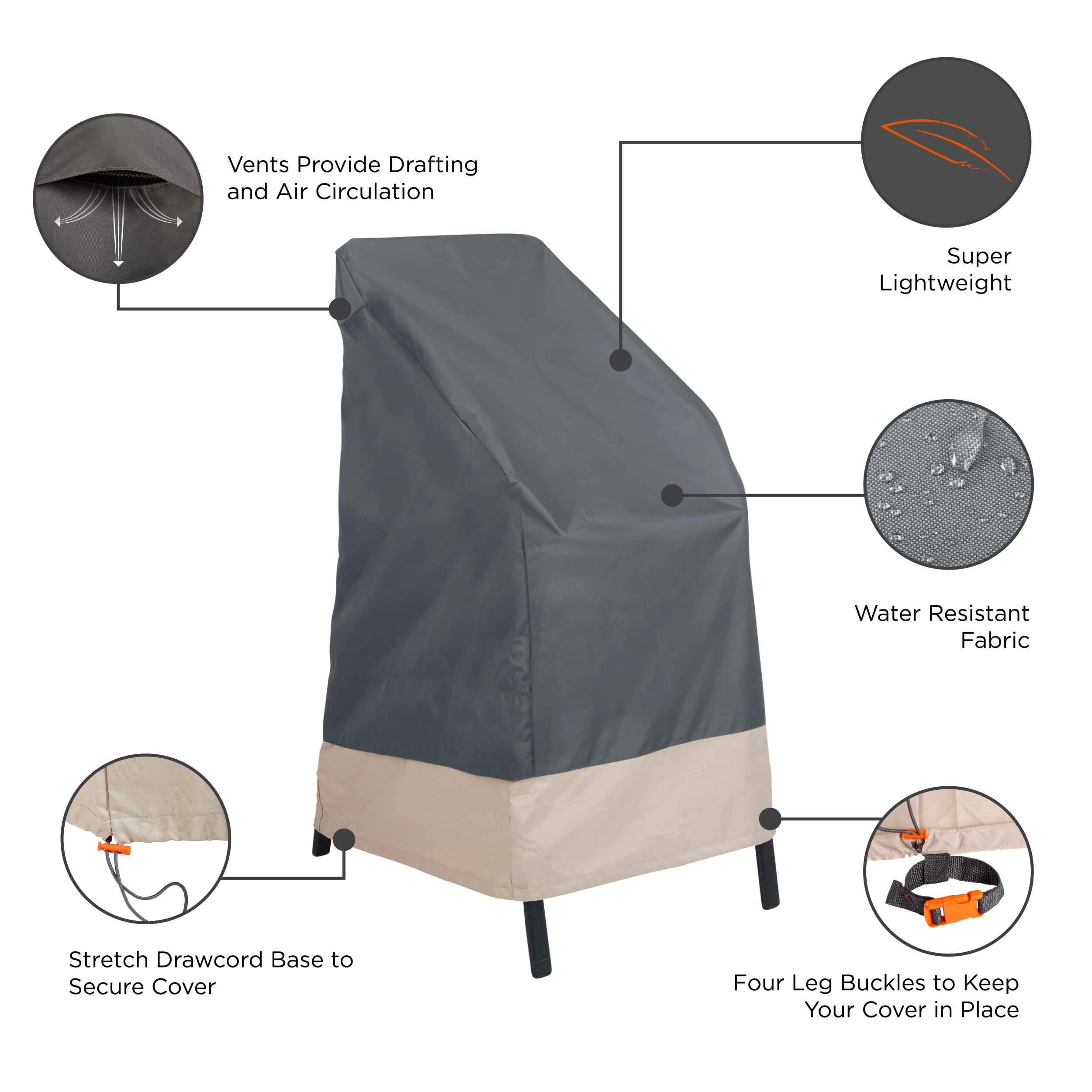 STACKABLE CHAIR COVER: Fits most stackable patio chairs up to 27-inches long x 27-inches wide x 49-inches high & compatible with high back chairs & bar stools with similar fit dimensions—includes a stuff sack for easy, compact storage (2-Pack). DURABLE & LIGHTWEIGHT PATIO COVER: Material keeps your patio chairs clean & protected from the elements while excellent UV resistance reduces fading over time. CUSTOM FIT COVER: Elastic bottom hem, with drawcord, & 4 leg buckles help provide a secure, custom-like fit—not designed to entirely cover wheels or feet. MAXIMUM VENTILATION & DRAFTING: Built-in air vents offer maximum ventilation, allowing drafting to prevent your cover from blowing away in high winds while minimizing mold & mildew buildup. EASY TO CLEAN & WARRANTY: Chair cover can be easily spot cleaned with a damp cloth—1-year manufacturer warranty against material defects from weather-related wear & tear or UV exposure. HOME DÉCOR: 2-tone color matches most home environments & décor.