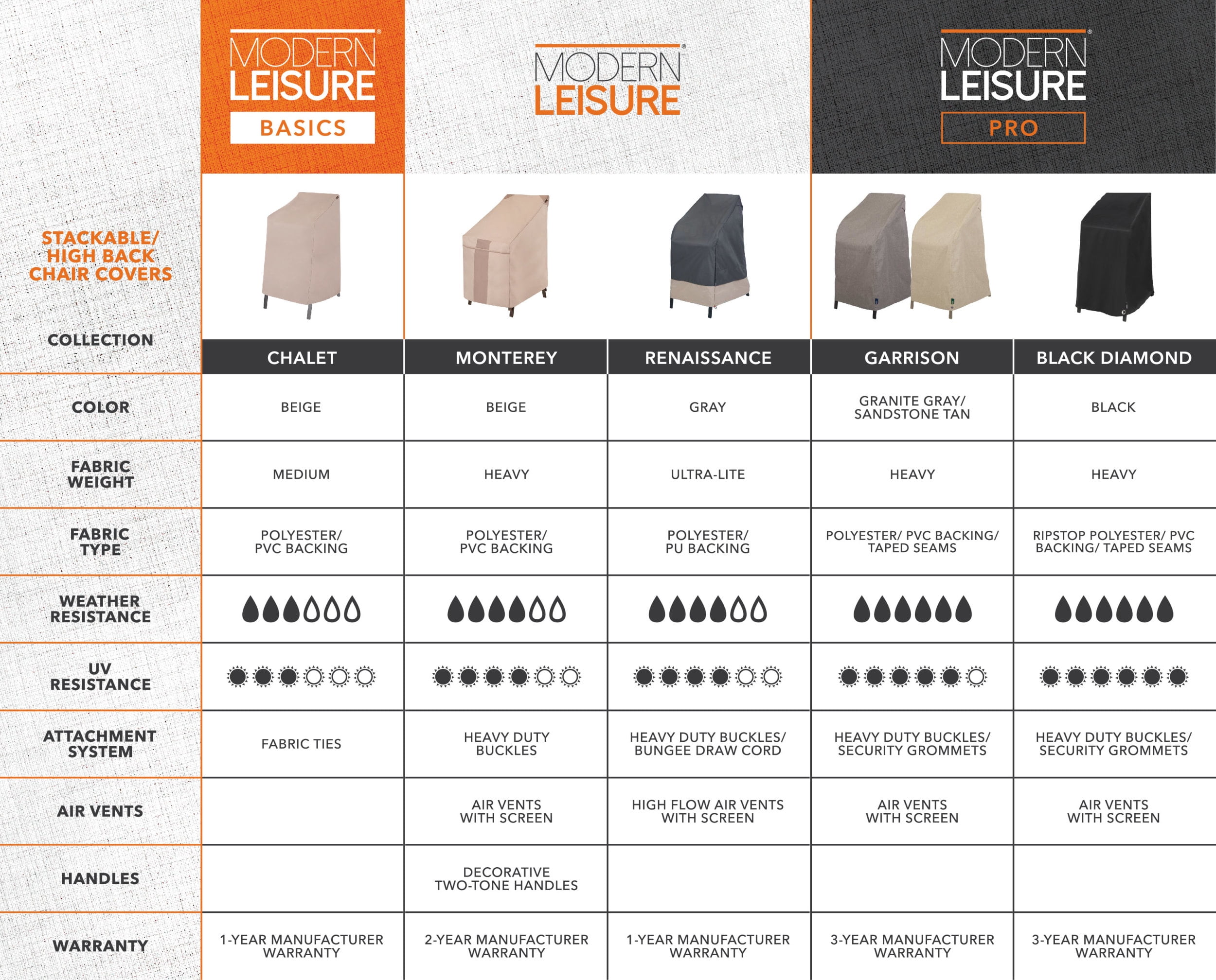 The Renaissance Stackable Patio Chair Cover features an attractive, 2-tone aesthetic that is lightweight to maneuver and designed to keep your patio furniture looking its best year-round. Weather-resistant material helps keep outdoor elements at bay while an elastic hem cord provides a fast and custom-like fit. Loaded with features, and a 1-year manufacturer warranty, your outdoor living area will boast beautiful protection with the Renaissance Collection. Take advantage of our warranty program supported by our US-based customer service team and stay protected with Modern Leisure.