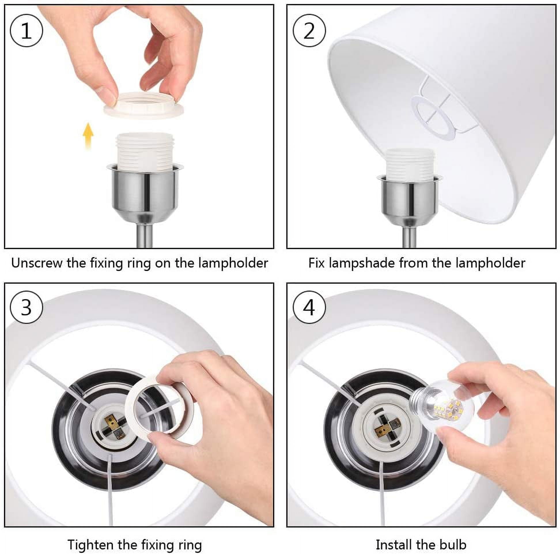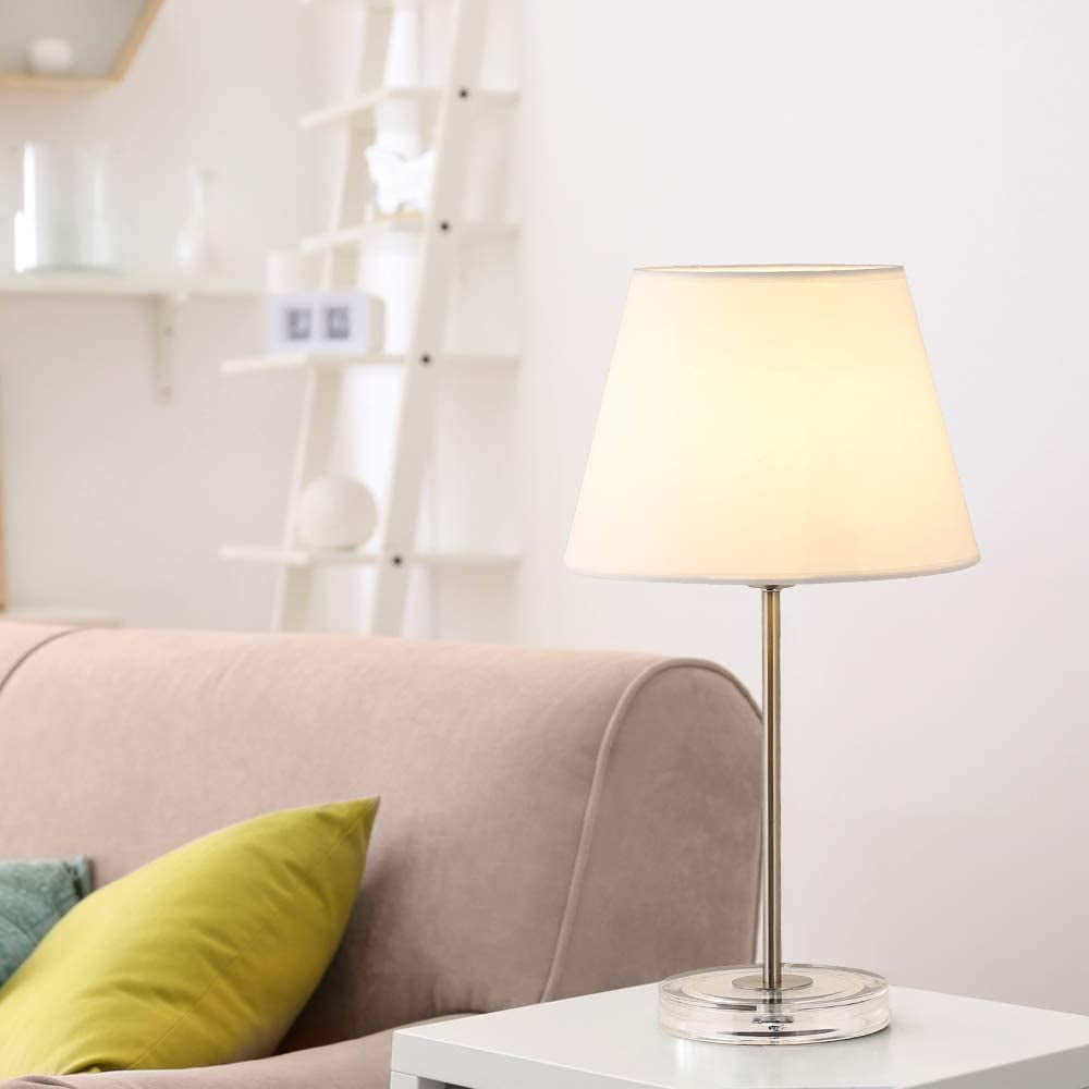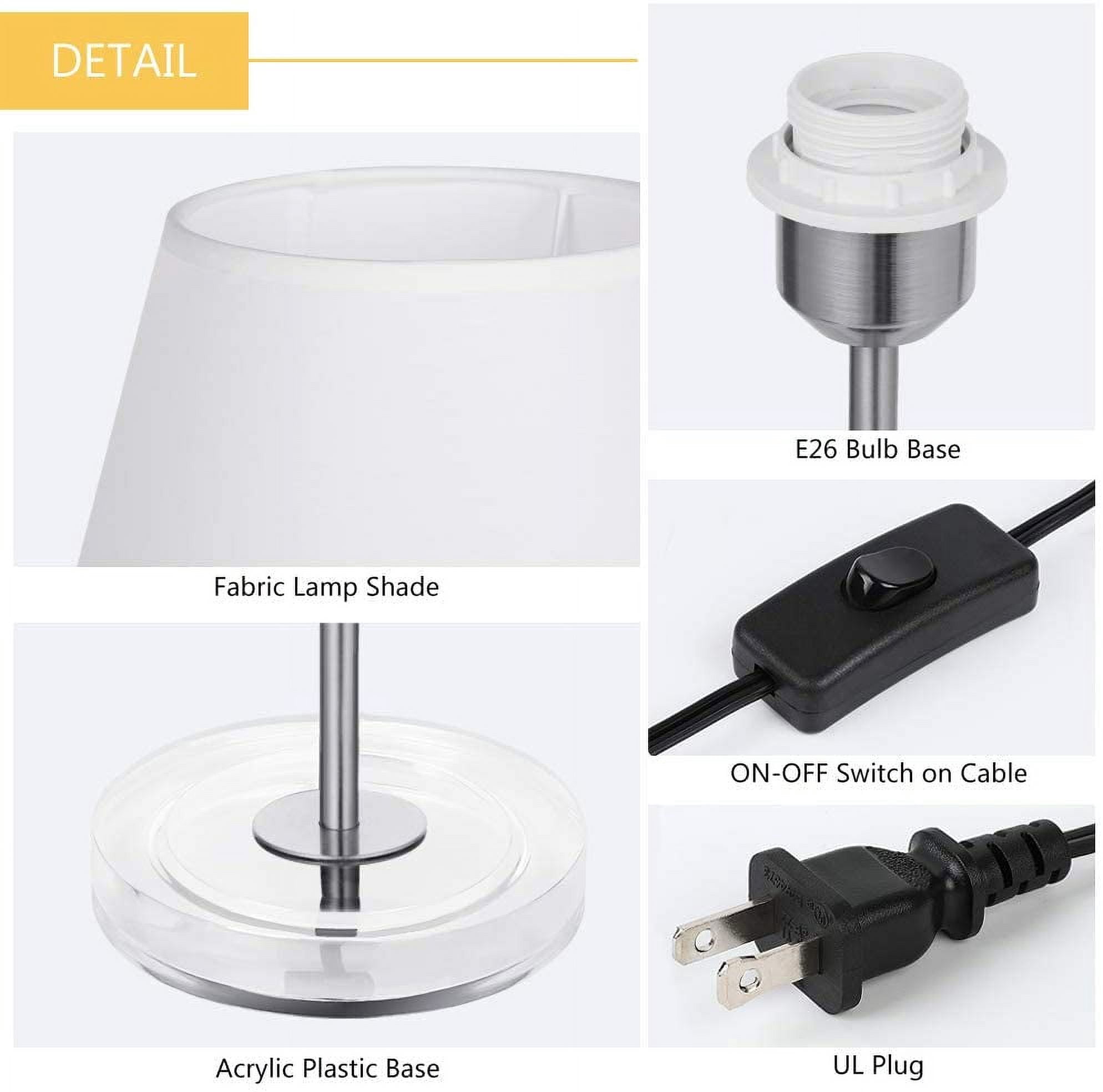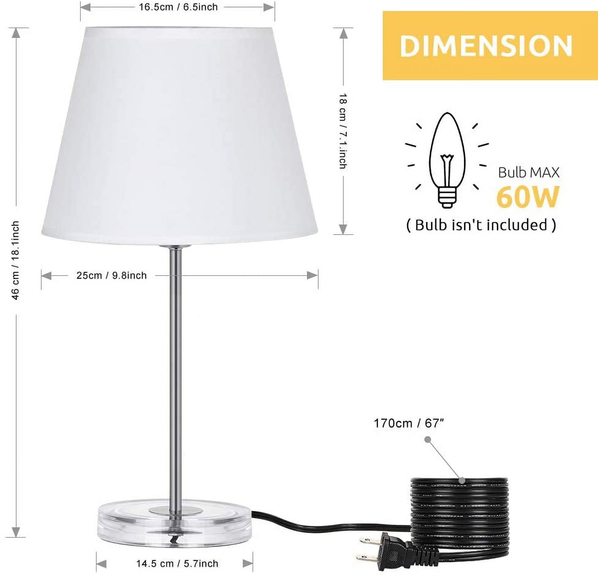 • [Small Table Lamp with Non-slip] Designed with 18.1(H) x 6.5(L) x 5.7(W) inches, the HAITRAL nightstand table lamps are save-space and not too heavy, providing you with anti-slip pads that you can install as needed. The small base is suitable for any desk, whether it is a big table or a small table. It is a perfect size for your desk! • [Modern yet Simple Acrylic Base Lamp] The bedside table lamps with classic shape of lampshade and holder, match fabric and sliver metal, making a touch of industrial, never out of date. An acrylic base makes the lamp appear to float, bringing unique charm and imagination. • [Safe to Use & Easy to Install] We attach great importance to the quality of the HAITRAL table lamps. The cord and plug of bedside table lamp are UL listed. By being UL listed, each lamp is nationally recognized for its standard of safety. It’s a not heavy lamp, easy to move to any place where you have lighting needs and the ON/OFF switch on the cord close lamp is easy to use. • [Compatible with E26 Bulb Max 60W] The HAITRAL stylish nightstand lamps are compatible with variety of E26 bulbs type such as Edison, incandescent, halogen, LED or CFL, but do not use a bulb exceeding 60W. (NOTE: Bulb is not included)