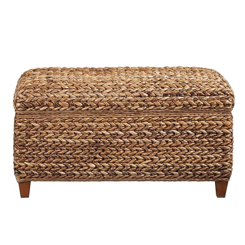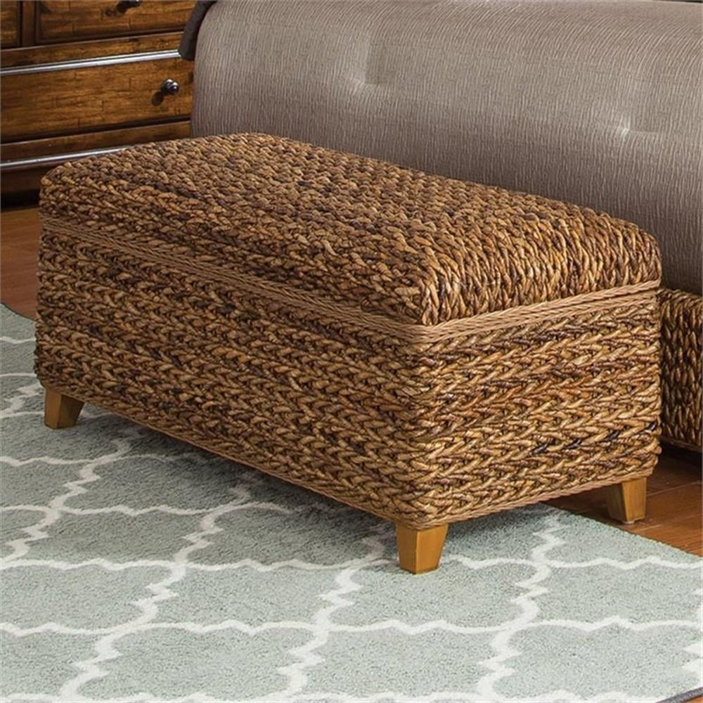 Includes: One (1) storage bench Finish: Amber Materials: Mahogany, Rattan/Banana Leaf Modern rustic island-inspired collection highlighted with rich texture Hand-woven banana leaf bed pairs with modern country-inspired cases Embellished with light hand distressing in a rich rustic brown finish Constructed of solid wood and select veneers Inner size of trunk: 37.99″W x 14.76″D x 9.65″H