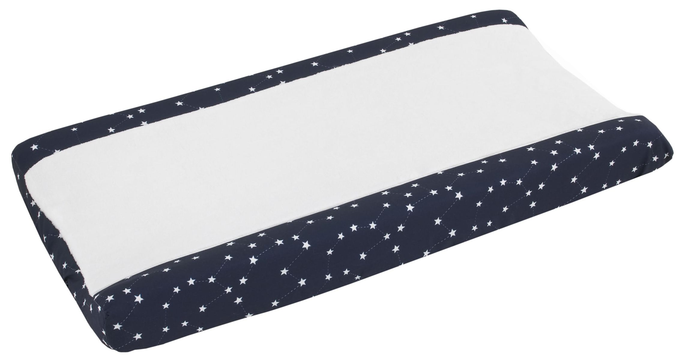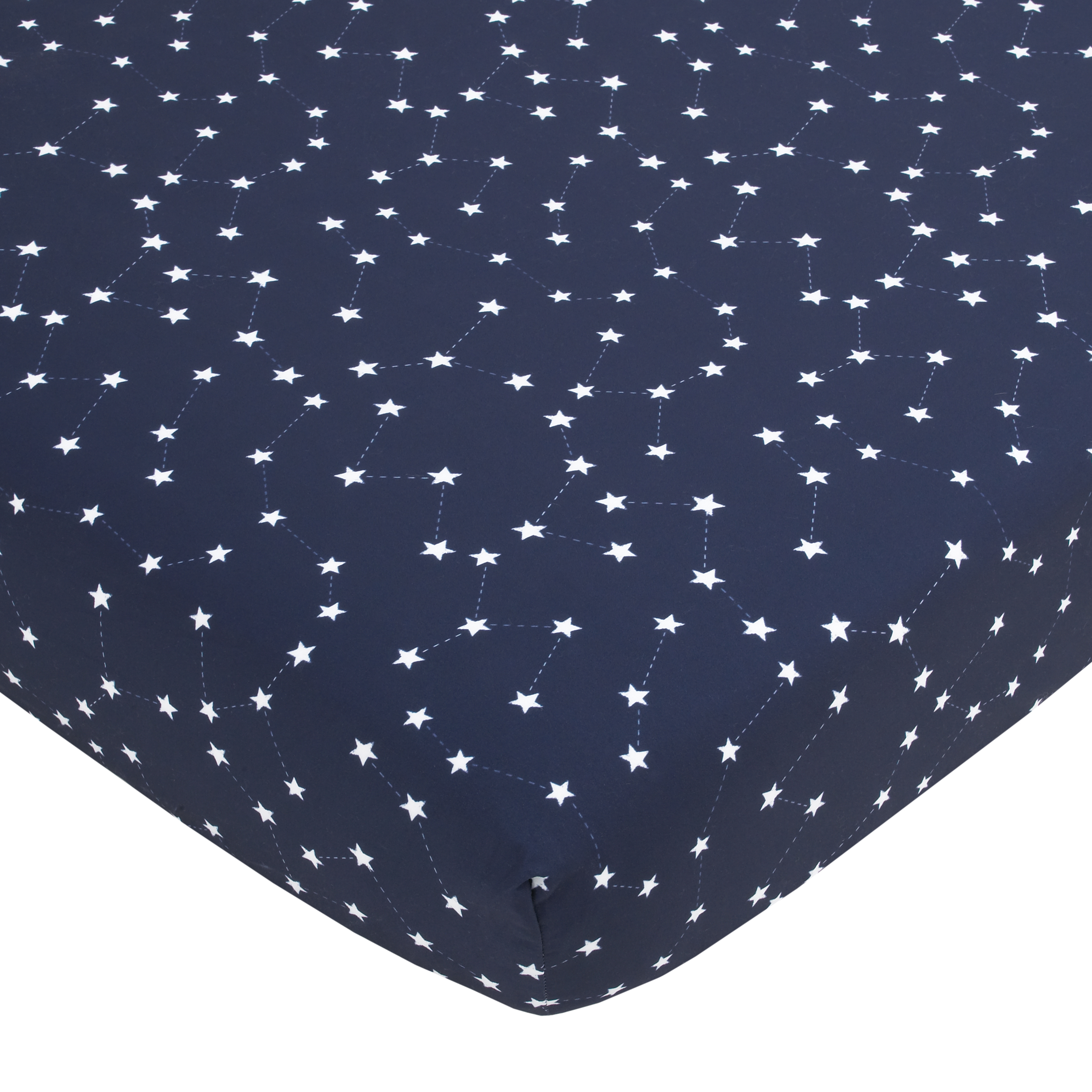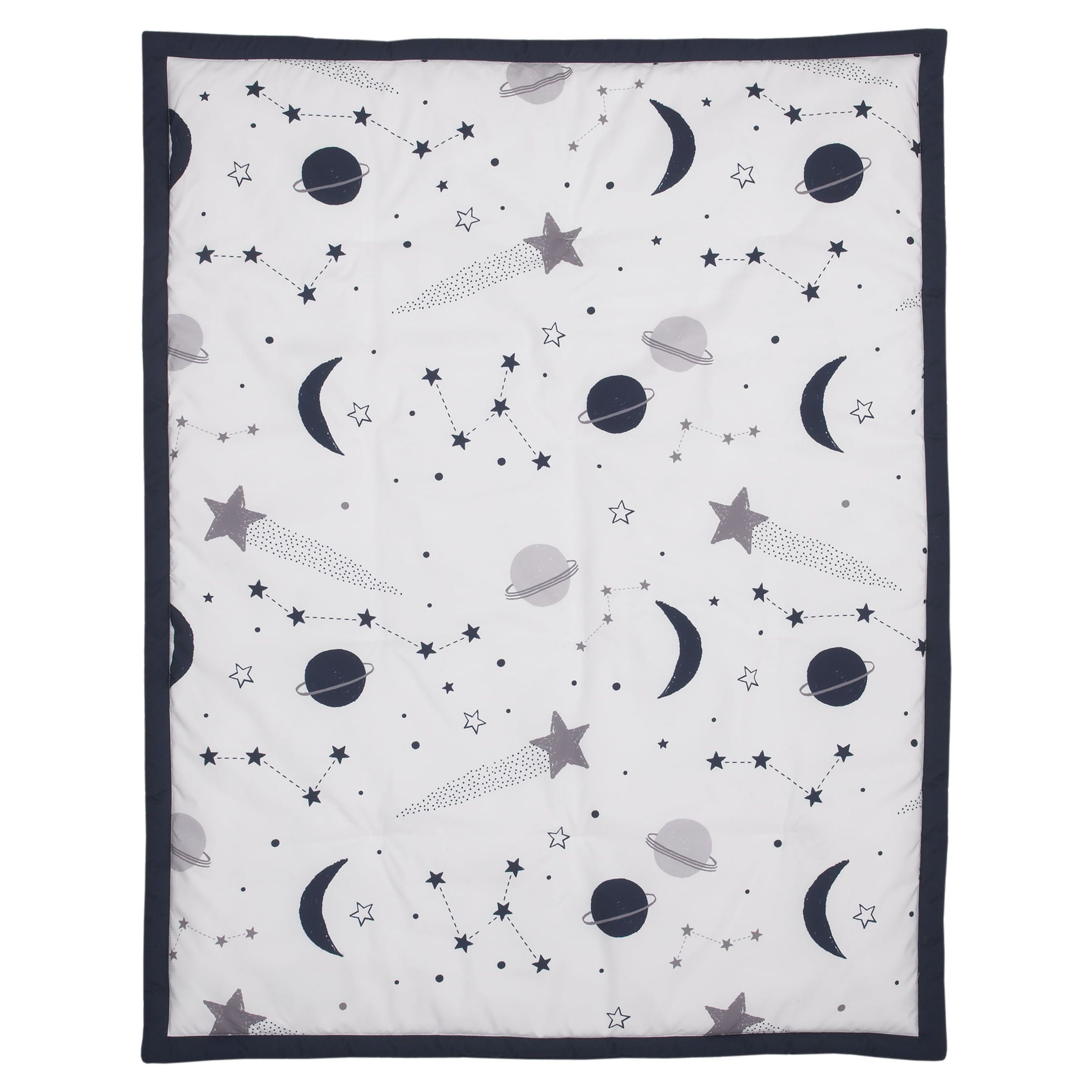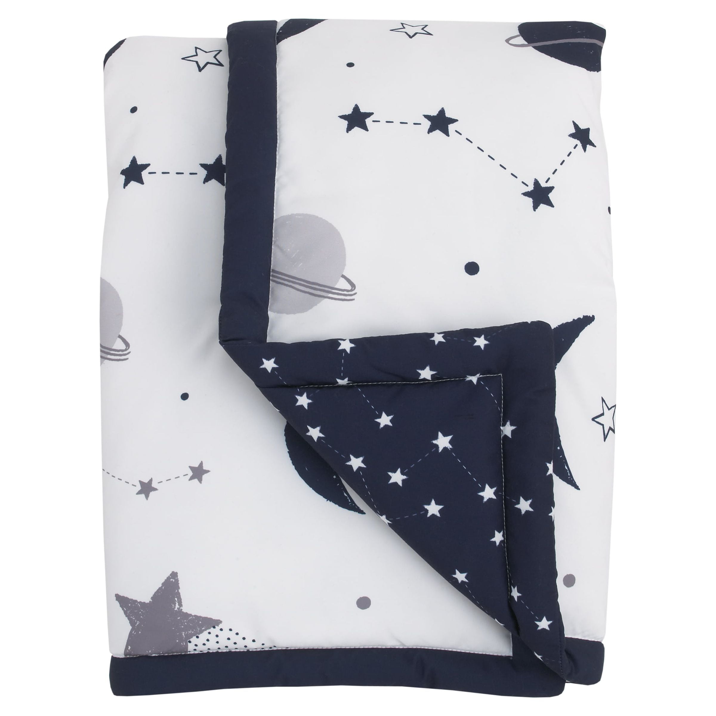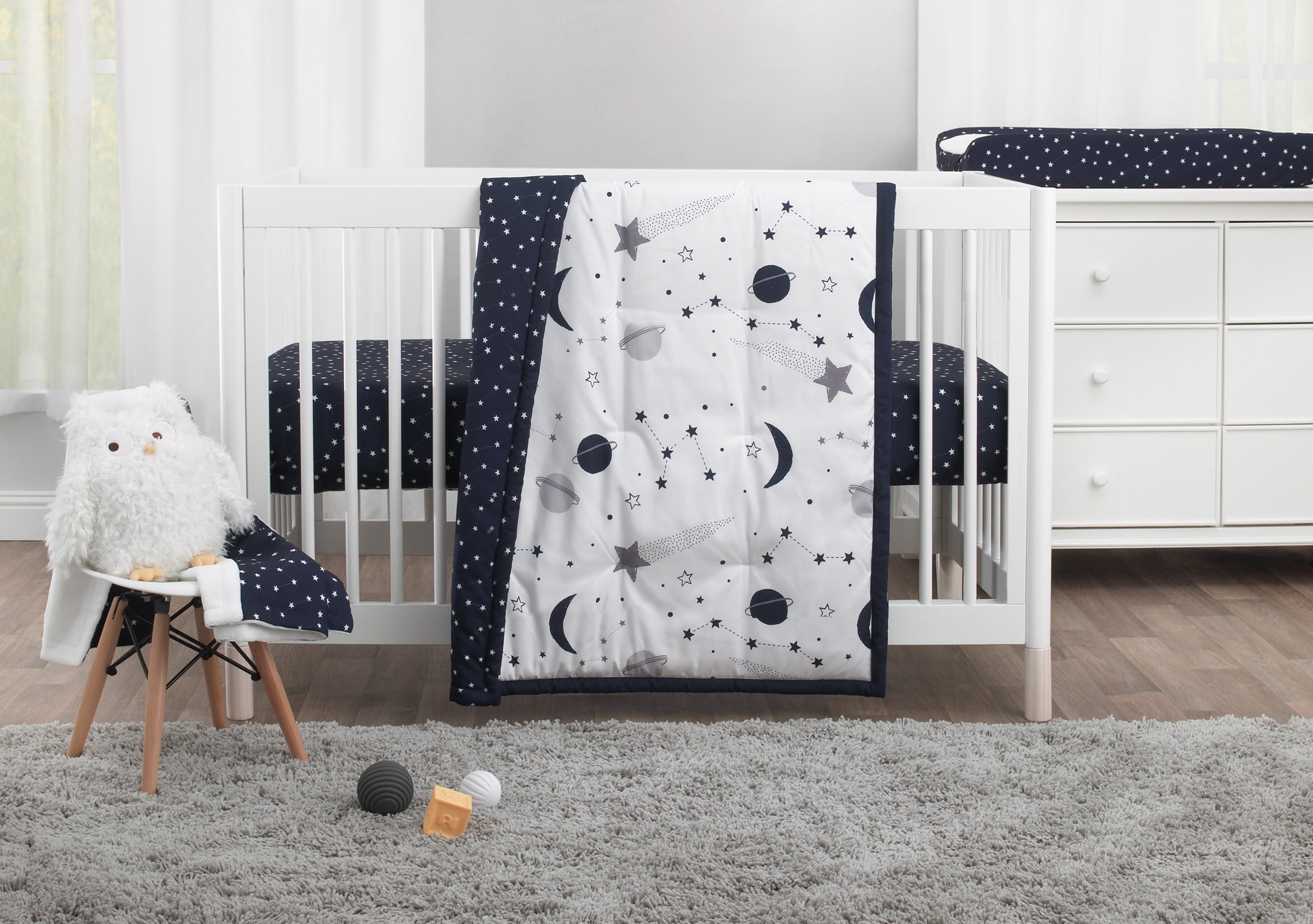 Modern Celestial Stars 3-Piece Crib Bedding Set, Navy, Grey, and White: Set includes a comforter, fitted crib sheet, and changing pad cover Set features a fun, modern celestial stars and moon theme in shades of navy, grey, and white Fits a standard crib mattress that measures 28″ x 52″ Comforter measures 33″ x 42″ Changing pad cover helps keep your changing pad clean