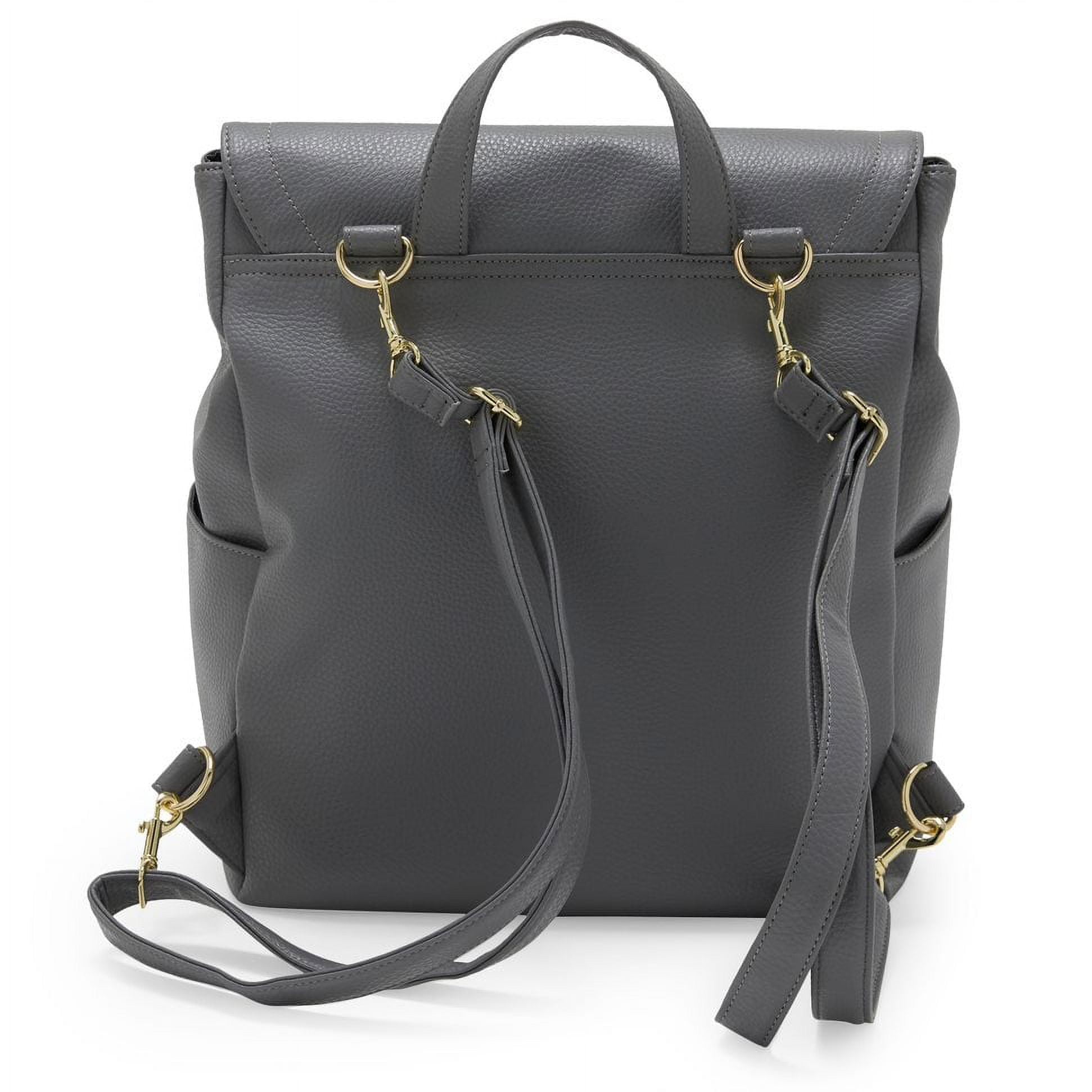 MoDRN Diaper Bag Backpack, Lotus: Stylish and sleek backpack style diaper bag Straps can convert from backpack to crossbody Magnetic flap closure, top zip main compartment closure, and interior zip pocket help keeps your items secure and organized Access your baby wipes quickly with the exterior wipe holder 2 outside and interior side pockets are great for storing extra bottles, snacks, toys, and more Features gold hardware Includes a large changing pad Changing pad dimensions: 26.5″ x 17″ x .125″ Overall dimensions: 13″ x 14.5″ x 6″ Made from vegan leather