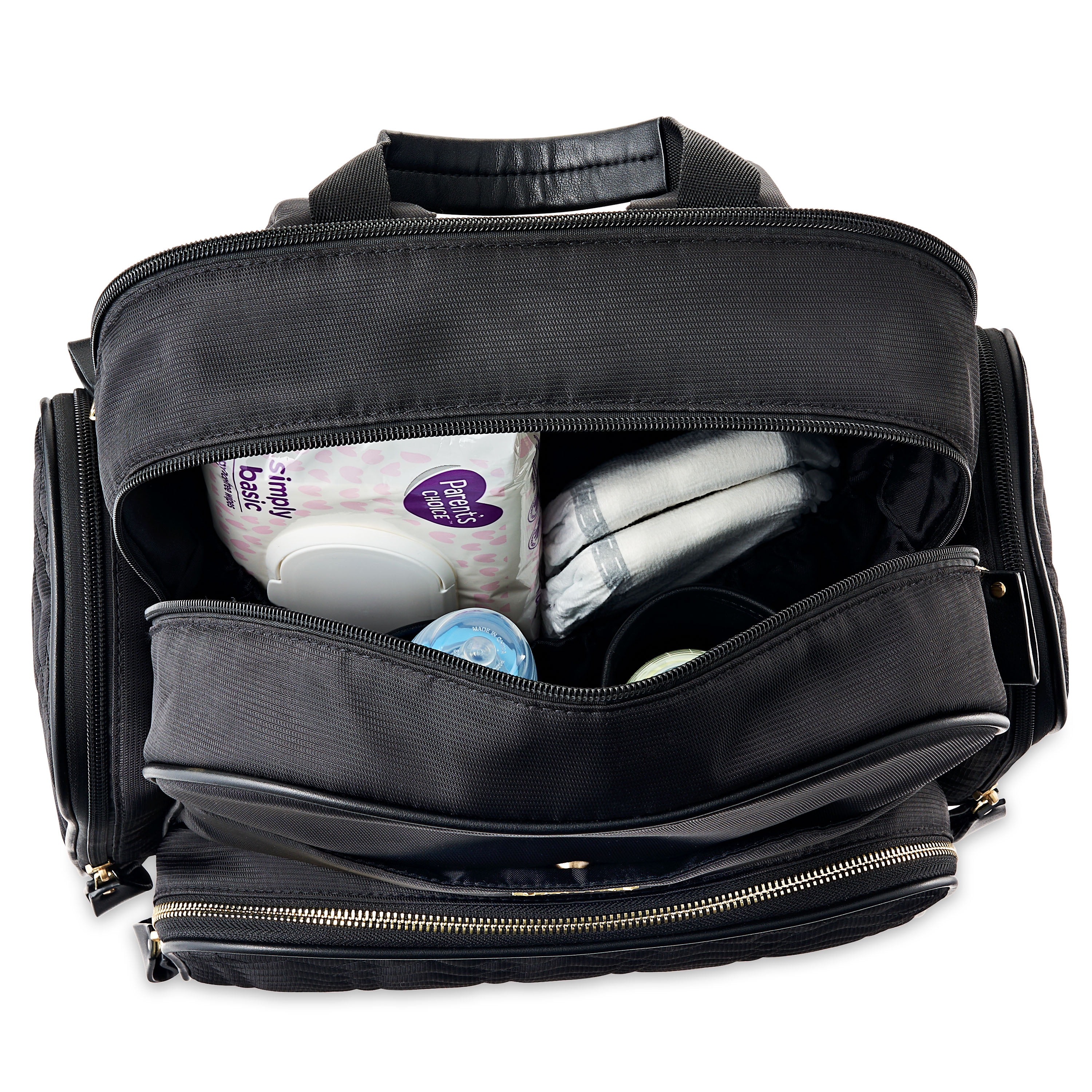Modrn Jamie Black Diaper Bag: Sleek, trendy design Main compartment has two pockets for bottles or snacks, and an extra pocket with zipper Also comes with a changing mat that folds up and fits in a pocket on the inside Additional compartment on the back of the diaper bag that’s perfect for keeping your personal belongings Comes with multiple pockets on the outside Includes adjustable straps Sleek, trendy design Side pocket are insulated Comes with large diaper changing pad