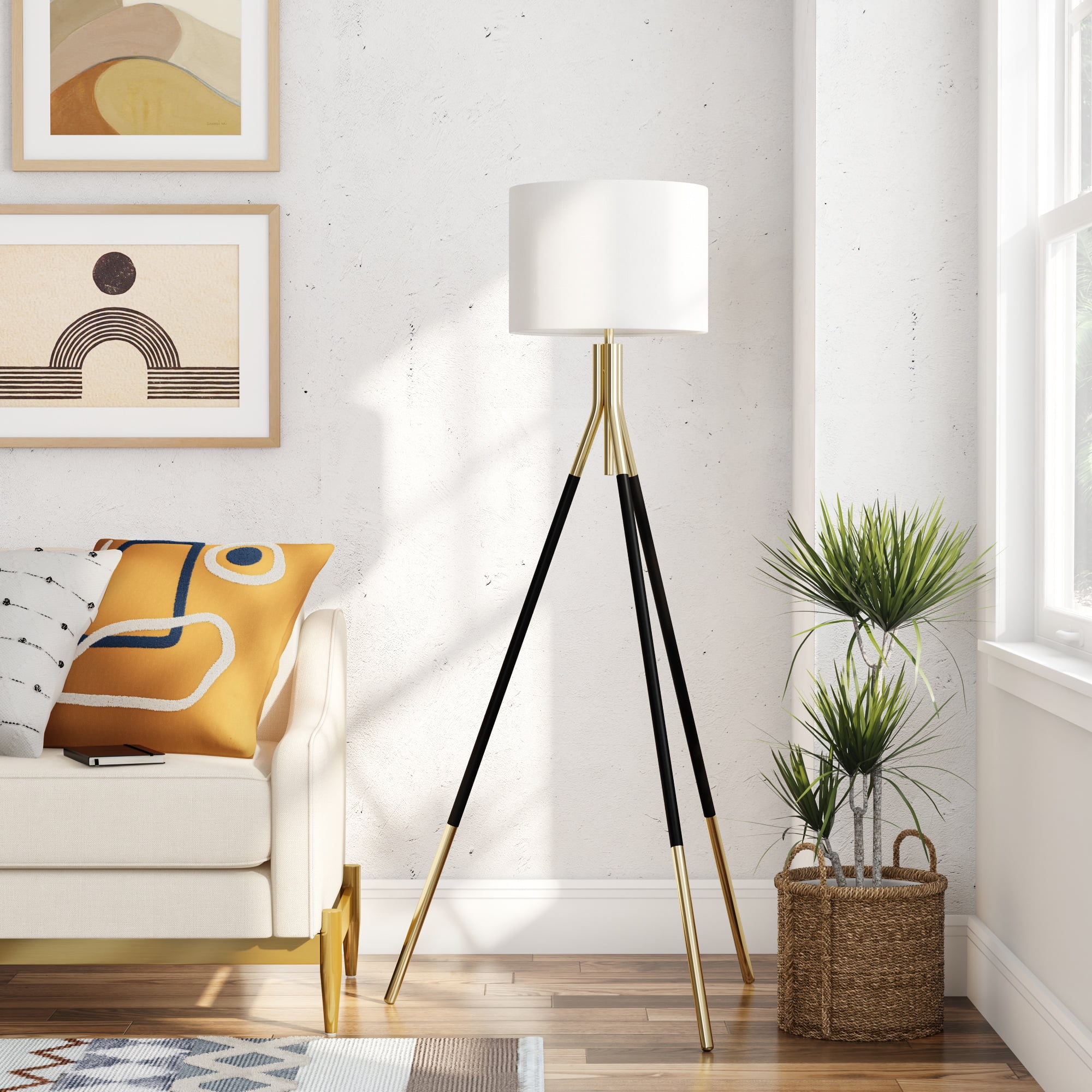 MoDRN Tripod Floor Lamp and Table Lamp Set, Black and Gold