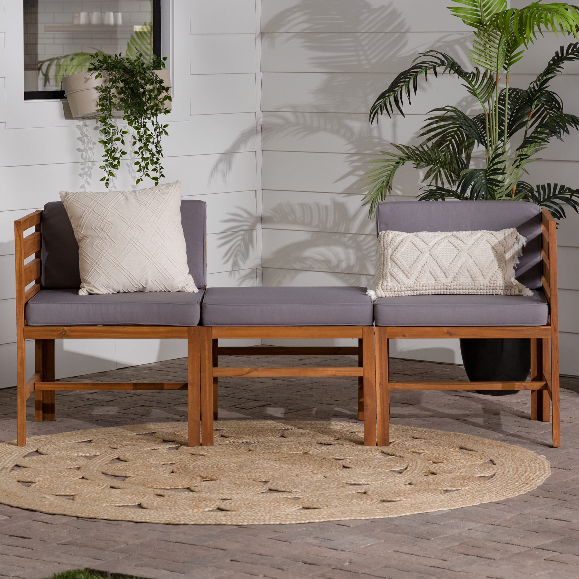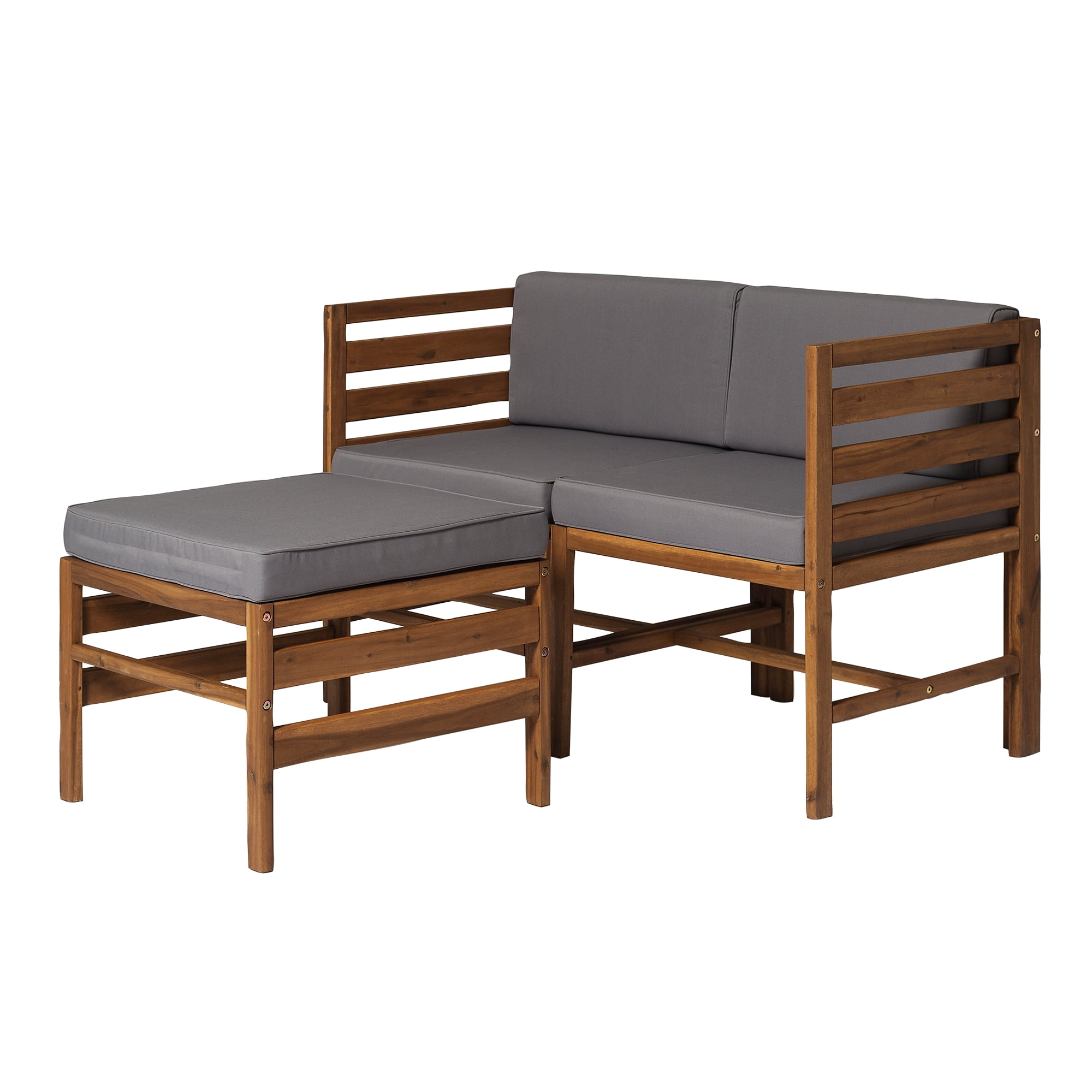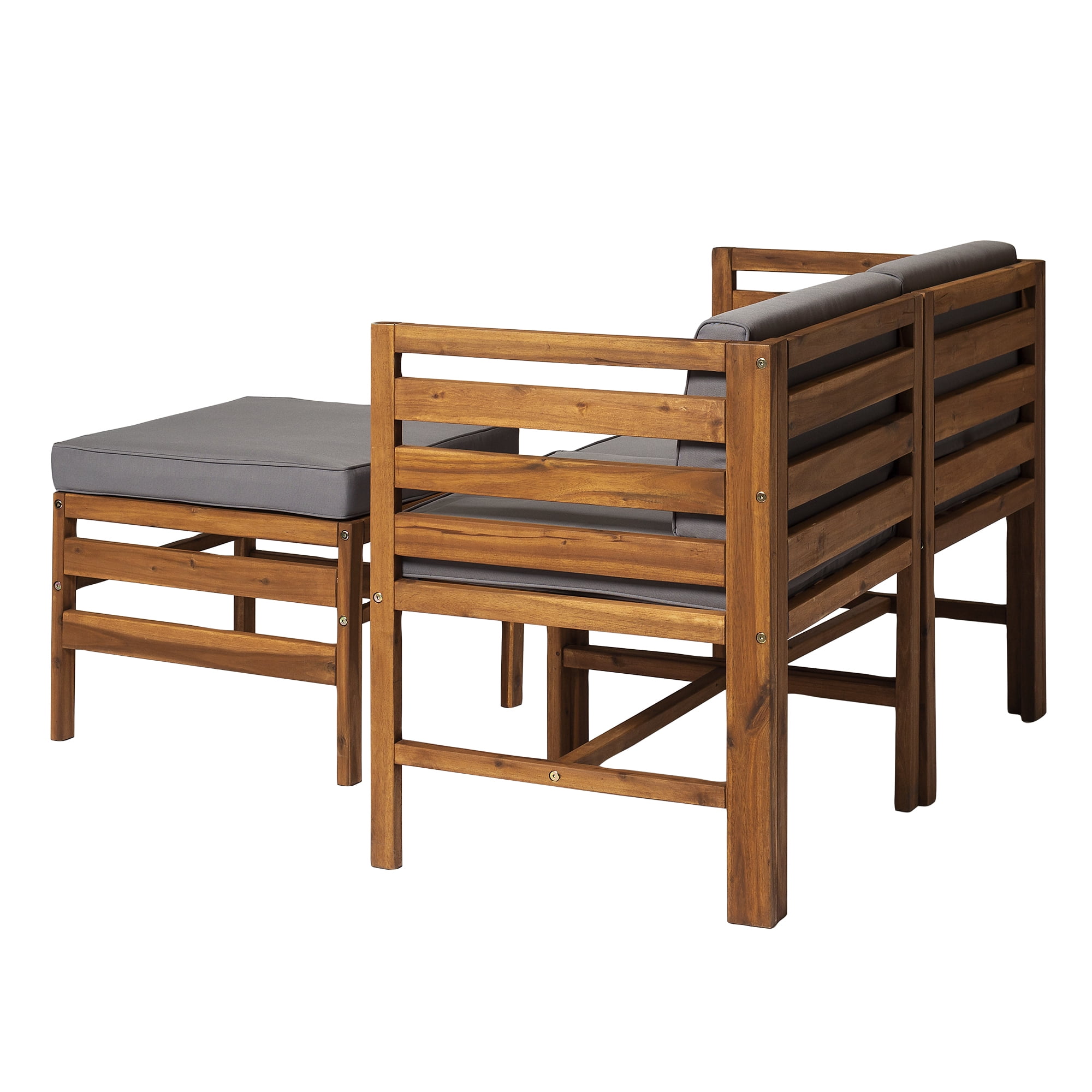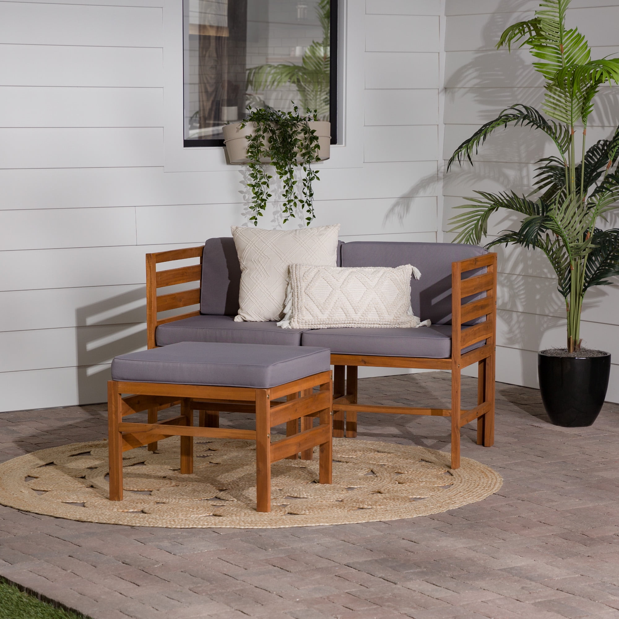 Naturally weather resistant acacia wood Hook and loop cushion fasteners Removable cushion covers Modular outdoor patio furniture Set includes two chairs and one ottoman Ships ready-to-assemble with step-by-step instructions