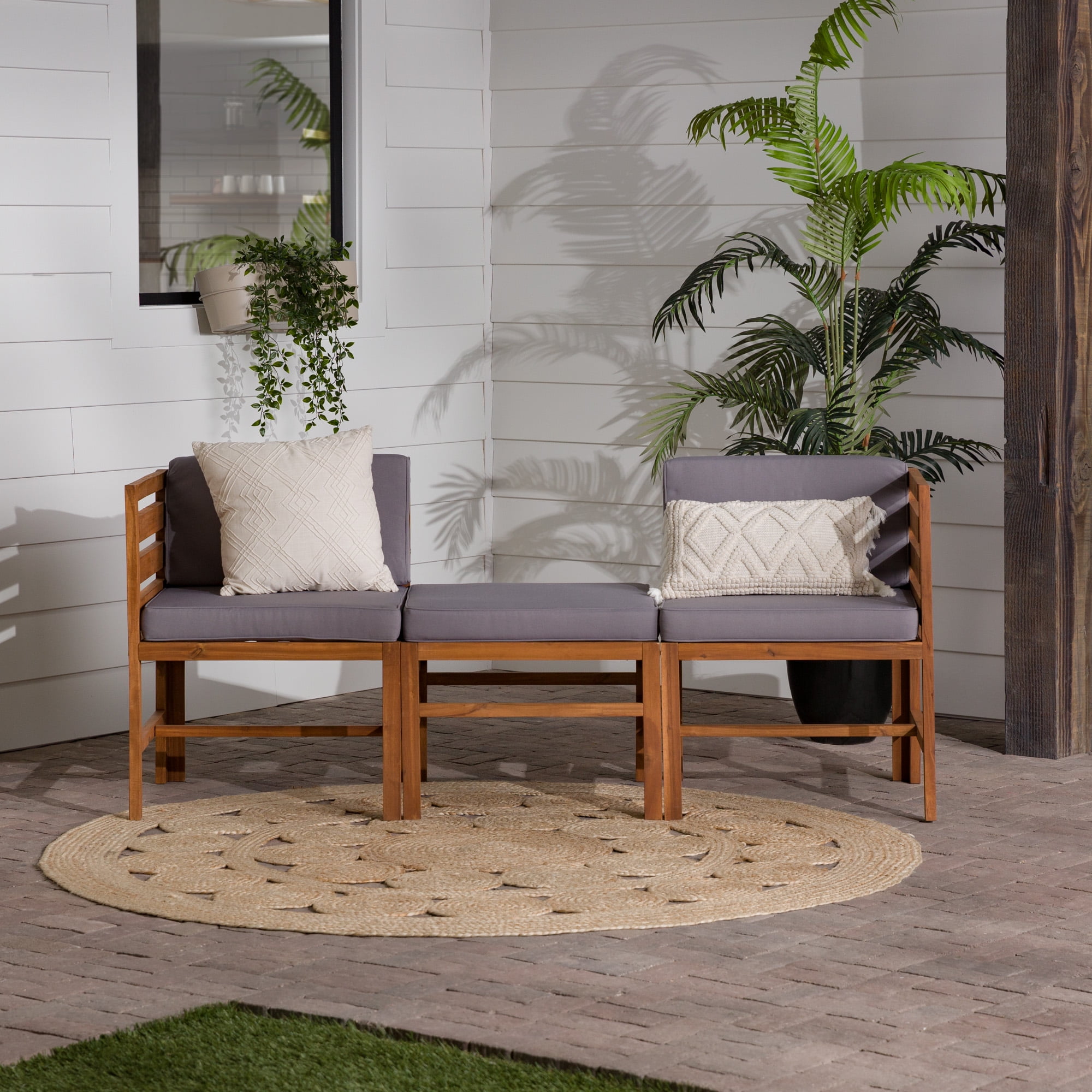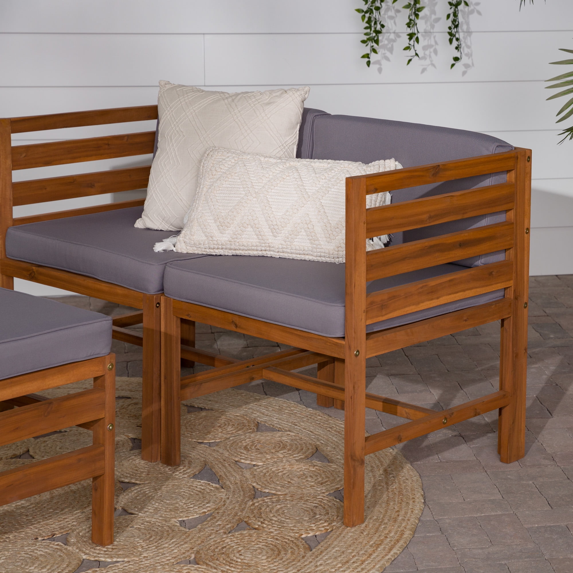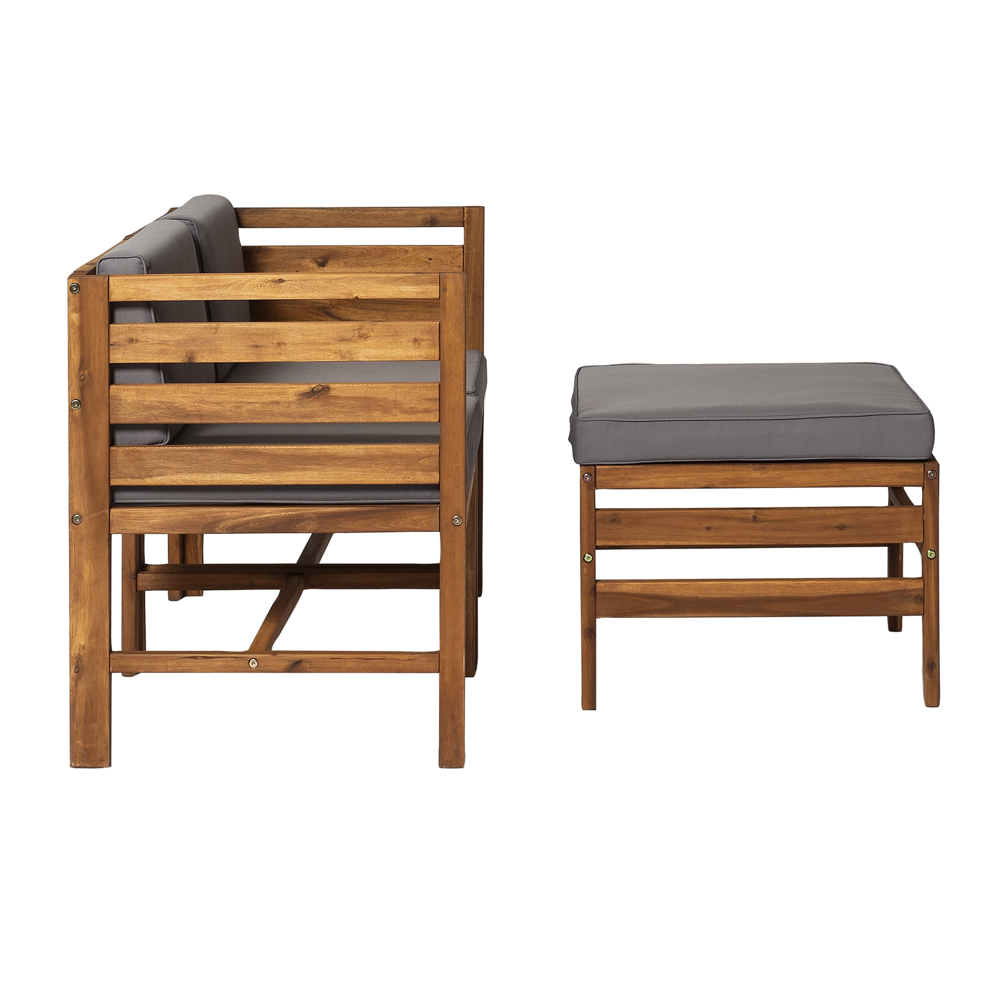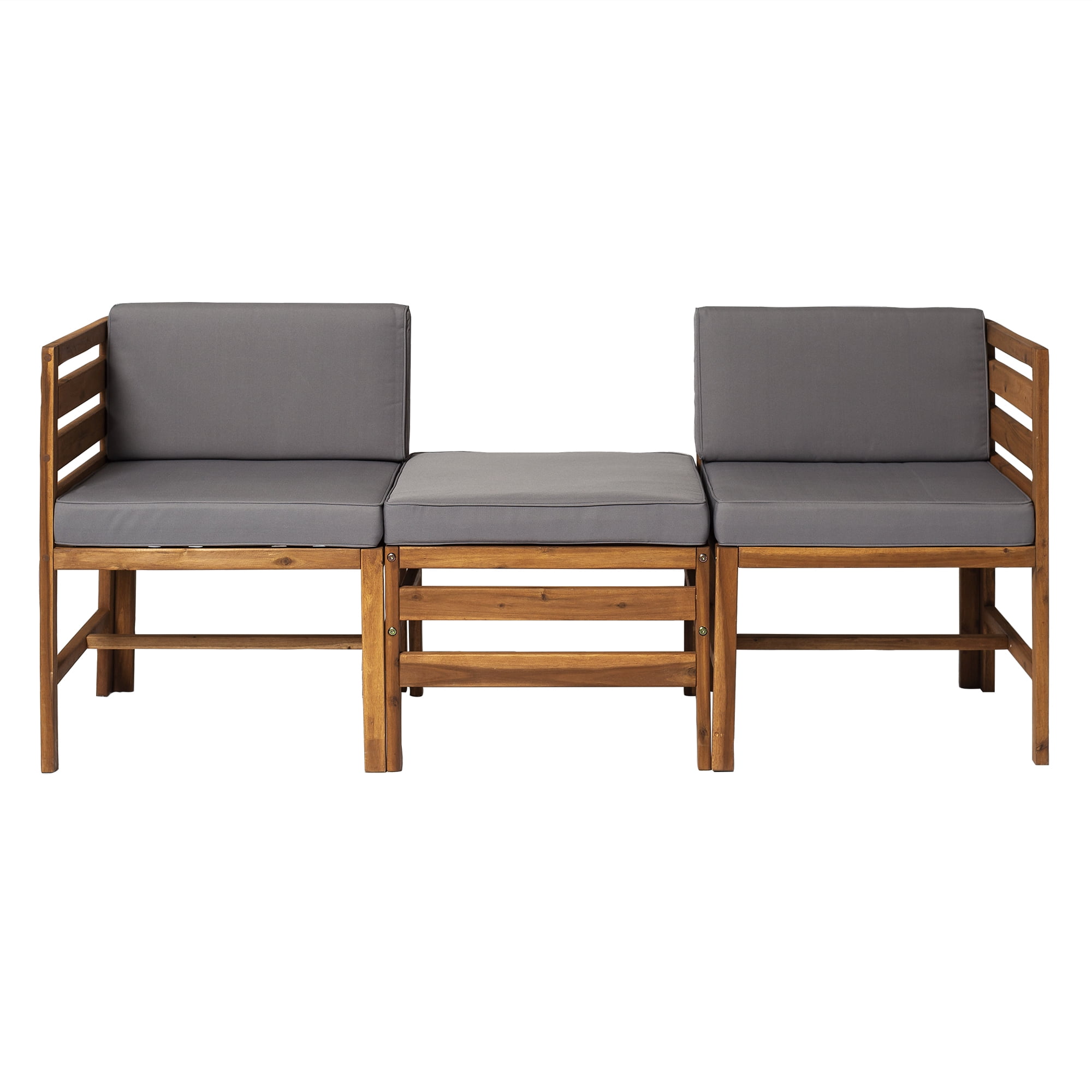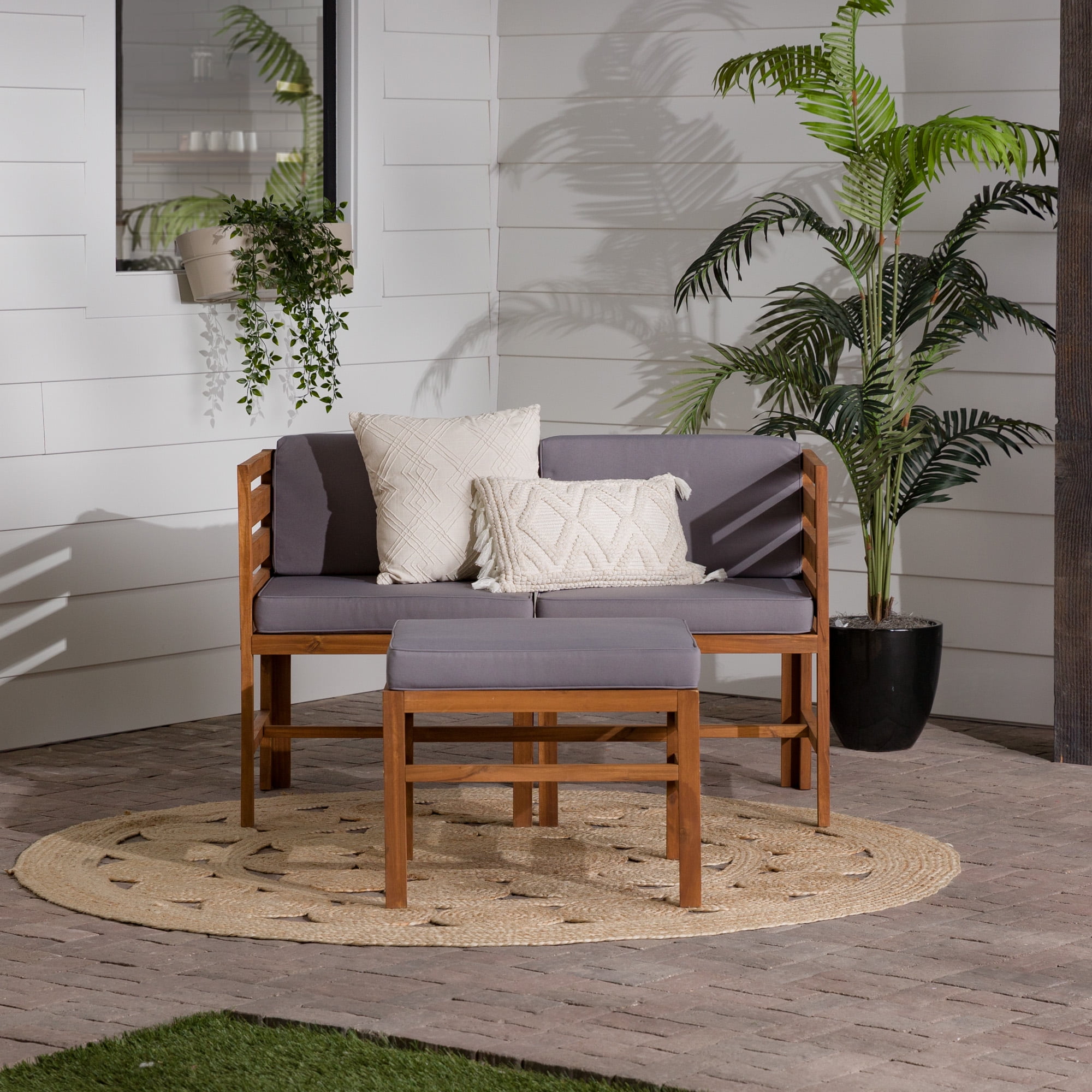 Naturally weather resistant acacia wood Hook and loop cushion fasteners Removable cushion covers Modular outdoor patio furniture Set includes two chairs and one ottoman Ships ready-to-assemble with step-by-step instructions