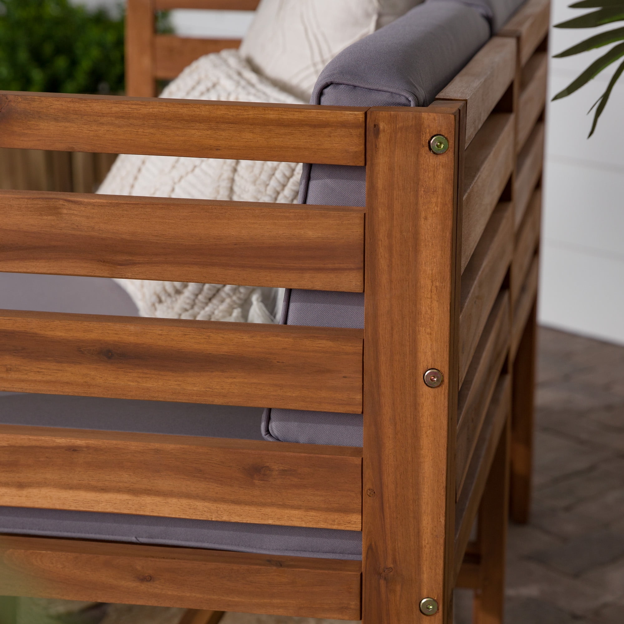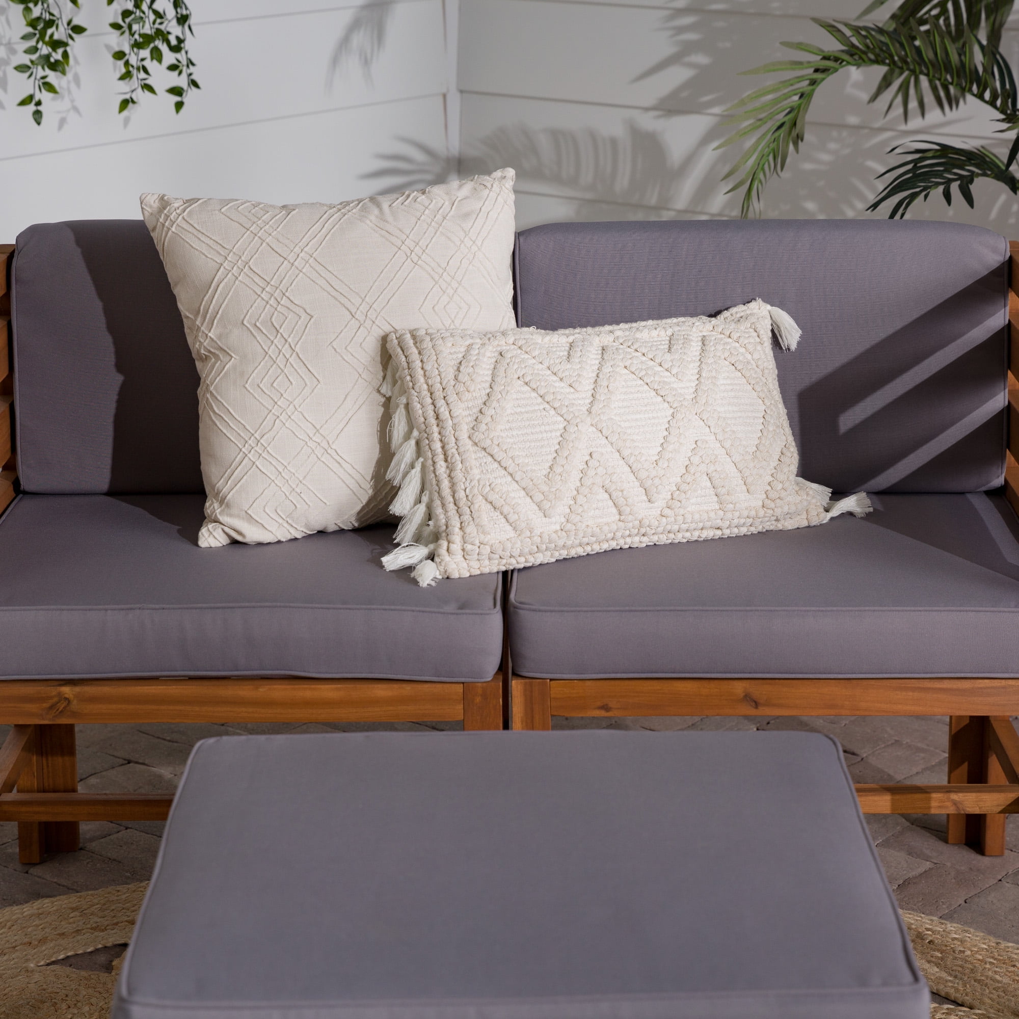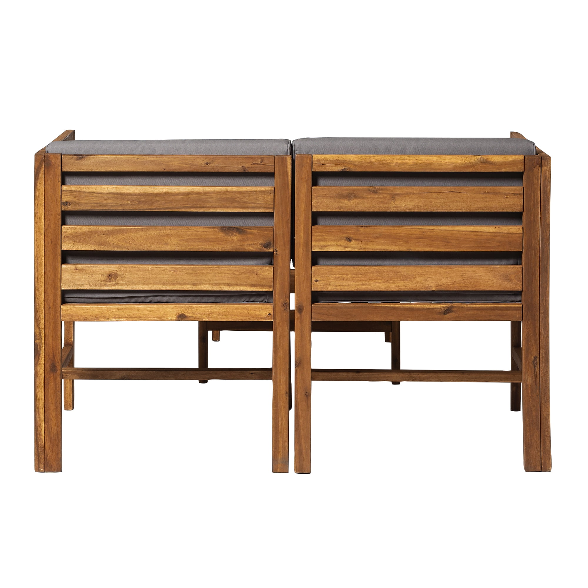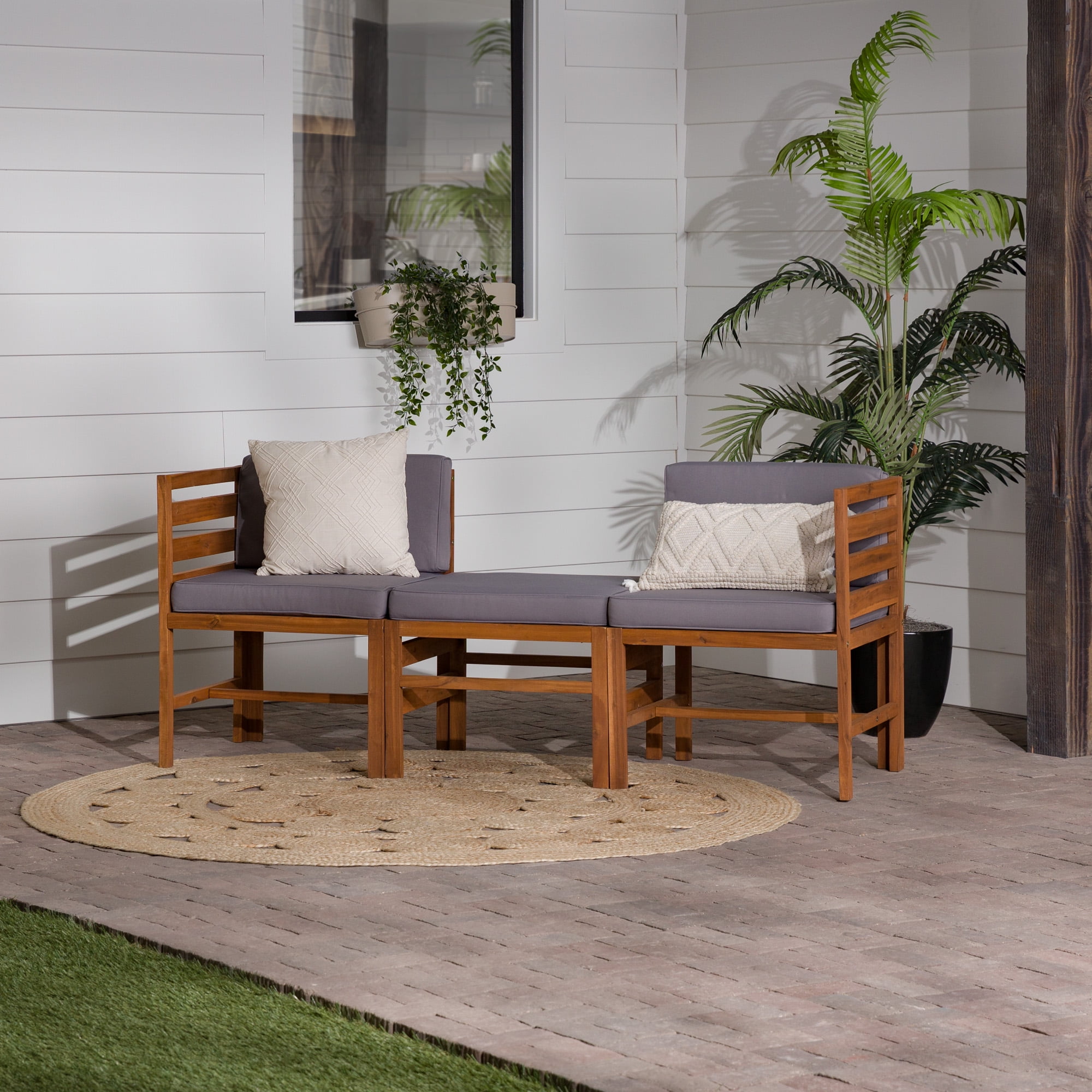 Naturally weather resistant acacia wood Hook and loop cushion fasteners Removable cushion covers Modular outdoor patio furniture Set includes two chairs and one ottoman Ships ready-to-assemble with step-by-step instructions