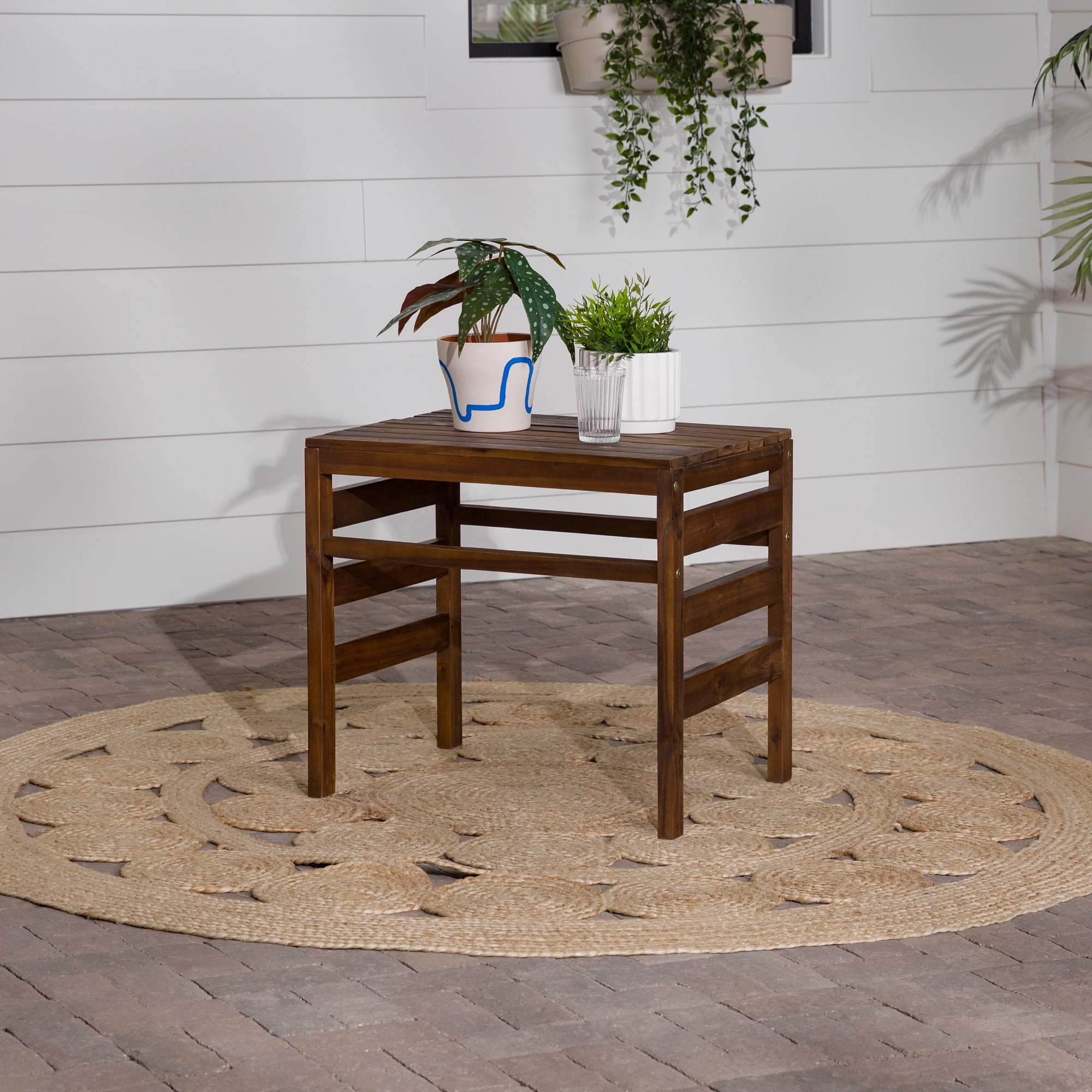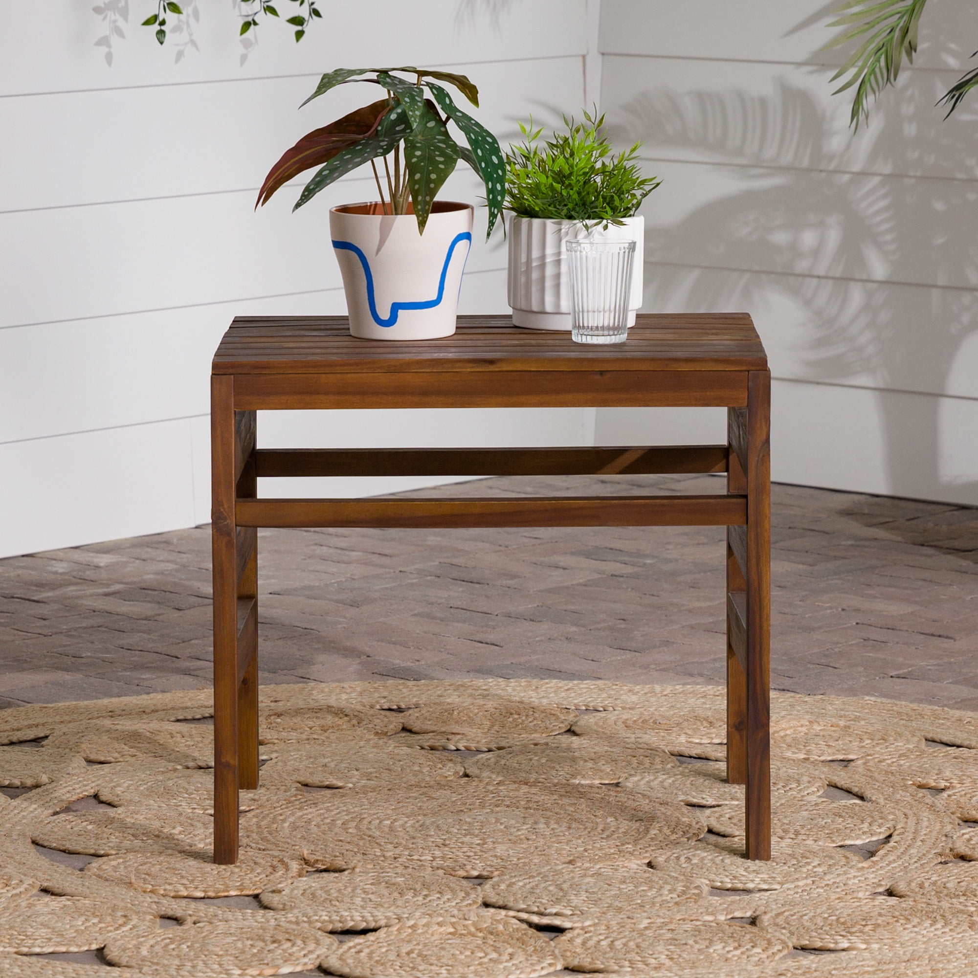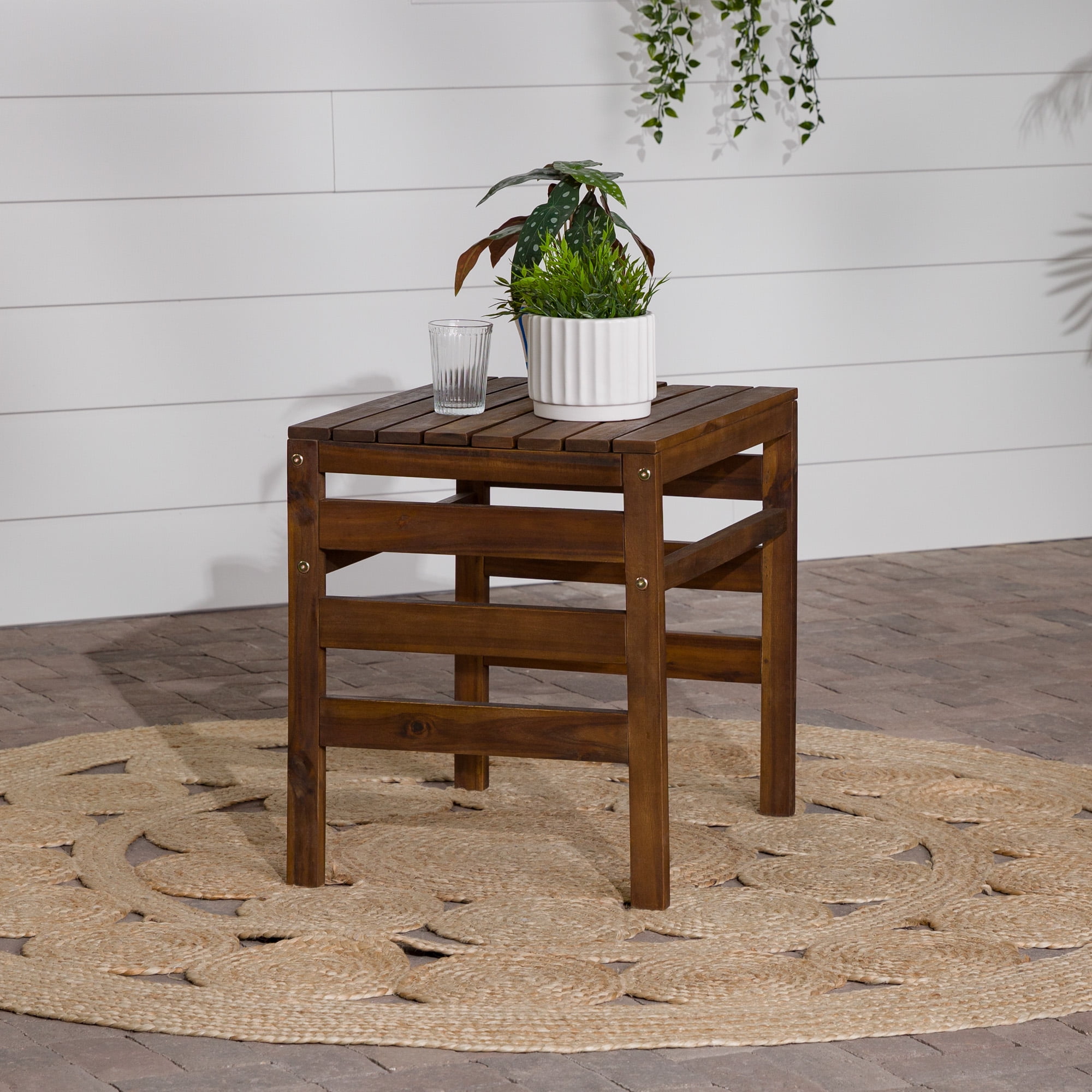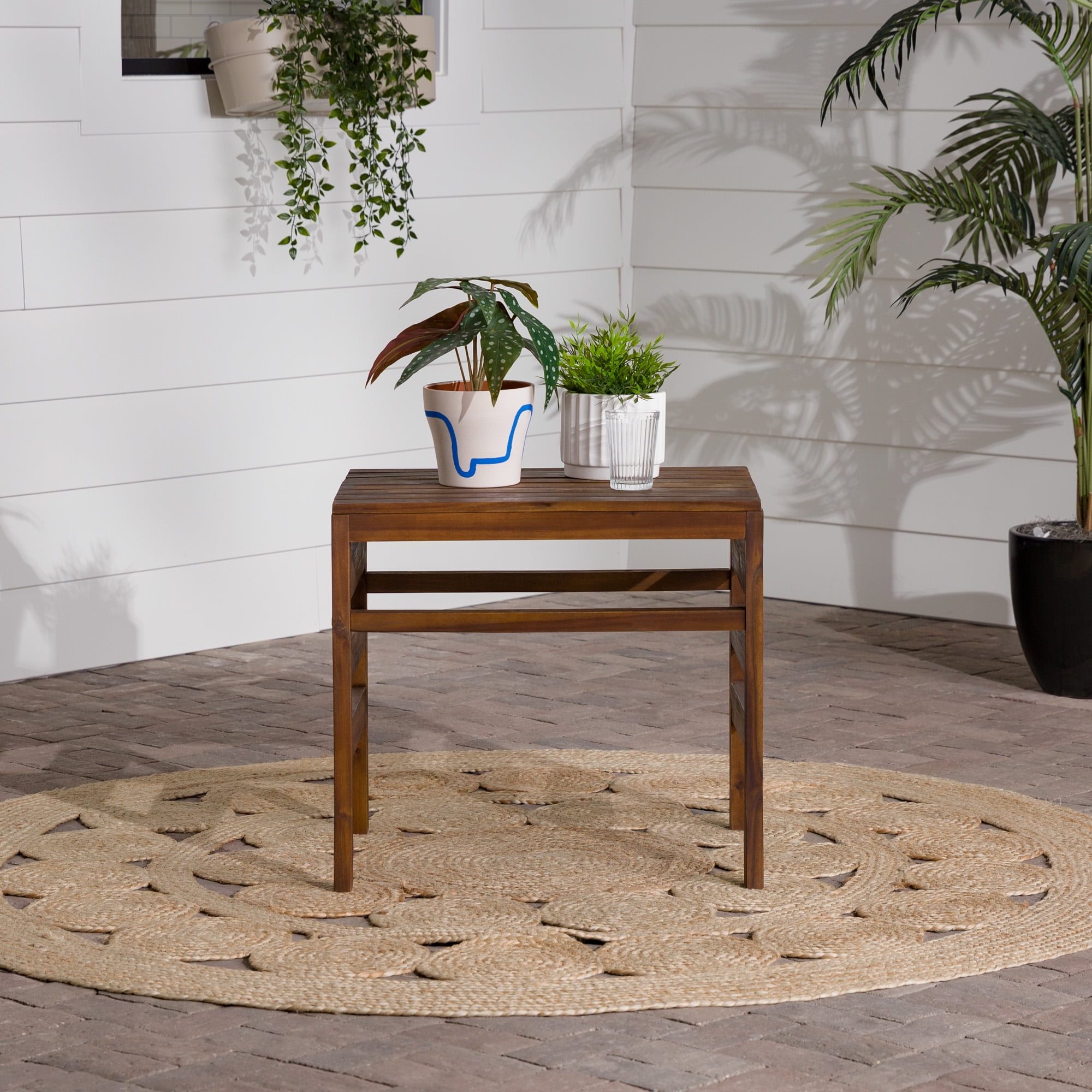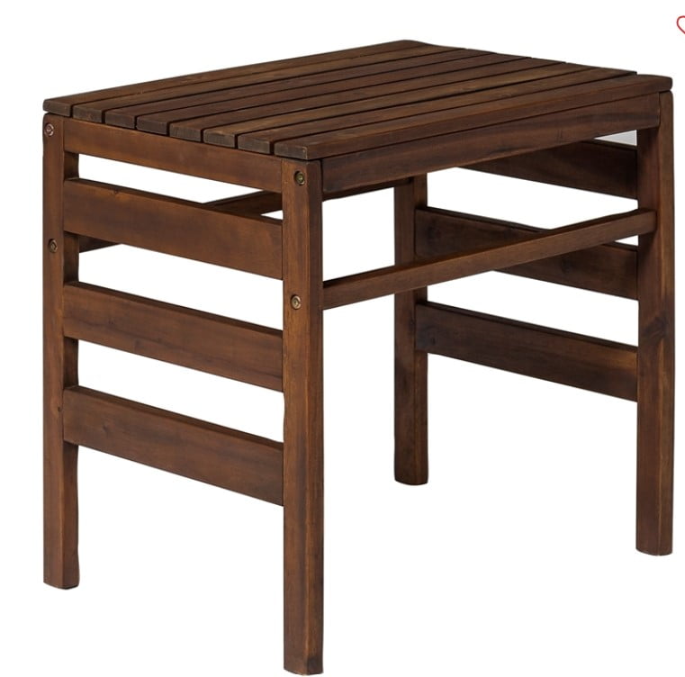 Modular Outdoor Dark Brown Acacia End Table by Manor Park Naturally weather-resistant stained acacia wood Slat style patio side table Apply teak oil every 2-3 months Part of a modular outdoor patio set Keep out of extreme weather conditions Ships ready-to-assemble with step-by-step instructions 22″ H x 18″ L x 24″ W 13 lbs