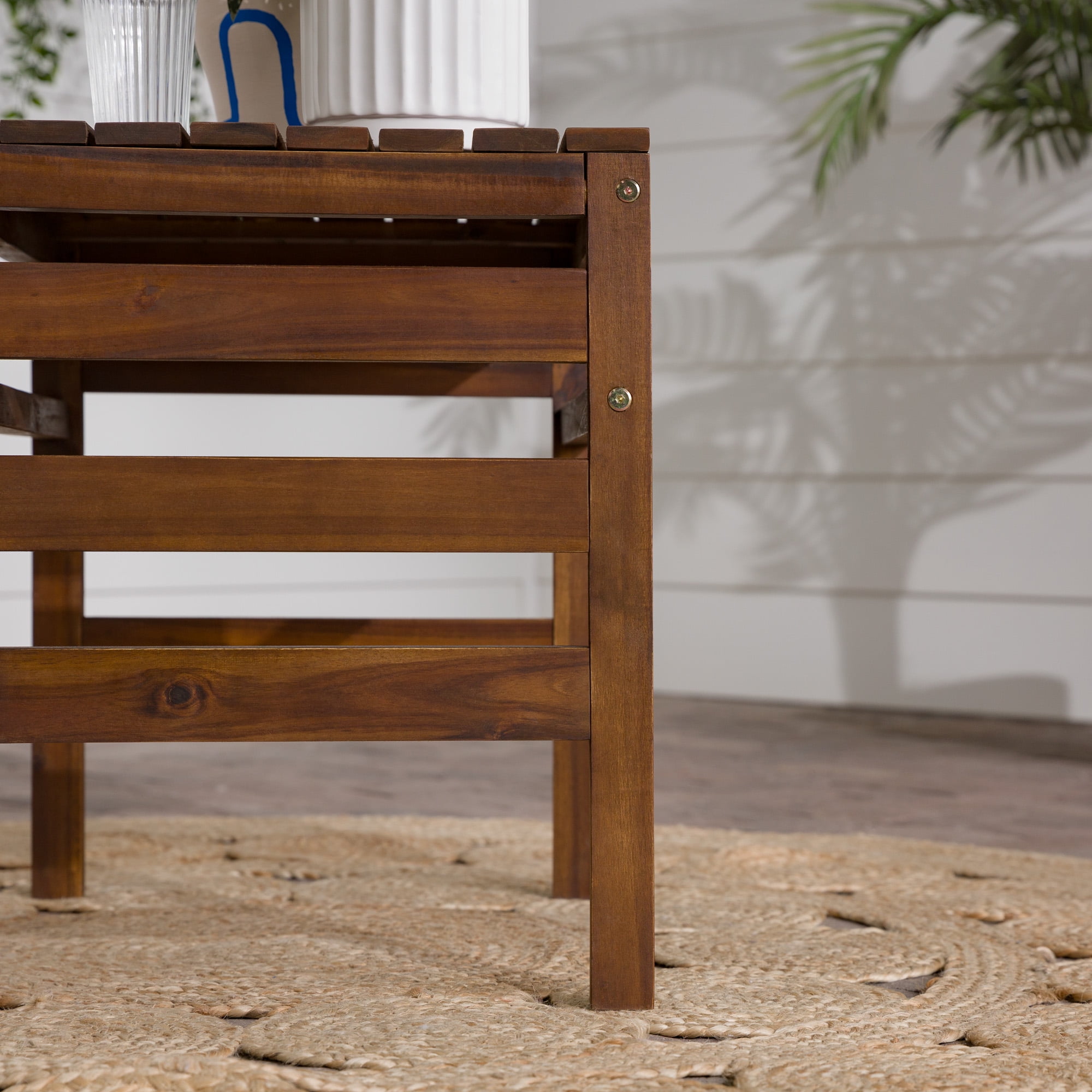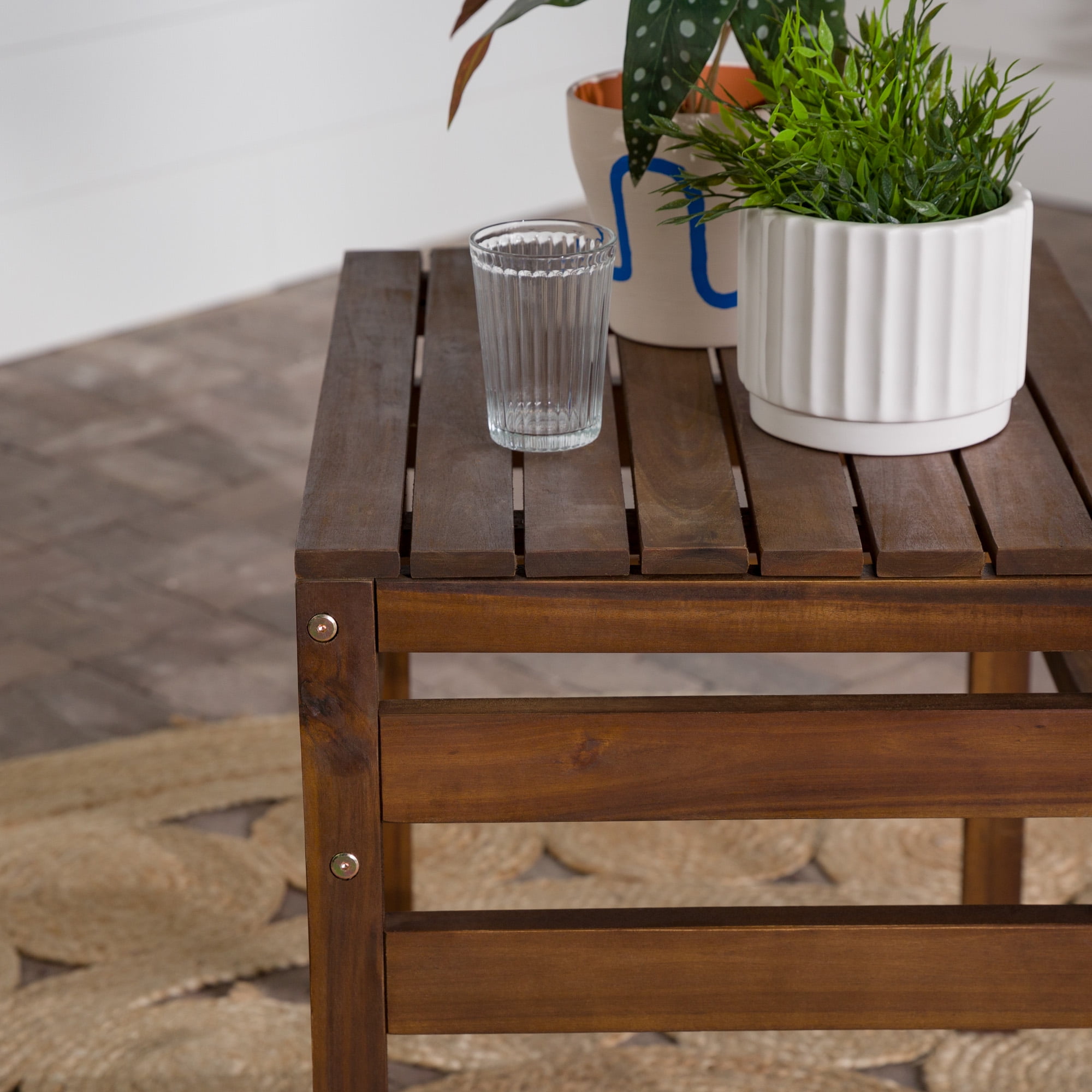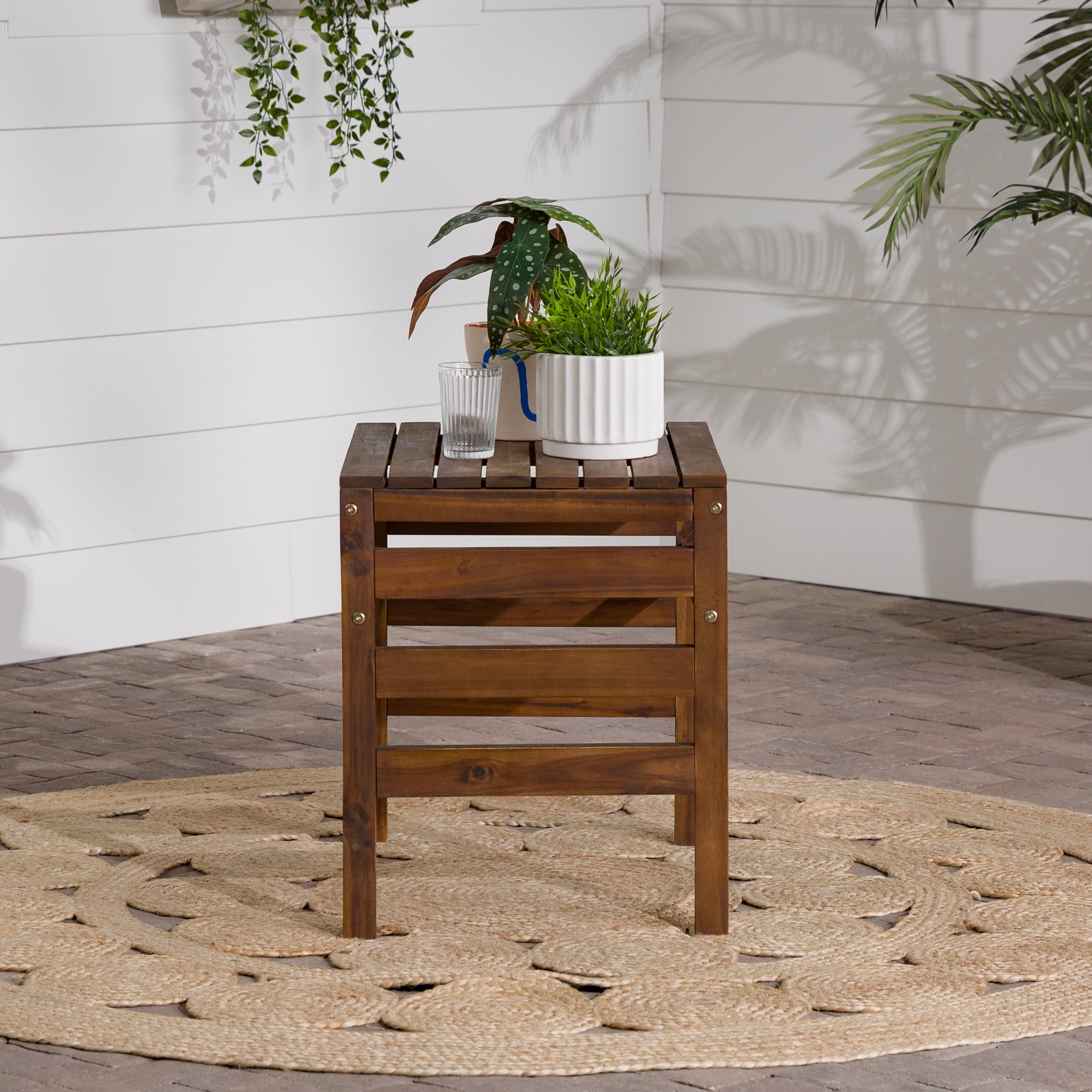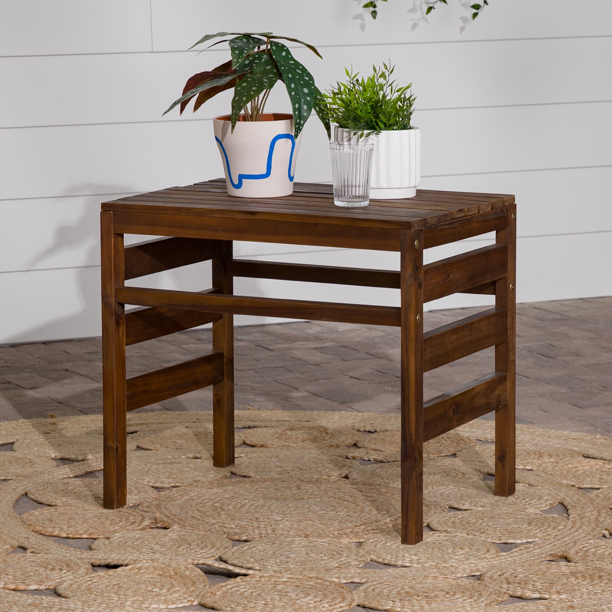 Modular Outdoor Dark Brown Acacia End Table by Manor Park Naturally weather-resistant stained acacia wood Slat style patio side table Apply teak oil every 2-3 months Part of a modular outdoor patio set Keep out of extreme weather conditions Ships ready-to-assemble with step-by-step instructions 22″ H x 18″ L x 24″ W 13 lbs