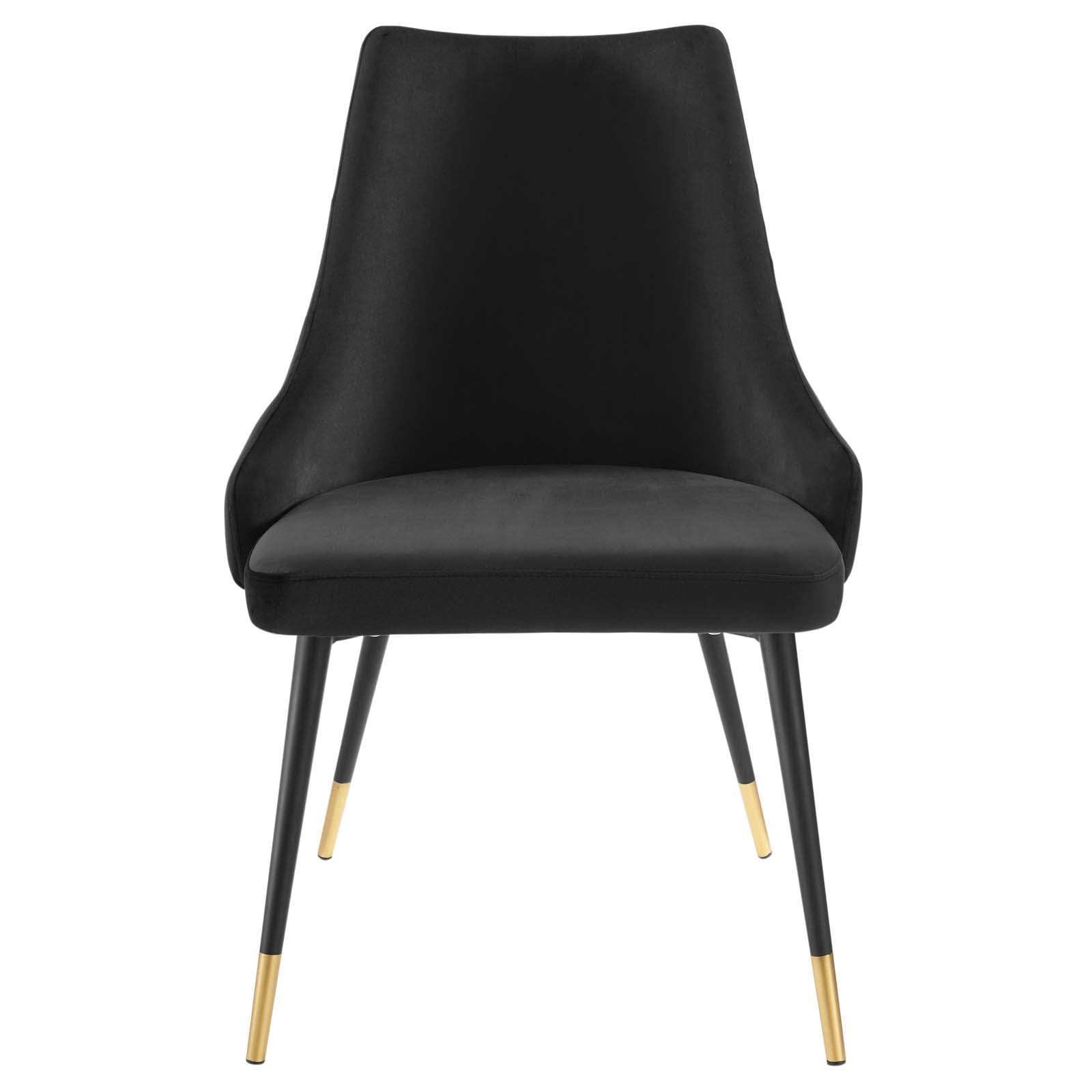 Revitalize dining decor or your living space with the Adorn Tufted Performance Velvet Dining Side Chair. Classic button tufting along the chair’s exterior and graceful sweeping lines blend seamlessly into the lush comfort of this dining chair. With soft stain-resistant performance velvet upholstery, this accent chair offers a comfortable place to rest with dense foam padding. Sitting on four black tapered legs with gold foot sleeves, Adorn’s versatile vintage modern style and glam deco charm makes this side chair ideally suited for a variety of rooms. Place this velvet chair around the dining table, or use it as an accent chair in the living room, bedroom or entryway, or update your home office seating with use as a cute desk chair. This modern dining chair supports up to 300 lbs. and is complete with non-marking foot caps to protect your flooring. No assembly required.