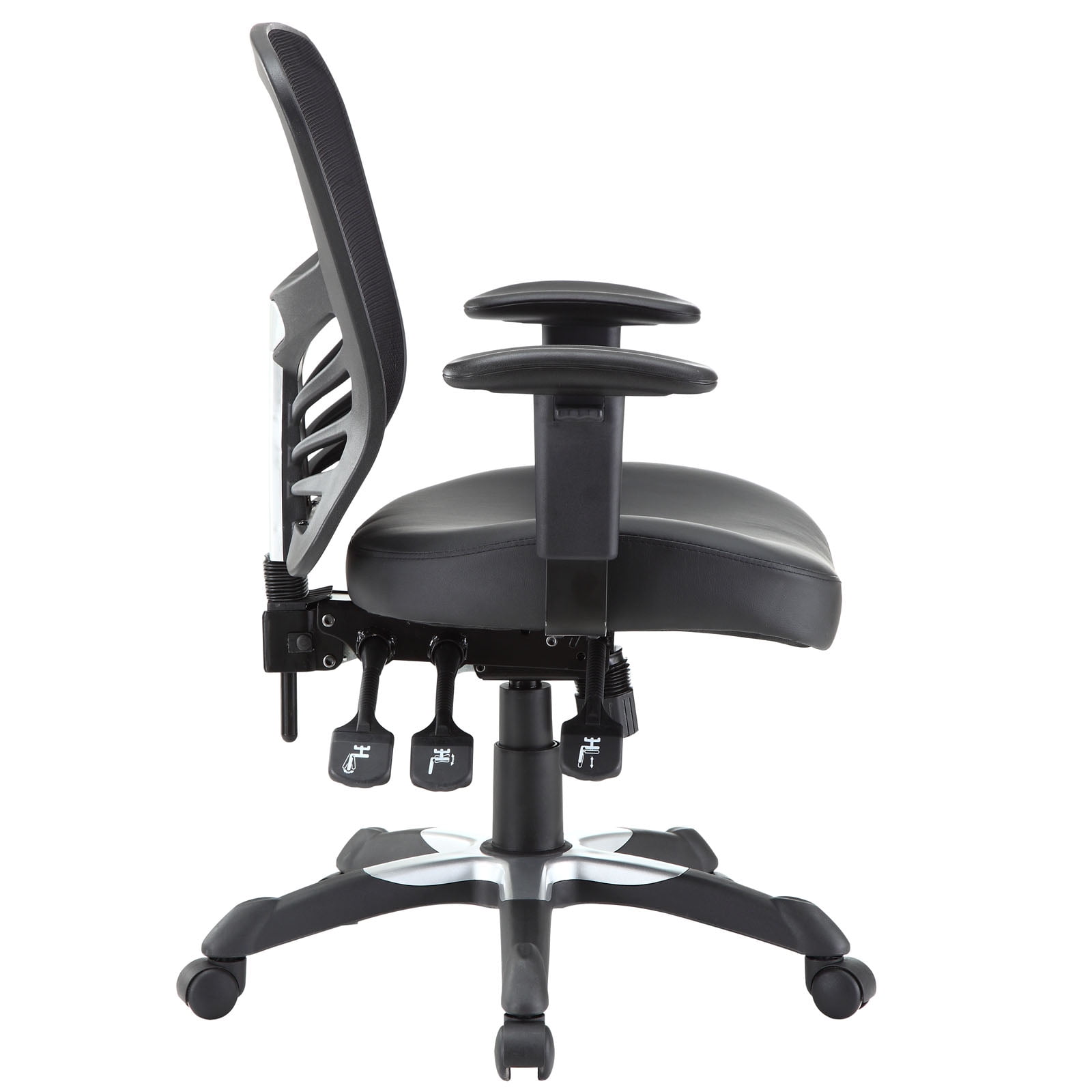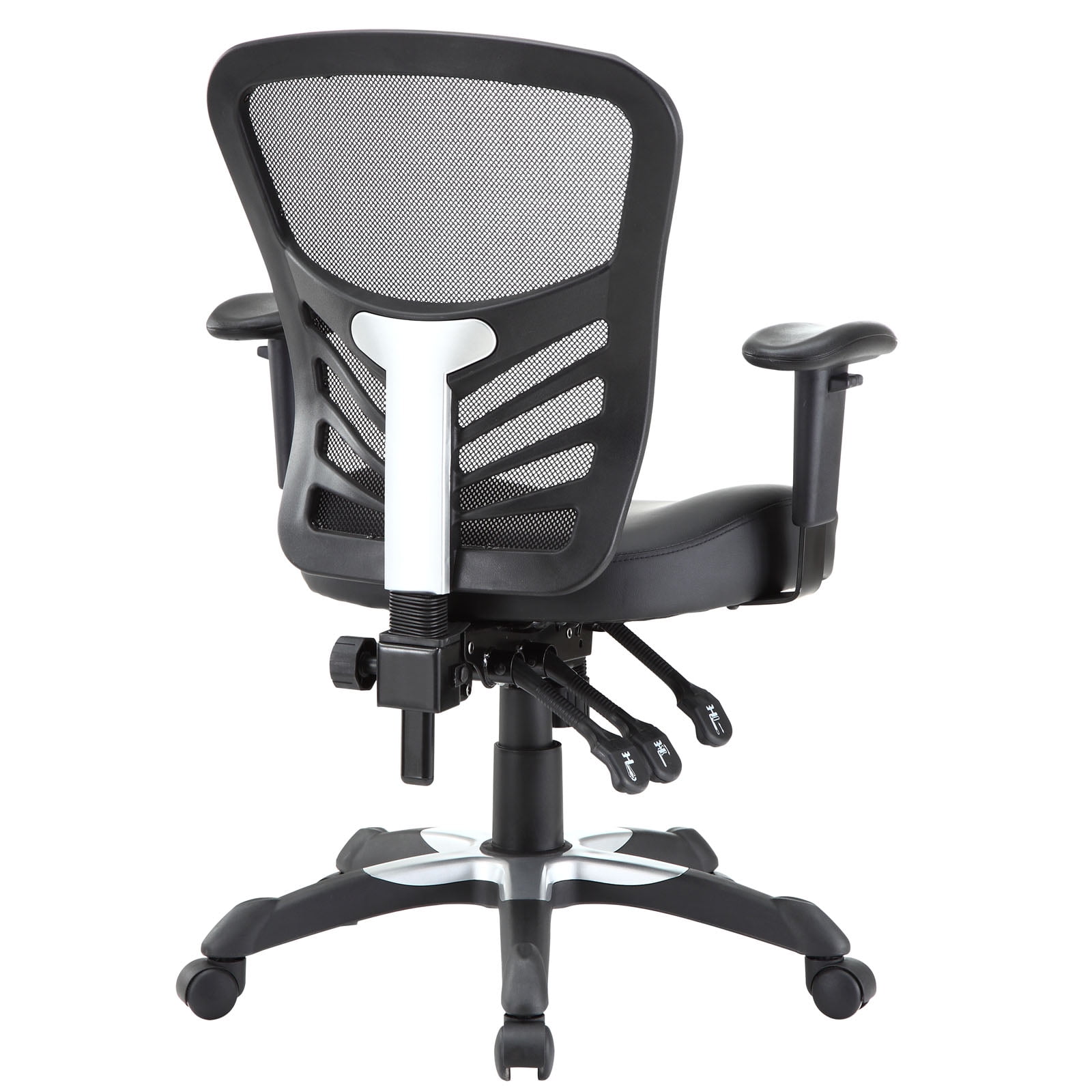 Mark a turning point in your office tasks with this upright and ergonomic mesh office chair. Let the breathable mesh back and plush vinyl seat serve as a simple extension to your everyday work ventures. The back height and seat depth are both easily adjustable to fit your height and size, while two sturdy armrests are height adjustable to assist your vertical seat posturing. Articulate also includes tilt tension and lock functions to recline and incline comfortably as needed. Fitted with five hooded dual-caster wheels, give yourself the ability to easily glide over carpeted floors while naturally performing tasks without exertion.