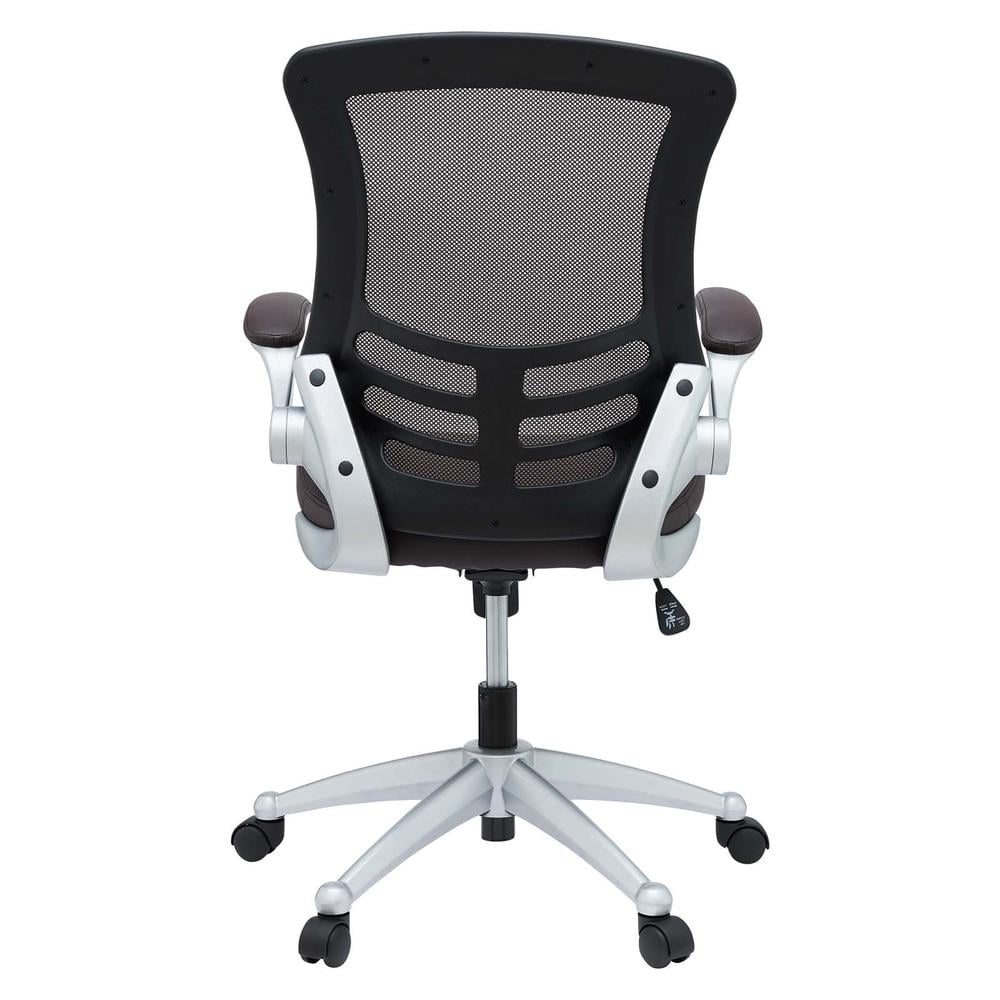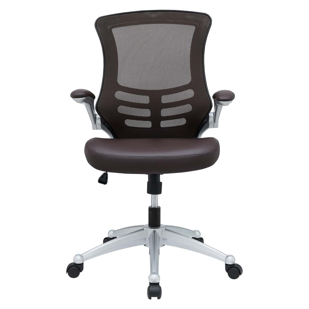 Taking you where you need when you need it most. The Attainment Office Chair is a form-fitting ergonomic chair made from the most revolutionary advances in seating today. The breathable mesh back is curved to assist back and shoulder posture, while the lower frame provides exemplary lumbar support. With flip-up arms and a leatherette padded waterfall seat, enjoy your work from a place of comprehensive comfort. Features: Materials: Vinyl Finish: Brown Breathable mesh back Sponge seat covered with black leatherette Flip-up padded arms Seat tilt with tension control Adjustable seat height Dual-wheel casters Specifications: Product Dimensions: 42.5″H x 26.5″W x 26.5″D Product Weight: 30 lbs