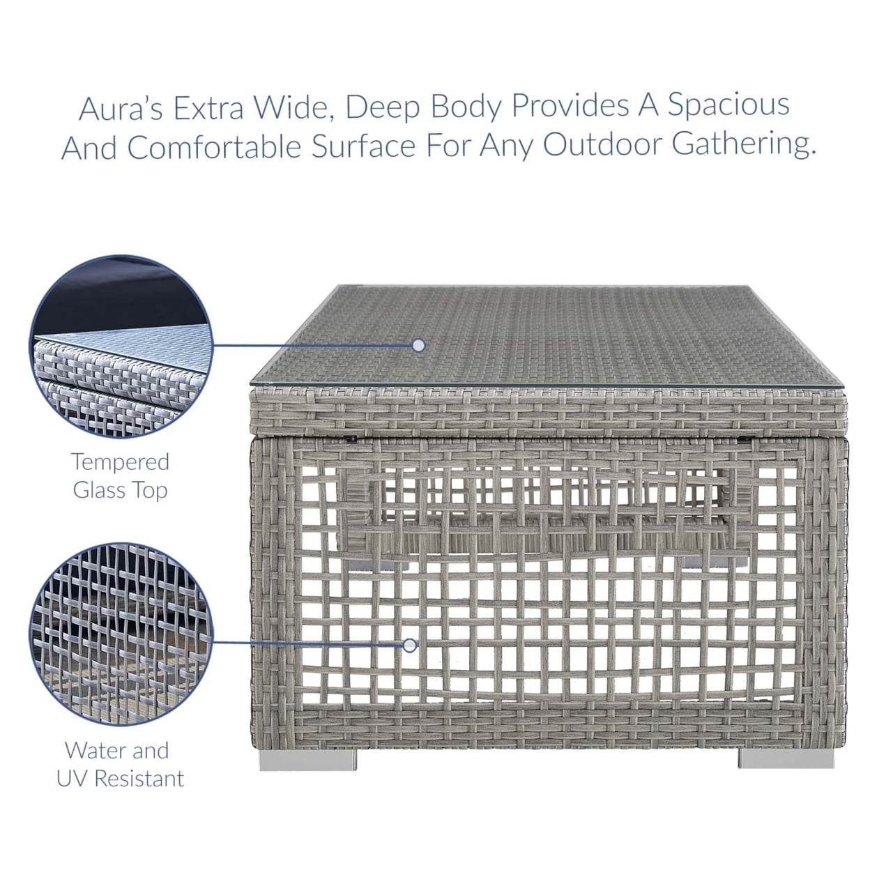 Weave conversational threads into a rollicking good time with Aura Outdoor Patio Coffee Table. Aura comes with a synthetic gray-on-gray tone wicker rattan weave and a powder-coated aluminum frame that delivers a softly versatile outdoor collection that shifts to meet the needs of the moment. Outfitted with tempered glass top, and designed with an extra wide and deep body, Aura will make your outdoor spot the focal point of good memories and festive gatherings while enhancing your patio, backyard or poolside arena. Featuring chrome plated anti-skid feet, enjoy spacious seating and enhanced comfort with this reliable piece of outdoor furniture. Features: Material: Rattan, aluminum, glass Finish: Gray Modern outdoor patio coffee table Gray synthetic pe wicker rattan Powder coated aluminum frame Water and UV resistant Chrome plated anti-skid feet Tempered glass top Specifications: Product Dimensions: 15.5″H x 47″W x 24″D Product Weight: 32 lbs