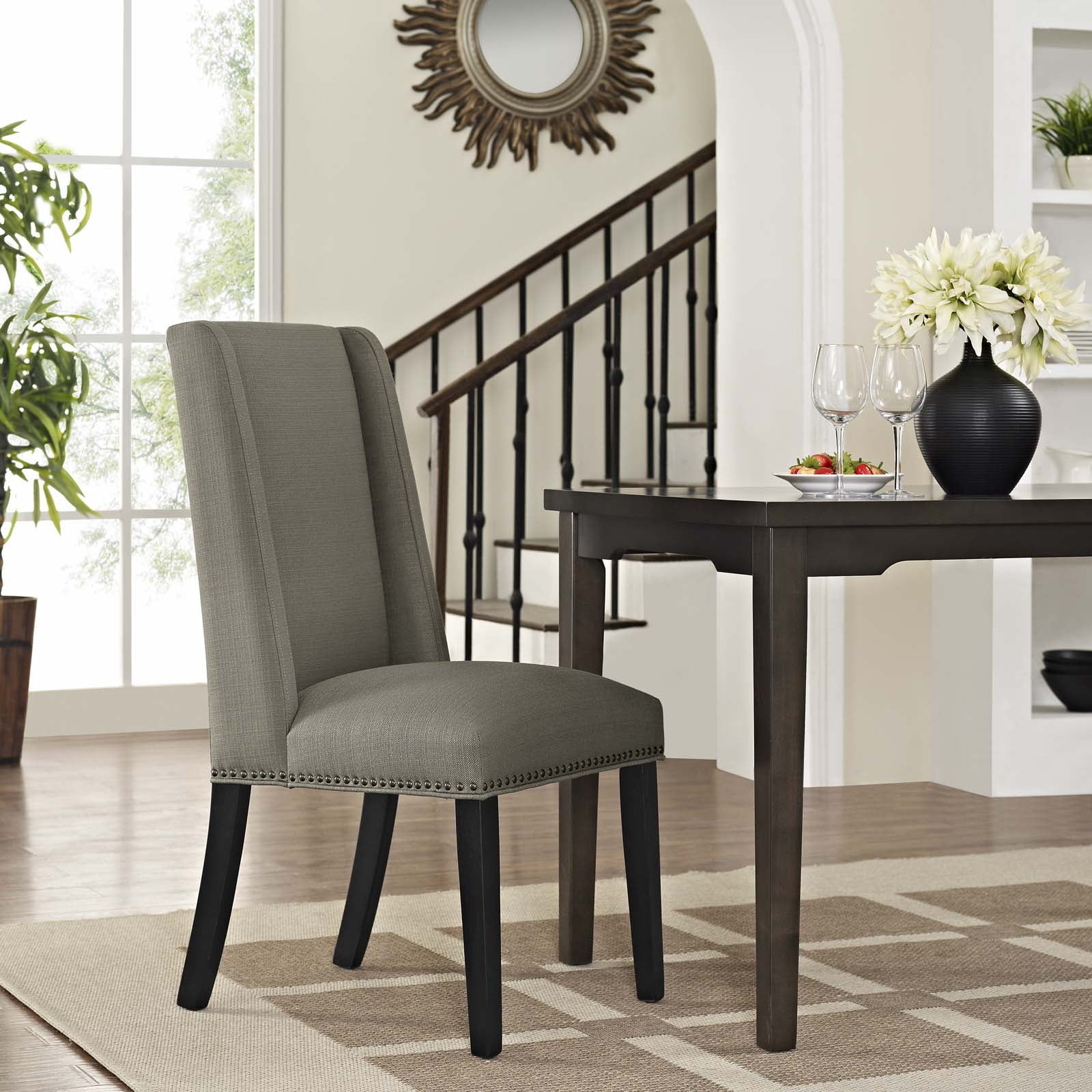 Explore the vast riches of a treasured heritage with the Baron Dining Chair. Designed to resonate elegance, this dining side chair features a charming back and polished nailhead trimmed seat with a dash of grace and noble appeal. Complete with dense foam padding, fine fabric upholstery, solid wood and MDF frame, and legs with non-marking foot glides, this updated Parsons chair is a stylish dining chair perfect for the dining room, living room, entryway, or home office. Weight Capacity: 500 lbs. Features: Includes: One – Baron Dining Chair Materials: Solid rubberwood, polyester fabric Finish: Light gray Dense foam padding Non-marking foot pins Specifications: Product Dimensions: 23.5″L x 19.5″W x 40″H Product Weight: 20 lbs Weight Capacity: (Chair) 500 lbs Seat Dimensions: 17″L x 19.5″W x 20.5″H Product Dimensions: (Backrest) 16.5″W x 20.5″H Product Dimensions: (Cushion Thickness) 6″H Product Dimensions: (Base) 22.5″L x 18.5″W x 14″H
