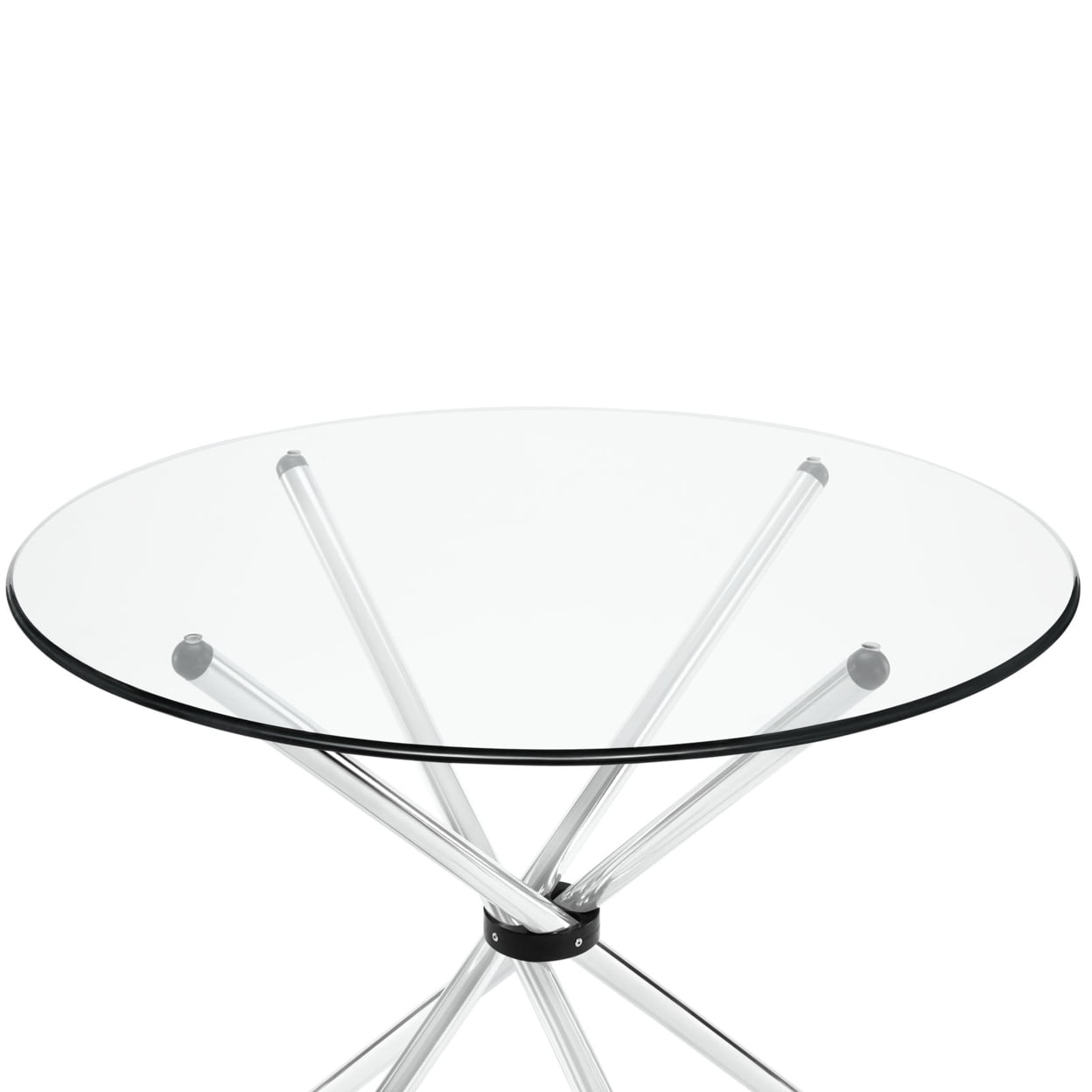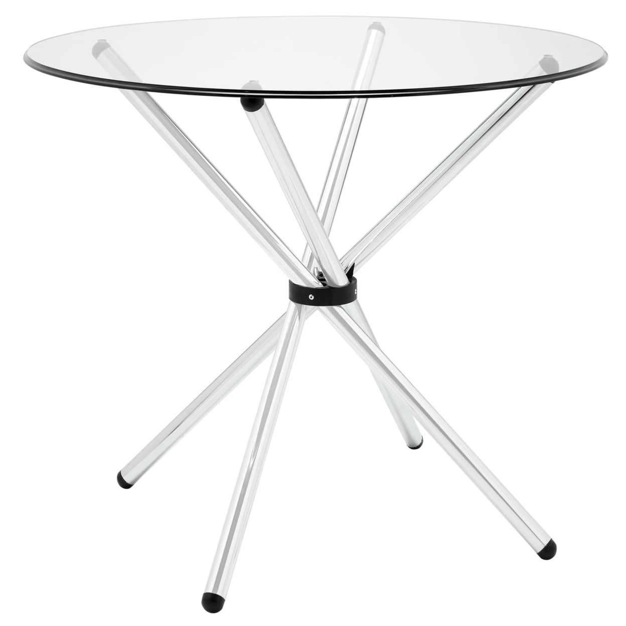 Clear Baton Dining Introduce an edgy style to your kitchen or dining room adventures with the Baton modern table. Topped with tempered glass and a gathered ?baton? base collect your own assemblages of family and friends as you welcome in the (peacefully) unexpected. The chrome plated tubular base comes capped to prevent scratching. Set Includes: One – Baton Dining Table Specifications: Dining Table Four ?baton? base Chrome plated steel