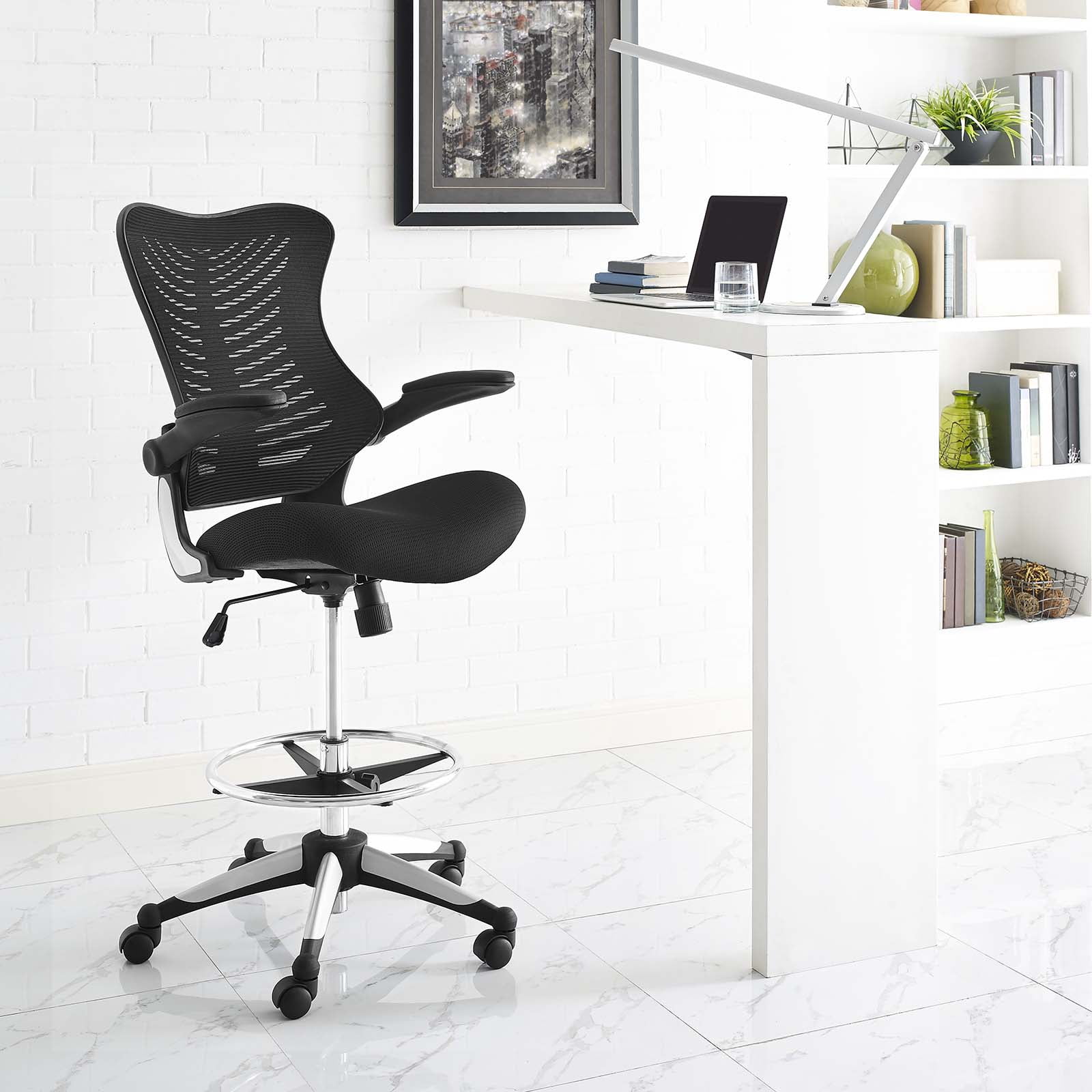Materials: Vinyl, nylon Finish: Black 90-degree flip-up padded arms Tall drafting chair Tall pneumatic gas cylinder Standing desk chair Sturdy steel footring Seat tilt tension control