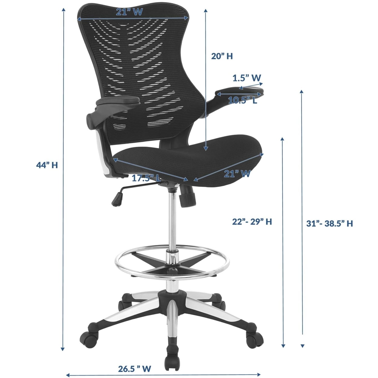 Energize your office with the Charge Drafting Stool. Charge features a distinctive butterfly form and ribbed design that delivers exceptional appeal and comprehensive ergonomics. Outfitted with a steel foot ring, extra tall gas cylinder, five dual-wheel casters, nylon frame with a two-tone base, padded vinyl armrests that easily rotate up 90 degrees, and a generously padded mesh seat, Charge is an esteemable drafting stool suitable for the complex needs of the modern office. Features: Materials: Vinyl, nylon Finish: Black 90-degree flip-up padded arms Tall drafting chair Tall pneumatic gas cylinder Standing desk chair Sturdy steel footring Seat tilt tension control Specifications: Product Dimensions: 44″H x 27.5″W x 26.5″D Product Weight: 37 lbs Weight Capacity: 264 lbs
