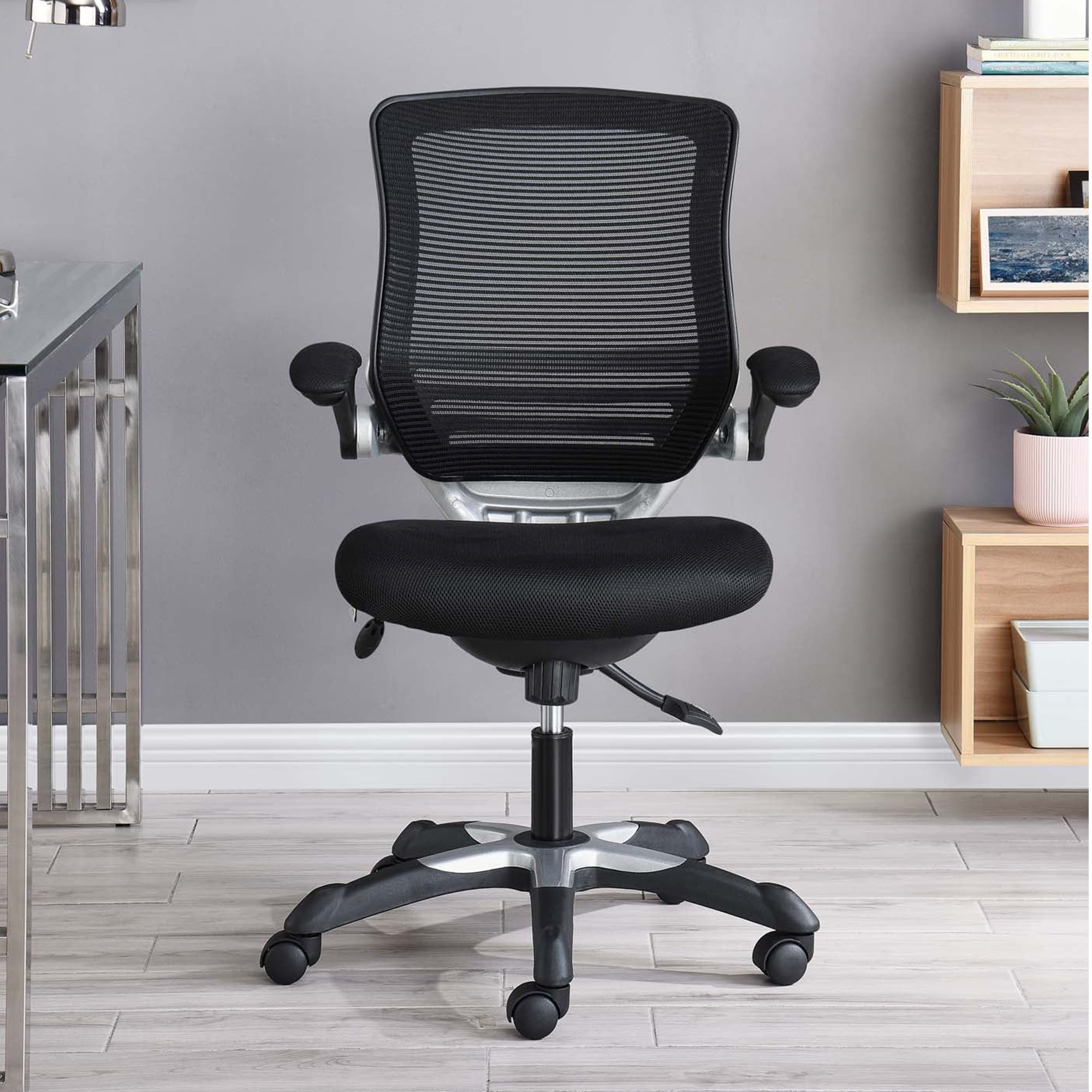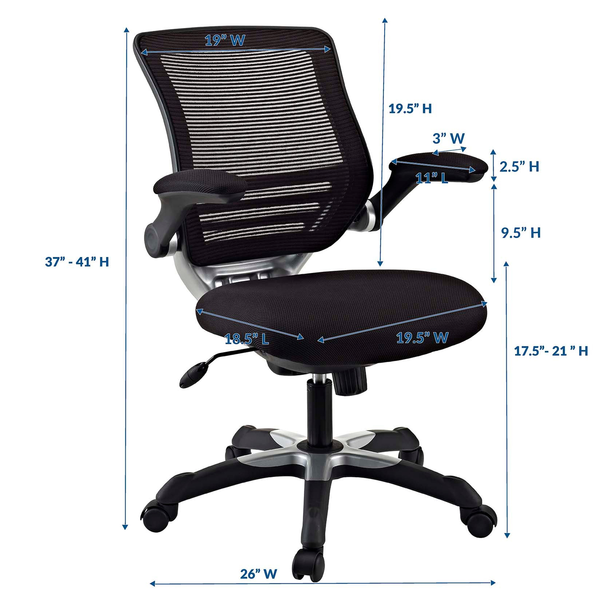 DURABLE OFFICE CHAIR – Featuring a sturdy two tone five-star nylon base with armrests that easily rotate up, Edge is a versatile modern desk chair that offers reliable support for everyday use. ERGONOMIC SUPPORT – Featuring a breathable mesh back, lower back lumbar support, and padded waterfall mesh seat, sit relaxed in a thoughtfully designed chair that adjusts according to your needs. OFFICE UPDATE – Refresh your office with a compelling seating choice that makes a sleek and stylish statement. Sitting atop five dual-wheeled casters, glide around any flooring surface with ease. SYNCHRONIZED TILT – Complete with synchro tilt and tension control that enables your feet to remain on the ground as you tilt backwards, Edge also features one-touch height adjustment. CHAIR MEASUREMENTS – Product Dimensions: 26″L x 26″W x 37 – 41″H; Armrest Dimensions: 10.5″L x 3″W x 2.5″H; Armrest Height from Seat: 9.5″H; Base Dimensions: 26″L x 26″W; Maximum Weight Capacity: 330 lbs.