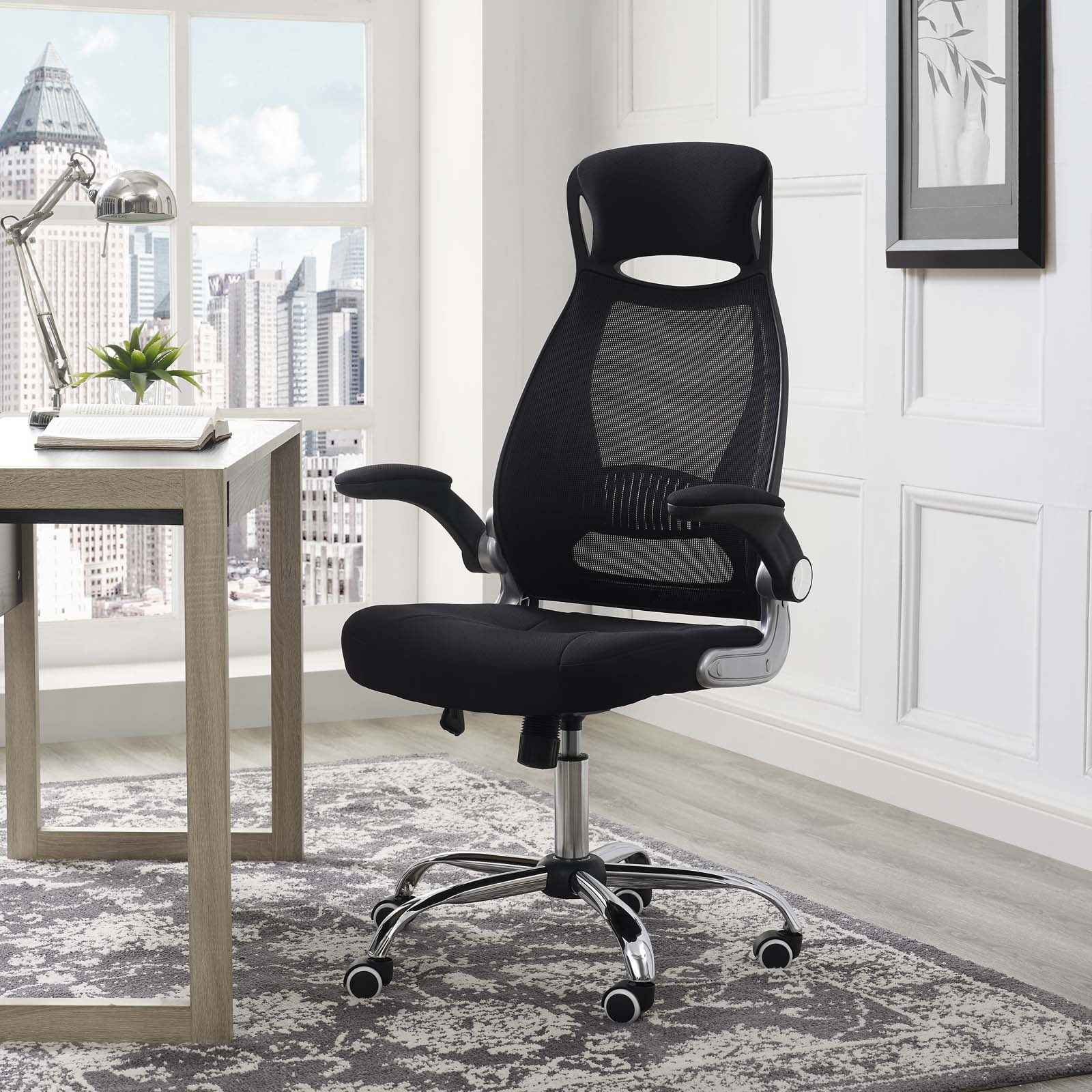 MODERN OFFICE UPDATE – Refresh your office with a comfortable seating choice that makes a sleek and stylish statement. Sitting atop five dual-wheeled casters, glide around any floor surface with ease ERGONOMIC SUPPORT – Featuring a breathable mesh back and headrest, lumbar support, and padded waterfall mesh seat, sit relaxed in a thoughtfully designed chair that adjusts according to your needs ADJUSTABLE OFFICE CHAIR – Outfitted with a sturdy five-star chrome base and durable nylon frame with flip-up armrests, Expedite is a versatile desk chair that offers reliable support for everyday use SYNCHRONIZED TILT – Complete with tilt-tension control, 360º swivel, and one-touch Height adjustment, Expedite is the preferred managerial chair for cubicles, computer desks, and home office spaces CHAIR MEASUREMENTS – Product Dimensions: 25.5″L x 24.5″W x 47-50.5″H; Armrest Dimensions: 24.5″W x 27.5″H; Base Dimensions: 25.5″L x 25.5″W; Maximum Weight Capacity: 331 lbs