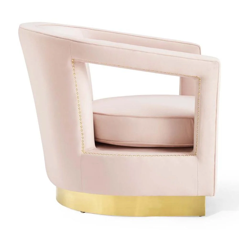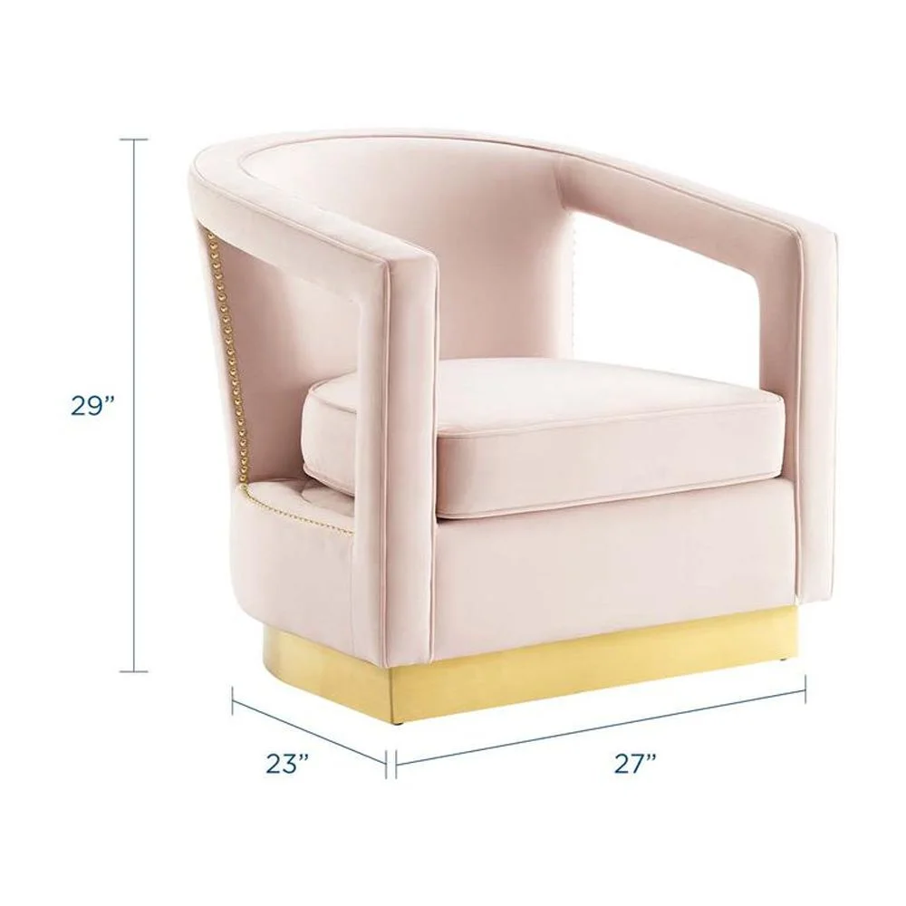 Revel in the vintage glamour of the Frolick Performance Velvet Upholstered Accent Lounge Armchair. The Frolick Living Room Chair comes with luxurious, stain-resistant performance velvet upholstery with a cutaway design and gold nailhead trim details. This elegant lounge chair has sweeping lines that flow into a recessed matte gold stainless steel base with non marking foot pads. The Frolick Accent Chair becomes a transformative focal point in your living room, lounge room, office, bedroom, or other seating area. Chair Weight Capacity: 300 lbs. Features: Materials: Performance velvet, stainless steel Finish: Pink, matte gold Stain resistant fabric Gold nailhead trim Non marking foot pads Specifications: Product Dimensions: 29″H x 32″W x 30.5″D Product Weight: 49 lbs Weight Capacity: (Chair) 300 lbs