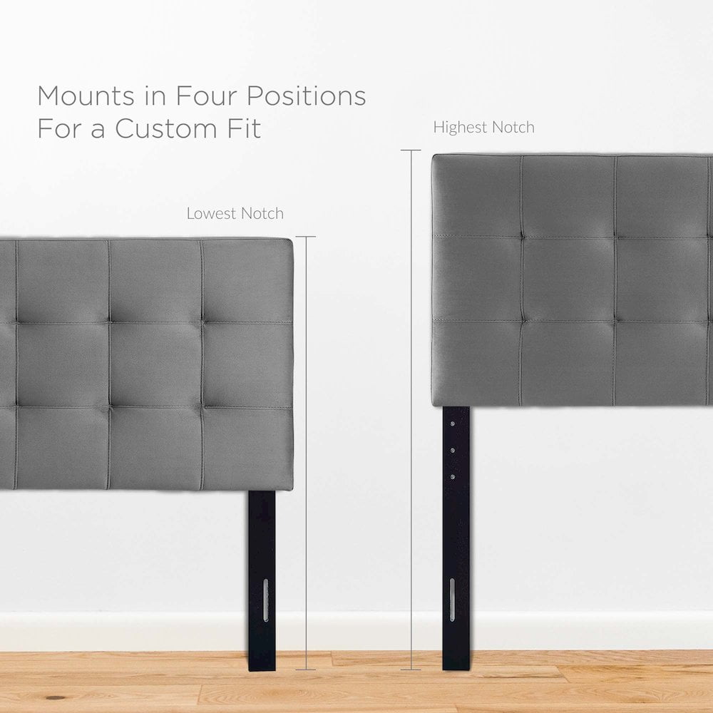 Instill classic elegance and modern luxury with the Lily Biscuit Tufted Performance Velvet Full Headboard. Lily features charming biscuit tufting for plush vintage glamour and timeless appeal. An elegant centerpiece to a teen’s bedroom, guest room, or dorm, this upholstered velvet headboard for full bed frames provides a soft, stain-resistant update for premium comfort while relaxing, reading, or conversing in bed. Solidly constructed from plywood and fiberboard with dense foam padding, this full-size velvet headboard comes with five mounting positions that are height adjustable from 45″ – 52.5″. Features: Materials: Velvet polyester fabric Finish: Gray Durable stain-resistant fabric Elegant biscuit tufting Height adjustable from 45″ – 52.5″ Dense foam padding Specifications: Product Dimensions: 22.5″H x 56″W x 3.5″D Product Weight: 21 lbs