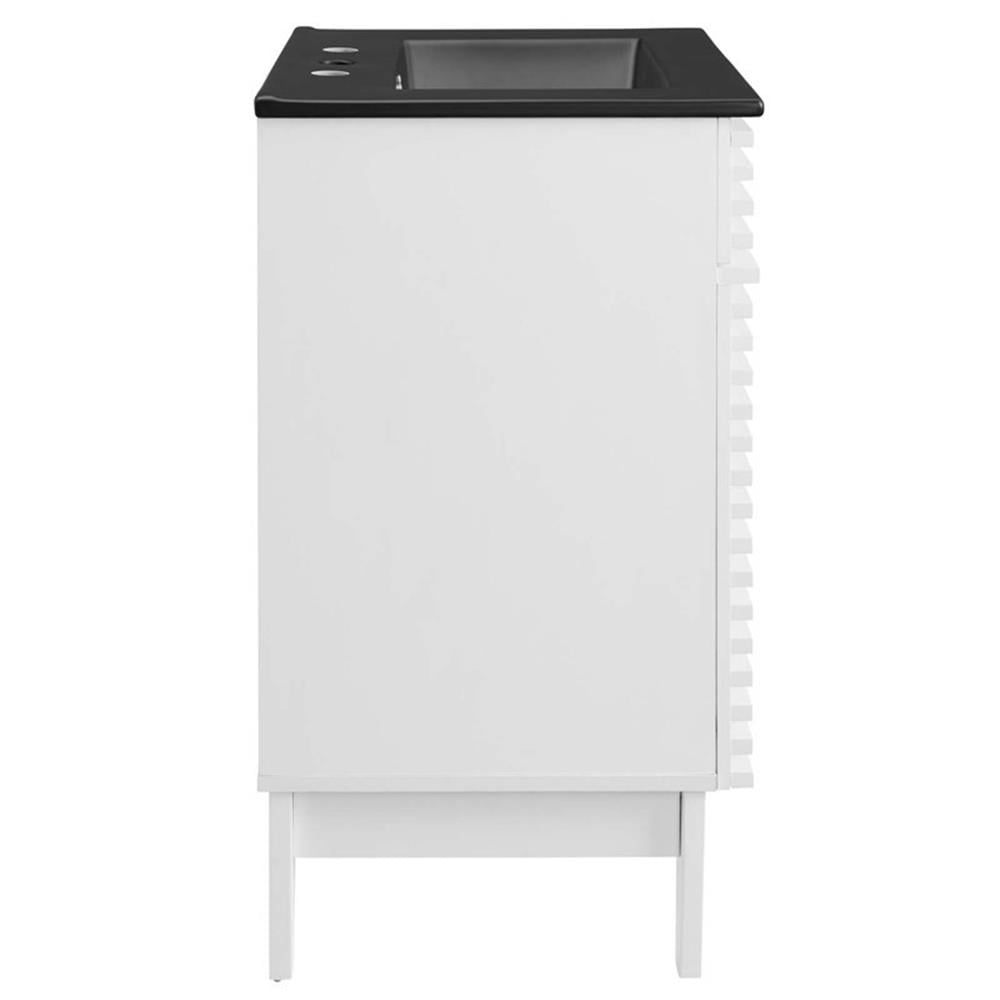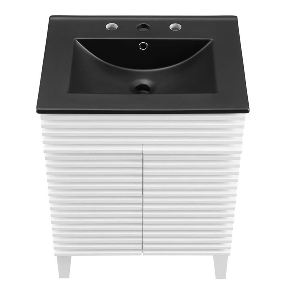 Tap into mid-century aesthetics with the Render Vanity. Render Bathroom Vanity features a durable particleboard frame with smooth laminate, four tapered wood legs, and adjustable storage shelf behind two soft-close hinged doors. A curved ceramic basin and integrated countertop with three faucet holes create sleek lines and crisp design for an edgy style designed to meet your needs. Boasting a mid-century modern style this vanity features a solid construction with a pleasing look and practical functionality. 8″ centerset faucet holes. Assembly required and fixtures not included. Features: Material: Wood (particleboard), ceramic Finish: White, black Mid-century modern style Adjustable storage shelf Dual soft-close doors 8″ centerset holes Integrated countertop Particleboard and laminate construction Specifications: Product Dimensions: 33.5″H x 24″W x 18.5″D Product Weight: 78 lbs