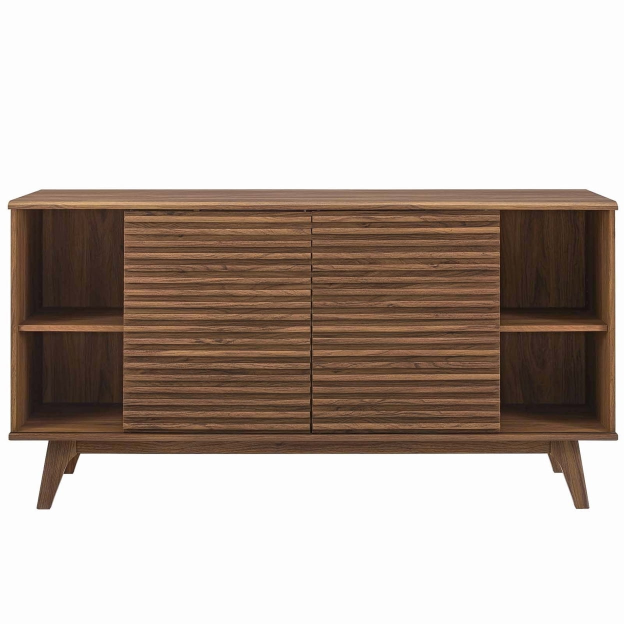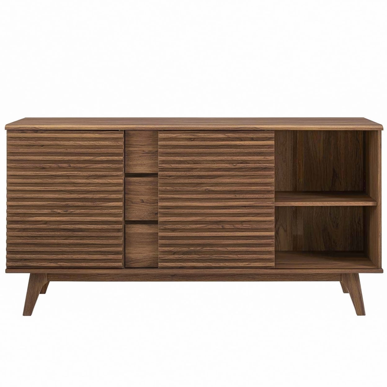 Tap into mid-century aesthetics with the Render Sideboard Buffet Display Stand. This dining room buffet table features a durable particleboard frame with smooth walnut grain laminate, four tapered wood legs, an adjustable shelf on both sides, three center full-extension glide drawers, and two sliding doors for easy access to shelf storage. Render features an abundance of storage for your silverware, dishes, and other dining room finery. Boasting a mid-century modern style this accent table features a solid construction with a pleasing look and practical functionality. Perfect as a sideboard, credenza, storing and serving buffet table, and display stand, Transmit also accommodates flat-screen TVs up to 70” wide as a living room or lounge area TV stand. Features: Material: Wood Finish: Walnut Sideboard buffet display stand Modern tv stand for tvs up to 70″ Smooth wood grain laminate Durable particleboard construction Three full-extension drawers Adjustable shelves on both sides Tapered wood legs Specifications: Product Dimensions: 32.5″H x 63″W x 17.5″D Product Weight: 105 lbs
