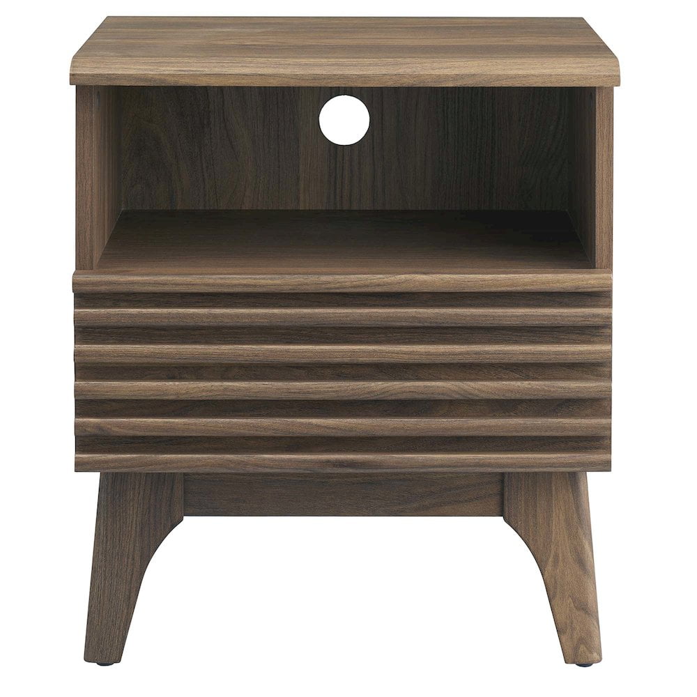Tap into mid-century aesthetics with the Render Nightstand. With dual usage as an end table in the living room, this nightstand features a durable particleboard frame with a smooth wood grain laminate, four tapered wood legs, open storage area with cable management hole, and a full-extension glide drawer. Boasting a mid-century modern style this accent table features a solid construction with a pleasing look and practical functionality that’s perfect for the bedroom. The full-extension drawer offers ample storage space to keep your bedside essentials neat and organized. Features: Materials: Particleboard Finish: Walnut Full-extension glide drawer Tapered wood legs Specifications: Product Dimensions: 21″H x 19″W x 15″D Product Weight: 27 lbs