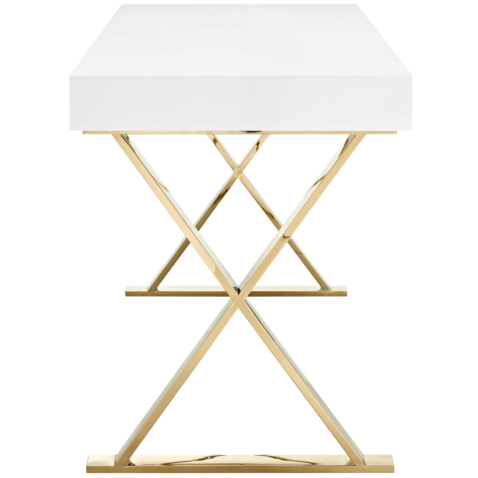 Modern office desk Stainless steel frame Durable Fiberboard Construction Overall Product Dimensions: 47″L x 23.5″W x 30″H Inner Drawer Dimensions: 12.5″L x 16.5″W x 2.5″H Floor to Underneath Drawer: 26″H Space Between Desk Legs: 39.5″W Product Materials: White – .5 inch MDF high gloss for the surface and all inside of the drawer is white melamine, Walnut – .5 inch MDF with walnut veneer for surface but it is paper for the drawer inside, stainless steel frame